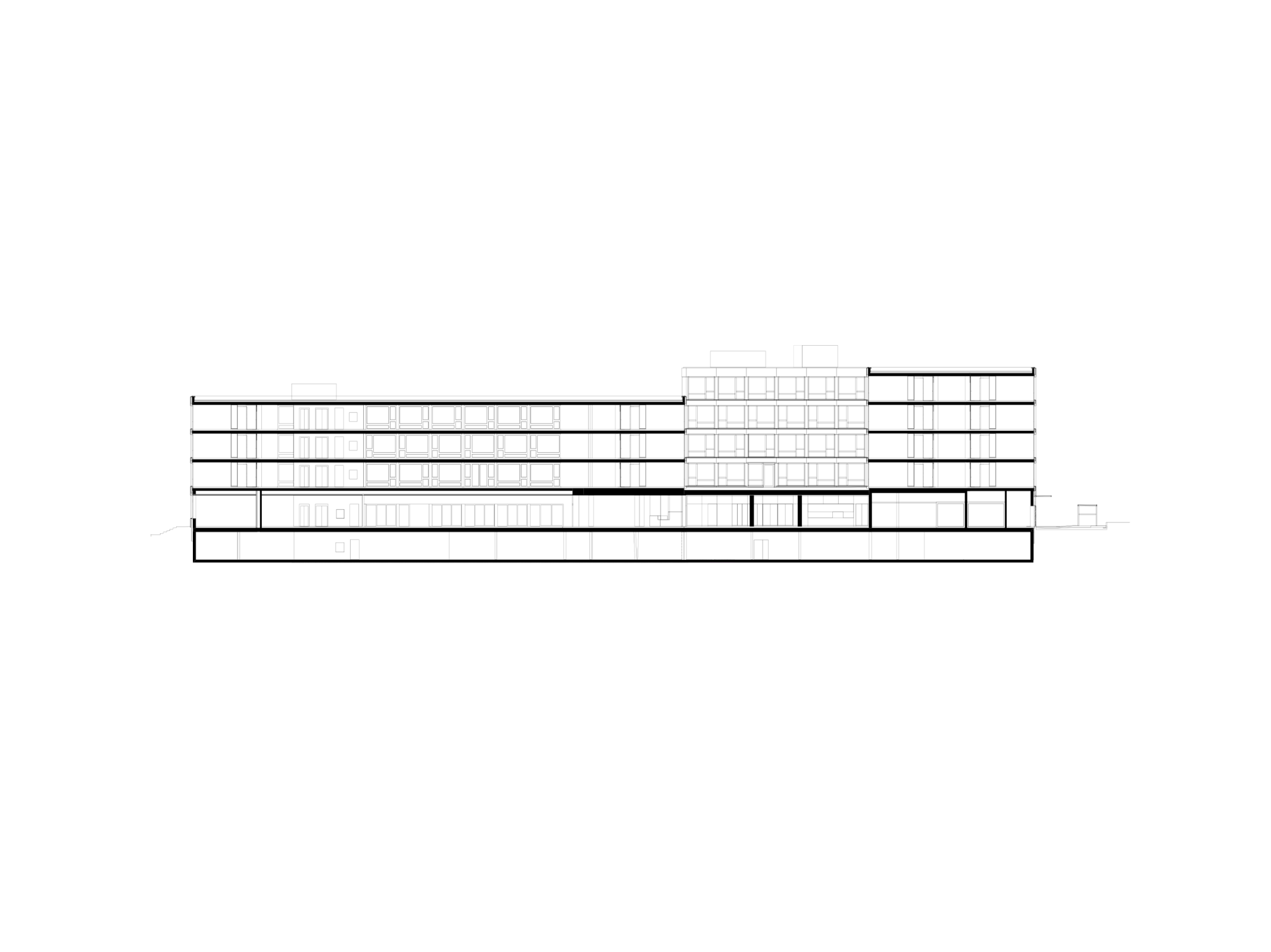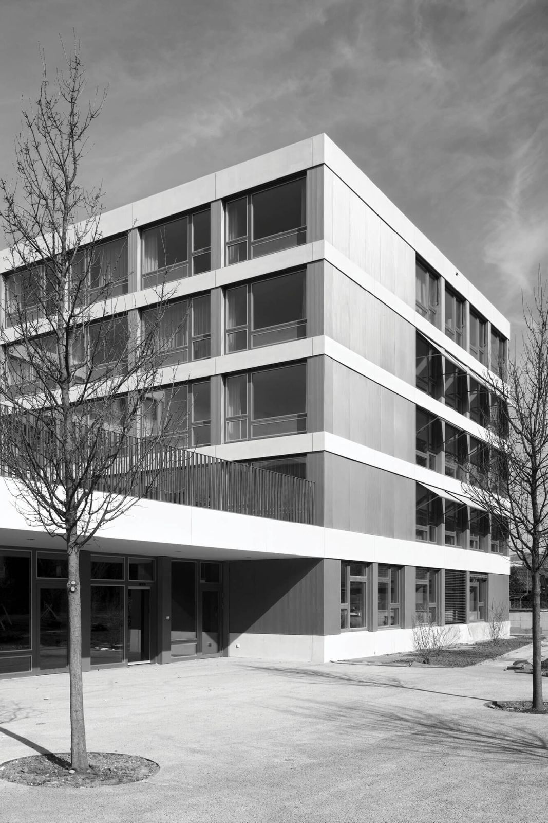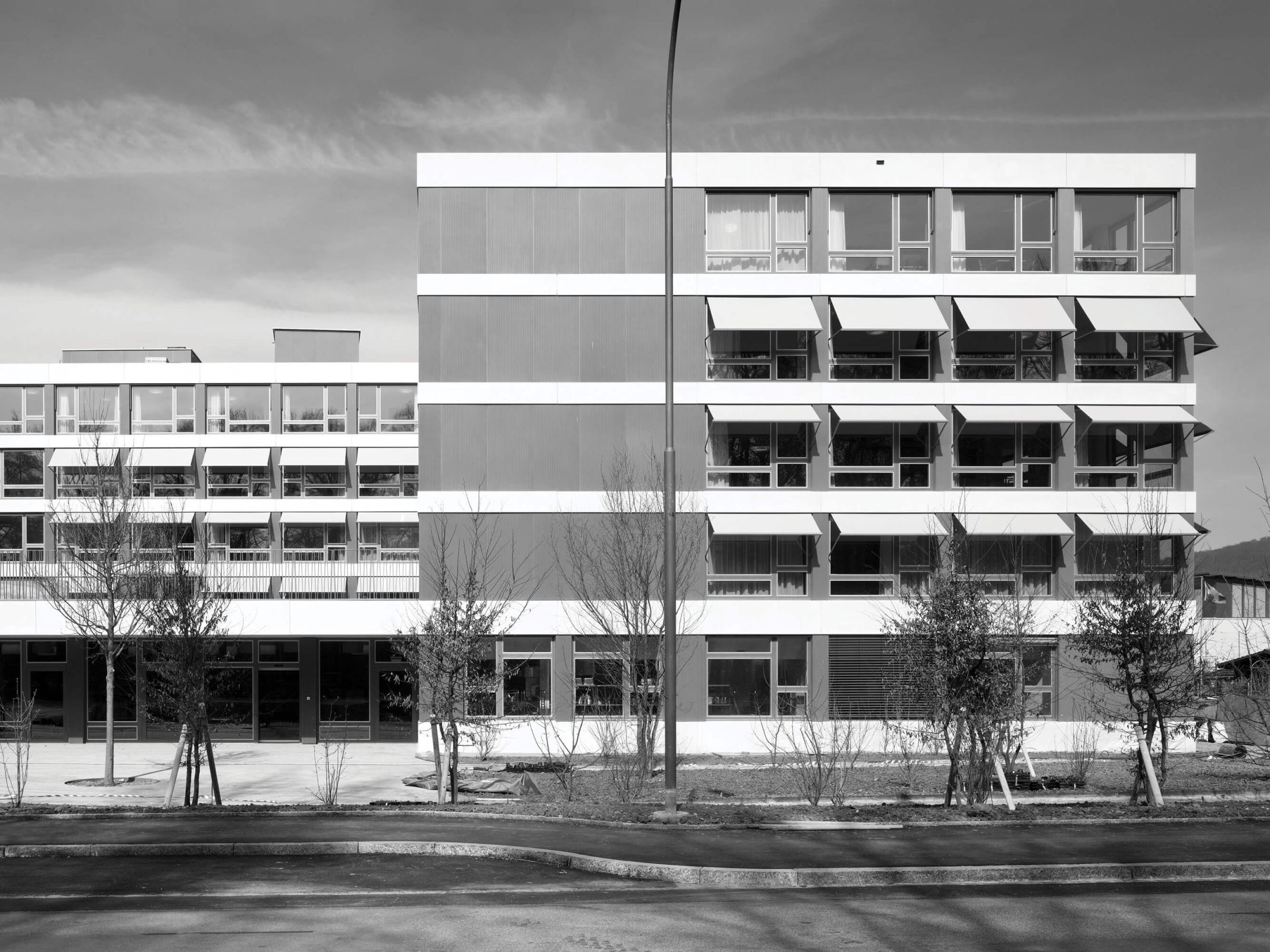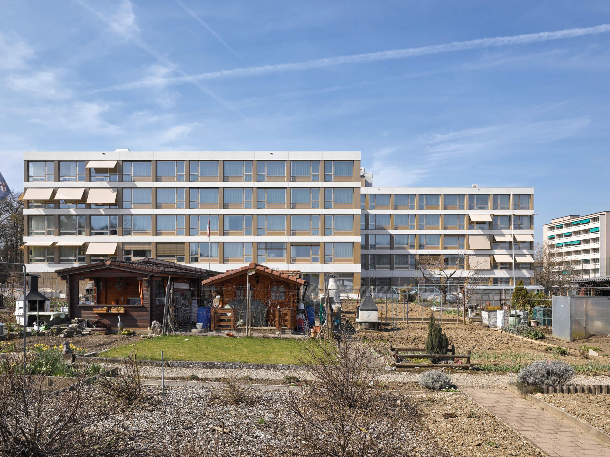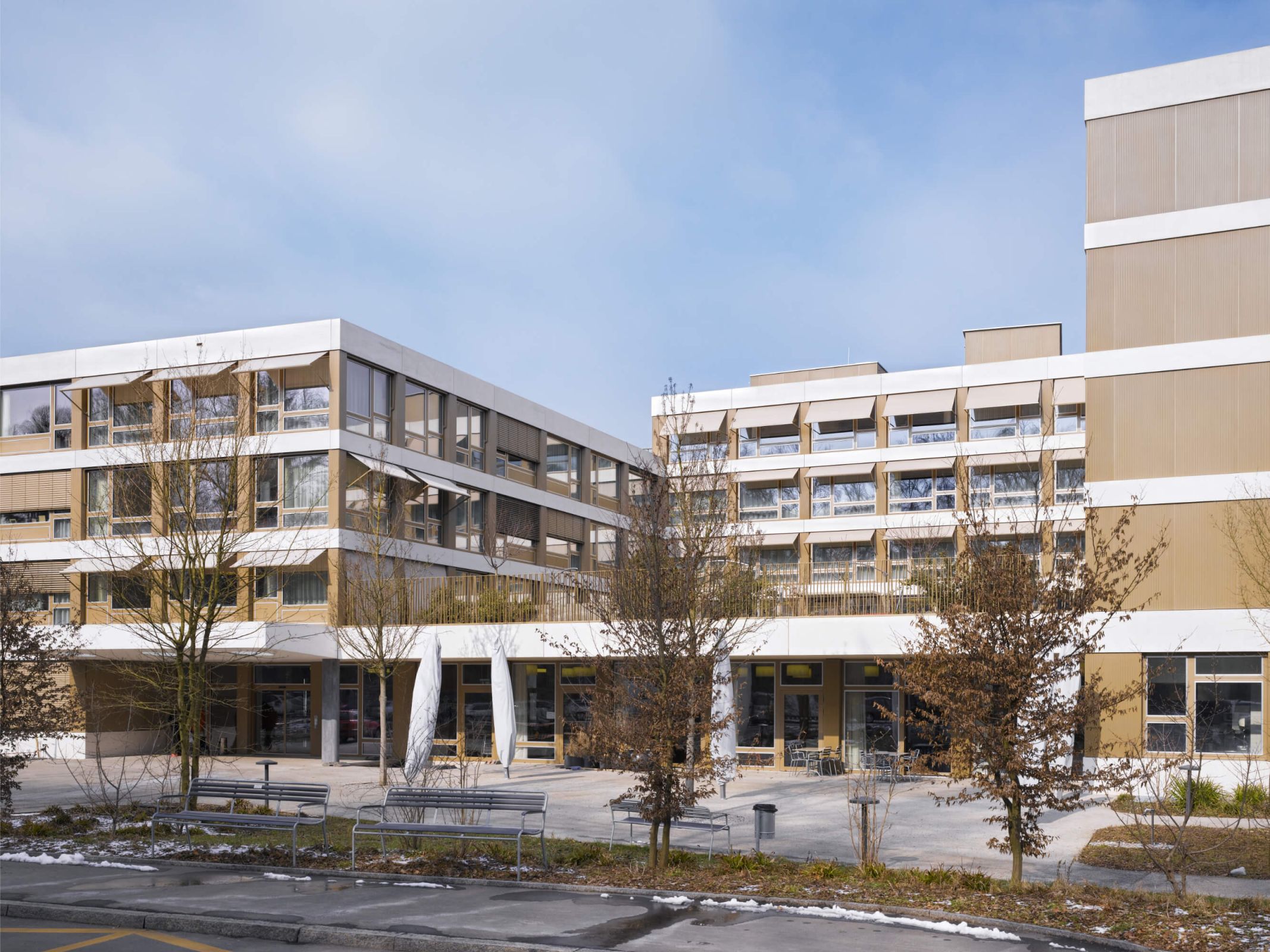 Der vier- bis fünfgeschossige Baukörper vermittelt zwischen den heterogenen Elementen seiner Umgebung, den Wohntürmen, Familiengärten und dem Wald. Das Altersheim markiert Präsenz mit seiner horizontalen Ausdehnung, die von der klar strukturierten Fassade noch betont wird. Umlaufende Bänder aus hellen Glasfaserbeton-Elementen bilden die Deckenstirnen ab und folgen der verwinkelten Figur. Dazwischen reihen sich die dunklen Flächen der Fenster der einzelnen Zimmer aneinander. Gewelltes Blech von gleicher Farbe verkleidet die geschlossenen Fassadenabschnitte und spielt mit dem einfallenden Licht.