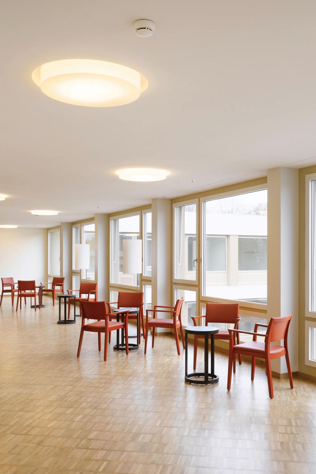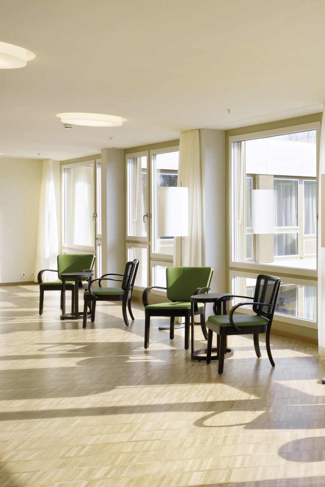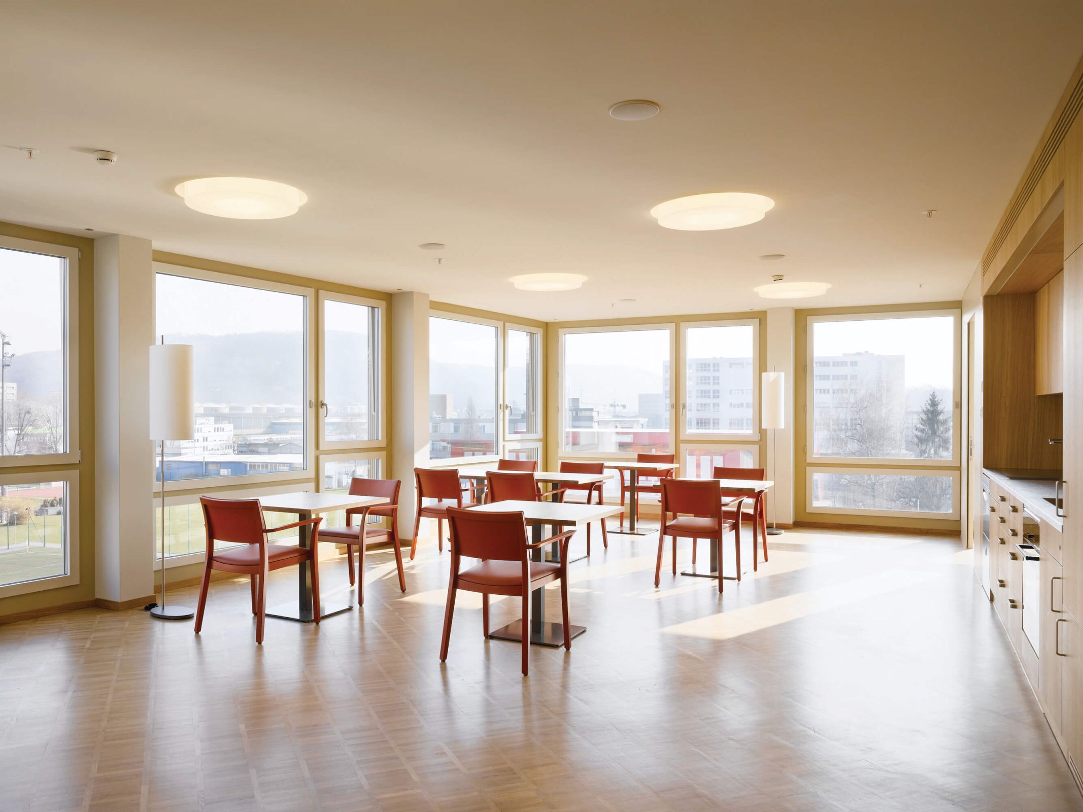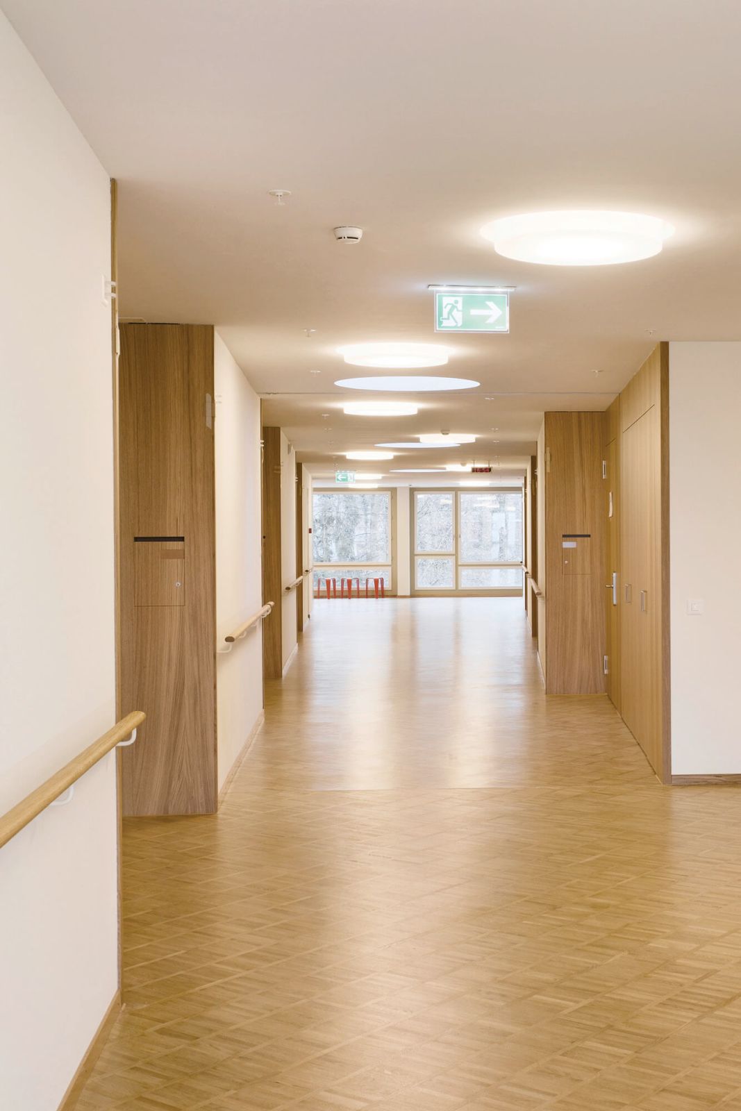 Quer durch das Gebäude erstreckt sich die Eingangshalle. Daran angrenzend befinden sich die Räume der öffentlichen Nutzungen wie Restaurant und Saal. Im Erdgeschoss sind auch die Pflegeeinrichtungen und Personalräume angeordnet. Darüber bilden die s-förmig angelegten Obergeschosse zwei Höfe. Diese dienen der Demenzabteilung nebst der Belichtung der Zimmer als Aufenthalts- und Bewegungsgärten im Freien. Die Korridore sind als grosszügige, vielseitig nutzbare Räume gestaltet. Einmal endet der Erschliessungsraum in einer privaten Sitznische vor einem Zimmer, ein anderes Mal führt er zum Ess-und Aufenthaltsbereich einer Wohngruppe. Entlang der Fassade laden Sitzgruppen zum Verweilen ein, bevor sich der Raum wieder so weit ausdehnt, dass er einer kleinen Veranstaltung Platz bieten kann. Die beiden Hofsituationen schaffen Sichtbezüge und erleichtern die Orientierung.