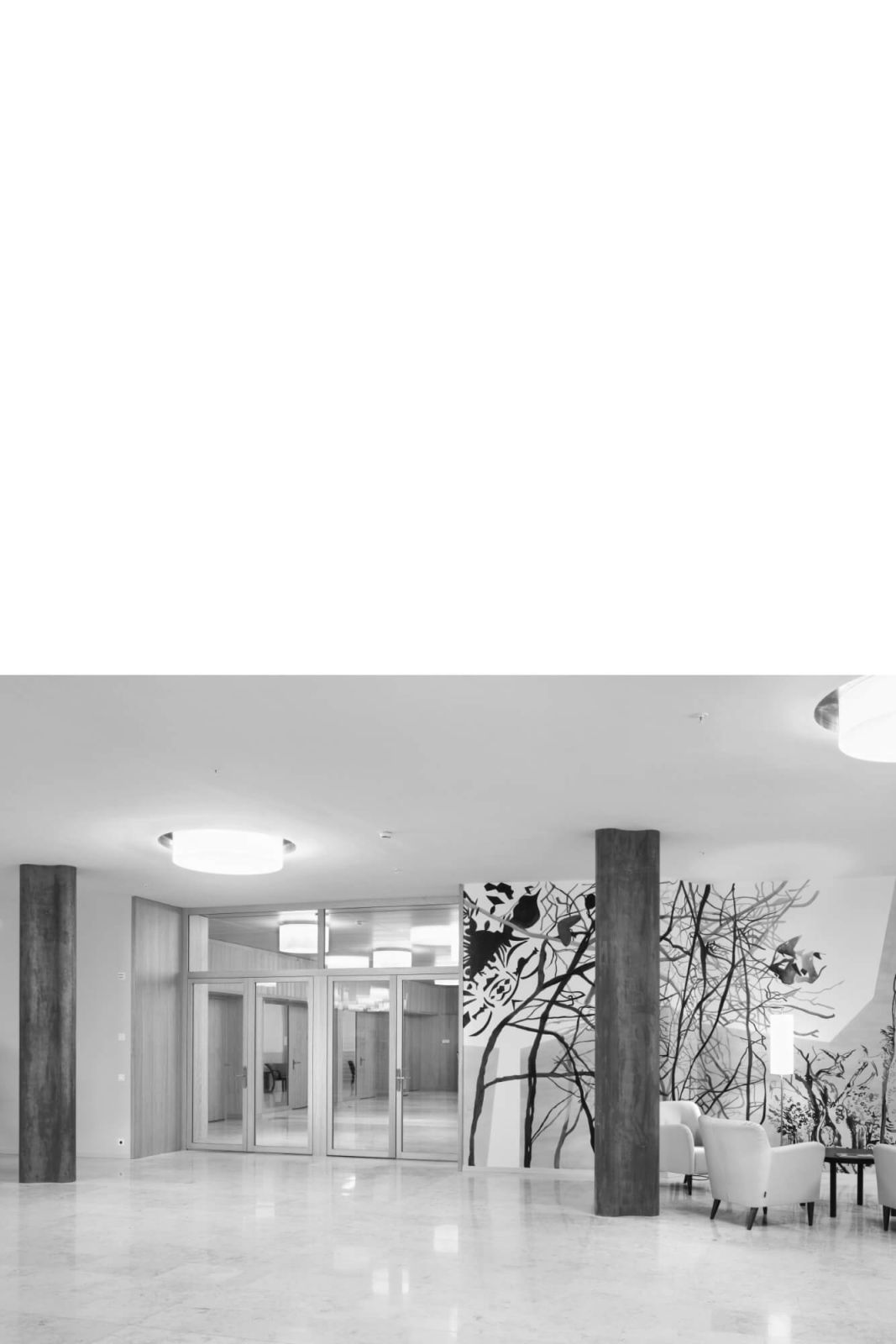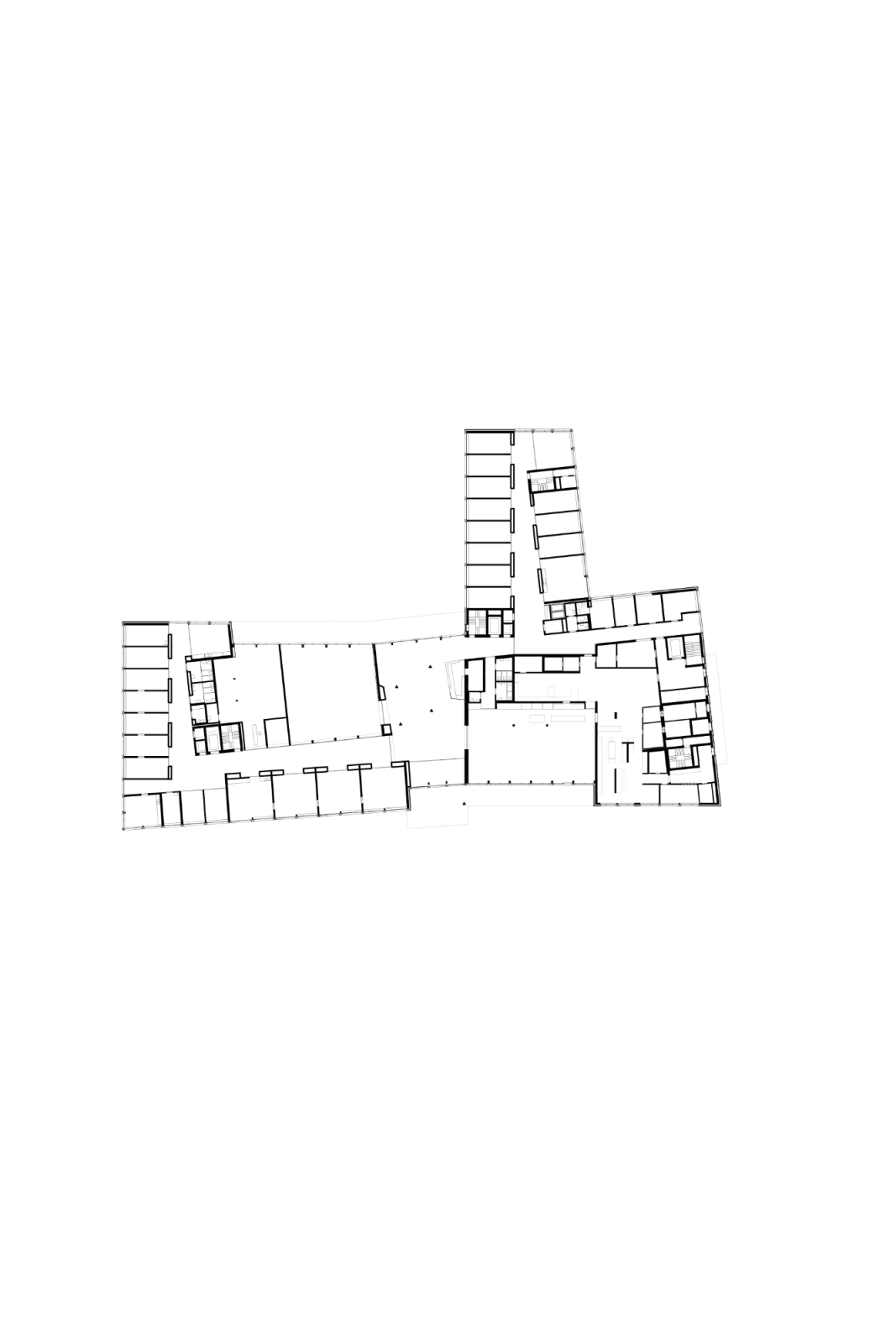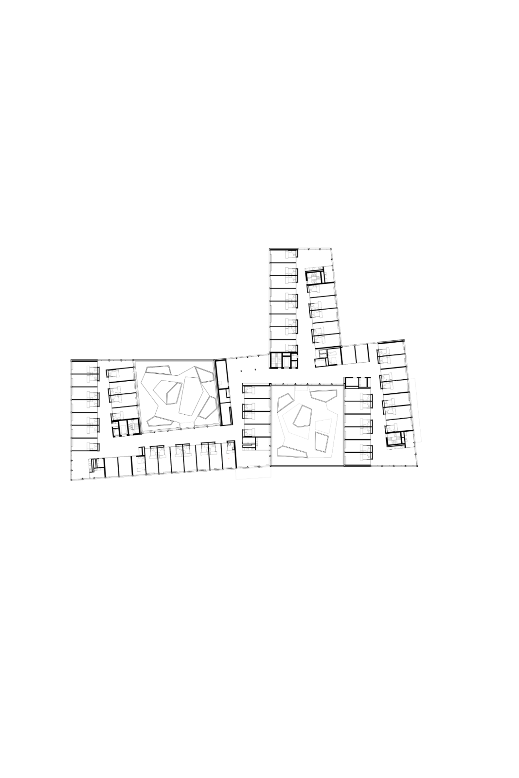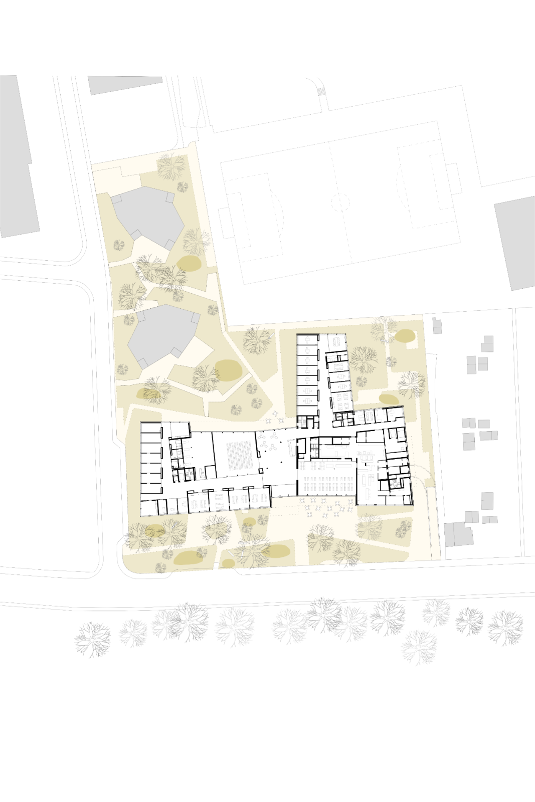 Quer durch das Gebäude erstreckt sich die Eingangshalle. Daran angrenzend befinden sich die Räume der öffentlichen Nutzungen wie Restaurant und Saal. Im Erdgeschoss sind auch die Pflegeeinrichtungen und Personalräume angeordnet. Darüber bilden die s-förmig angelegten Obergeschosse zwei Höfe. Diese dienen der Demenzabteilung nebst der Belichtung der Zimmer als Aufenthalts- und Bewegungsgärten im Freien. Die Korridore sind als grosszügige, vielseitig nutzbare Räume gestaltet. Einmal endet der Erschliessungsraum in einer privaten Sitznische vor einem Zimmer, ein anderes Mal führt er zum Ess-und Aufenthaltsbereich einer Wohngruppe. Entlang der Fassade laden Sitzgruppen zum Verweilen ein, bevor sich der Raum wieder so weit ausdehnt, dass er einer kleinen Veranstaltung Platz bieten kann. Die beiden Hofsituationen schaffen Sichtbezüge und erleichtern die Orientierung.