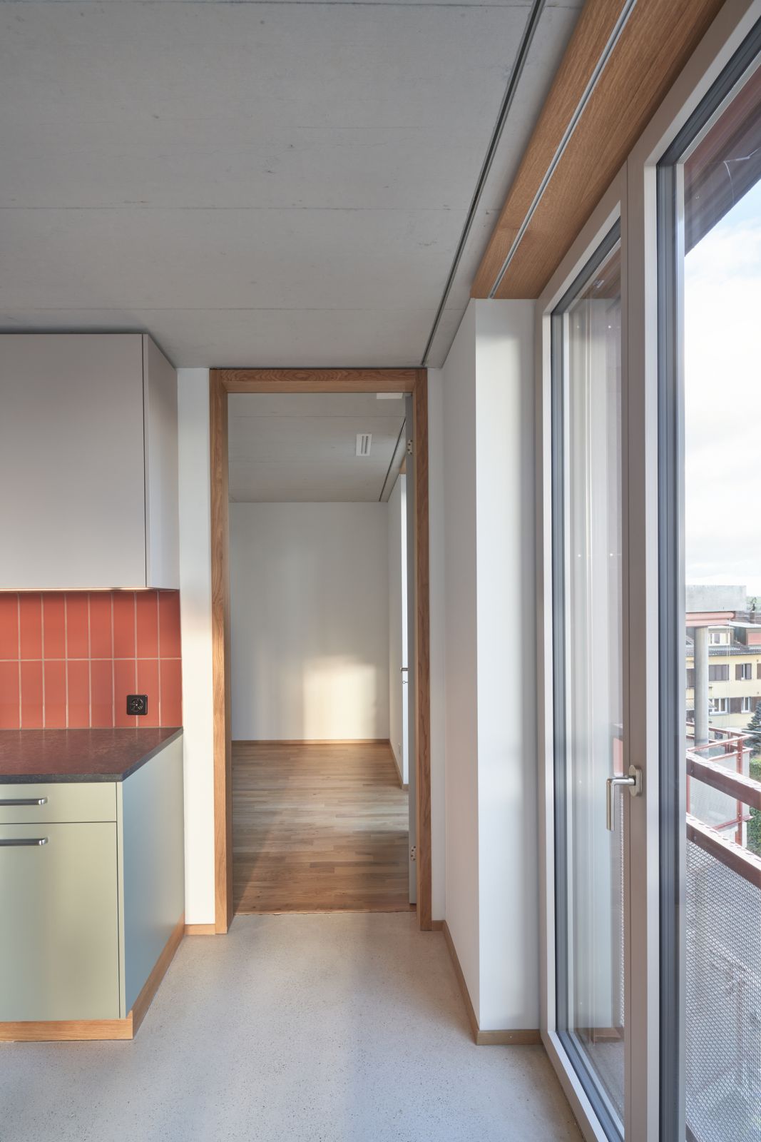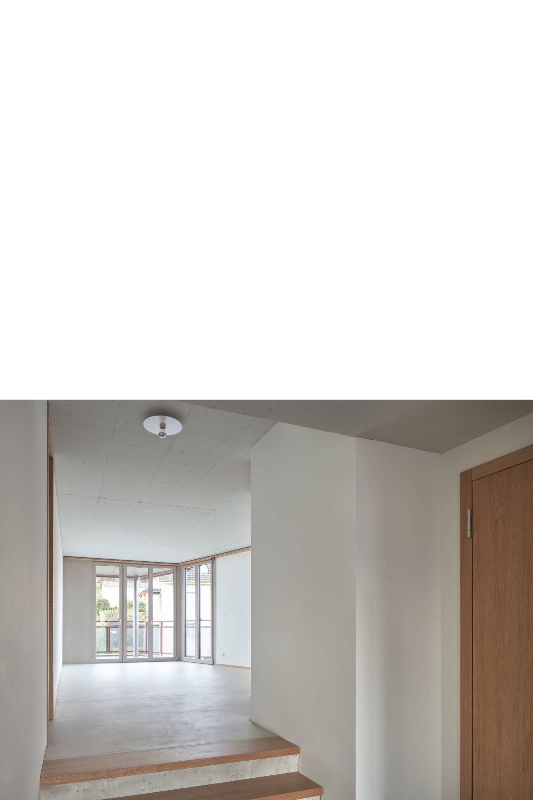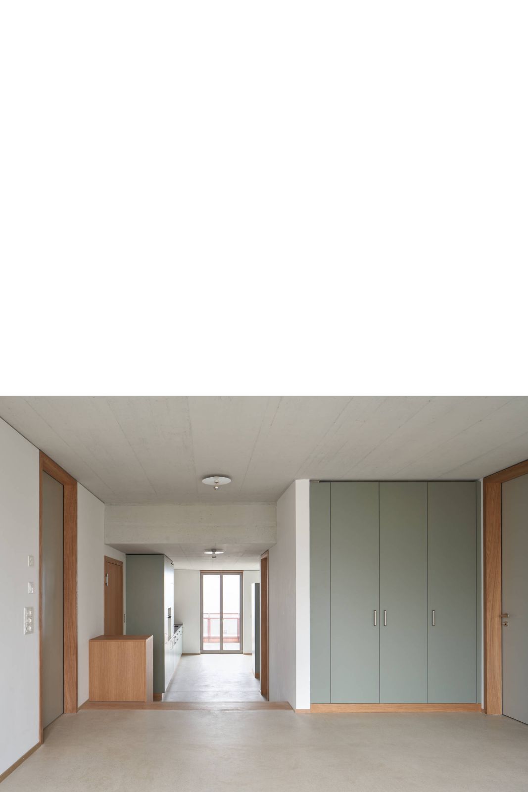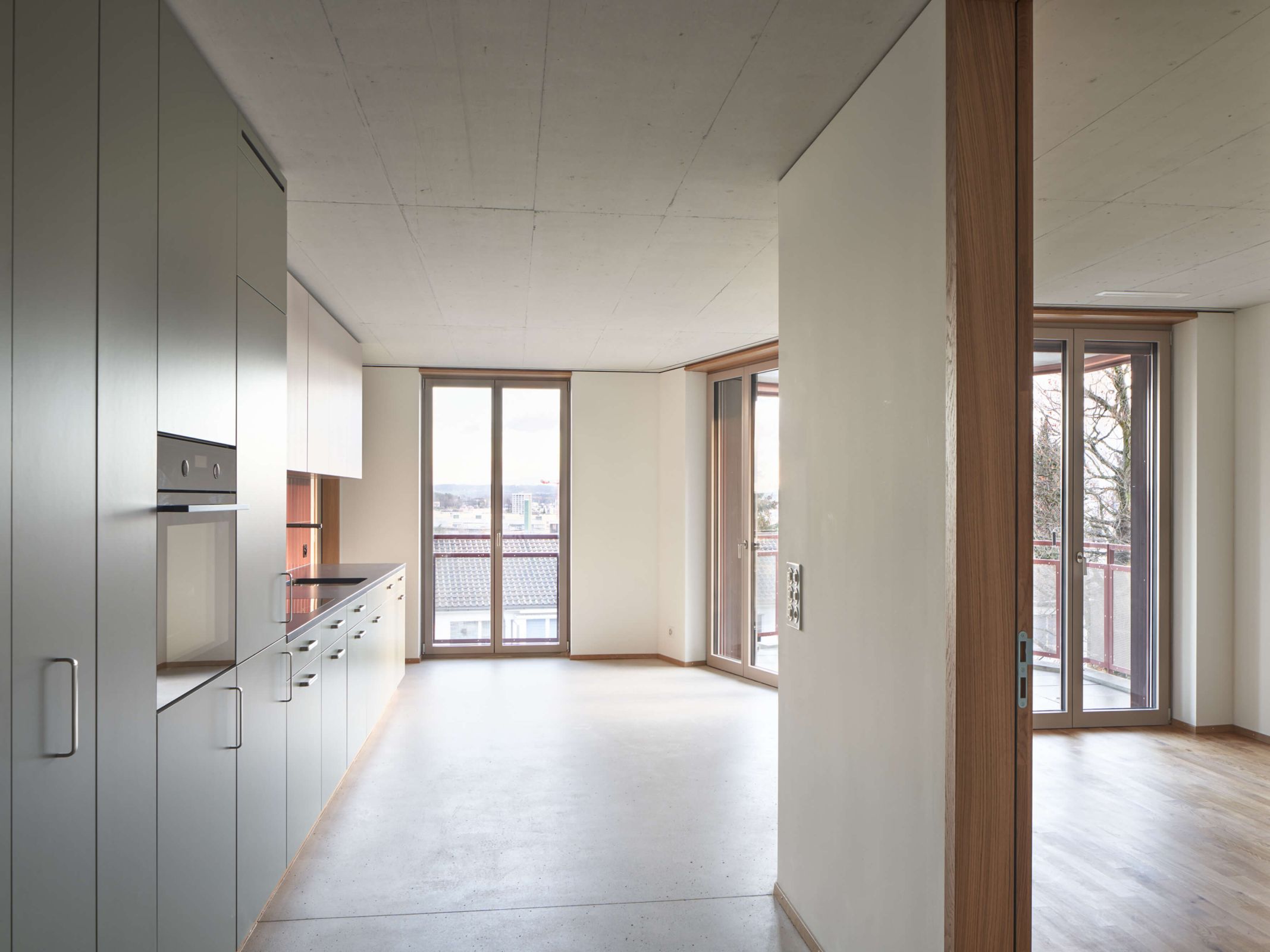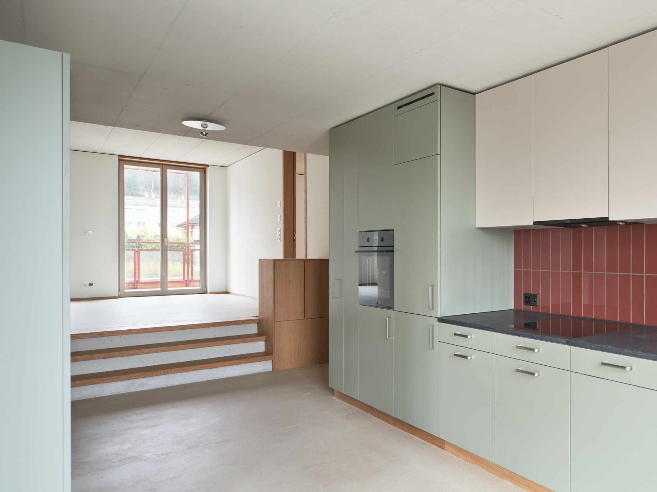 Im Neubau werden 24 Wohneinheiten realisiert, in Wohnungsgrössen von 2.5- bis 5.5-Zimmern. Dabei sind zwei Wohnungstypen vorherrschend: Die mittig platzierten Wohnungen profitieren von einem langgestreckten Raum in Ost-Westrichtung. Dabei wird der Küchen- und Wohnbereich maximal aufgespannt und es entstehen eine aktive Mitte und ruhige Pole. Der Einbezug des Hanggefälles wird mit einem leichten Niveauunterschied in der Wohnungsmitte umgesetzt. Die kompakteren Eckwohnungen profitieren besonders von der Staffelung des Baukörpers, woraus sich längere Besonnungsdauer und diagonale Blickachsen ergeben. Die Grundrisse weisen klar abgetrennte Wohn- und Essbereiche auf, so dass die Wohnstuben auch flexibel als Spiel- oder Arbeitsbereiche genutzt werden können.