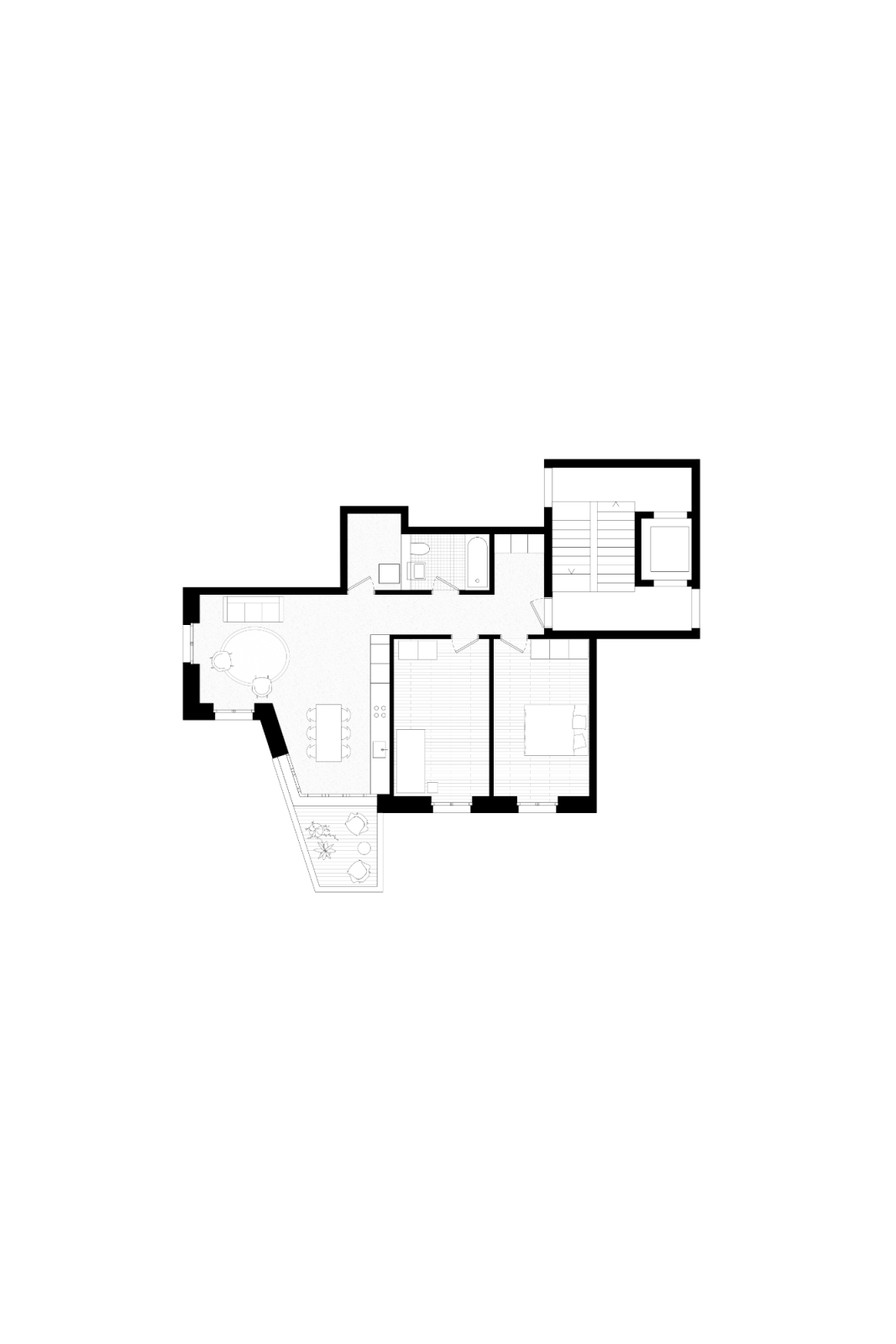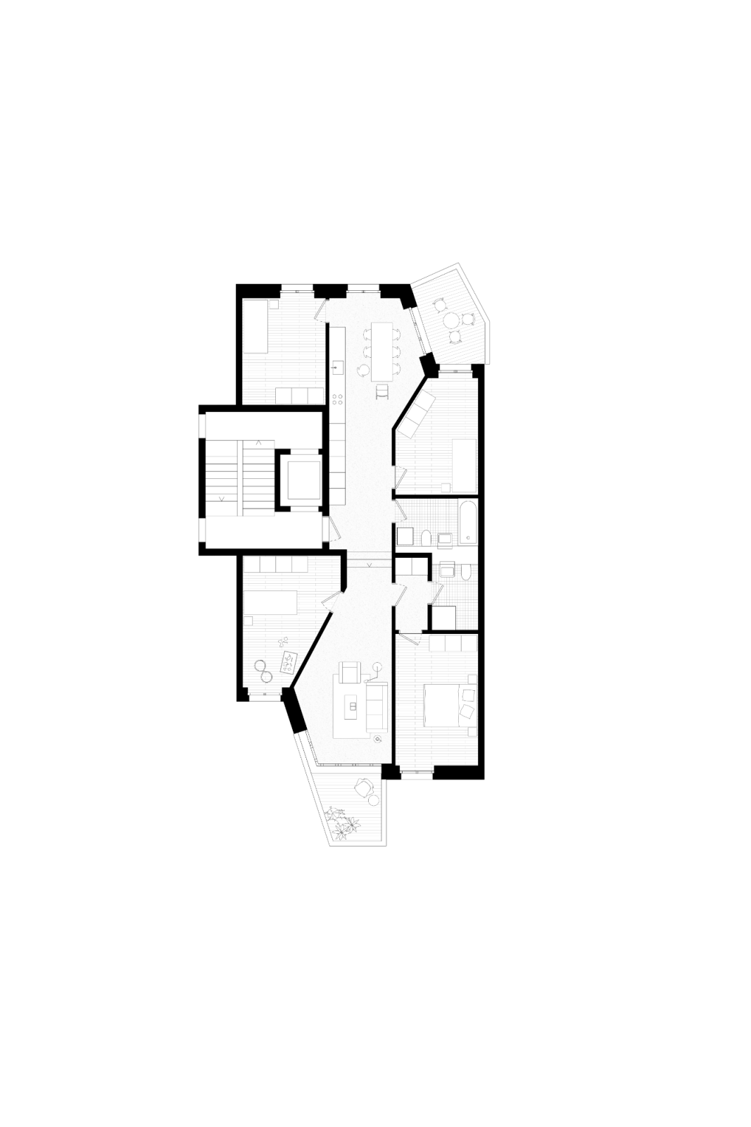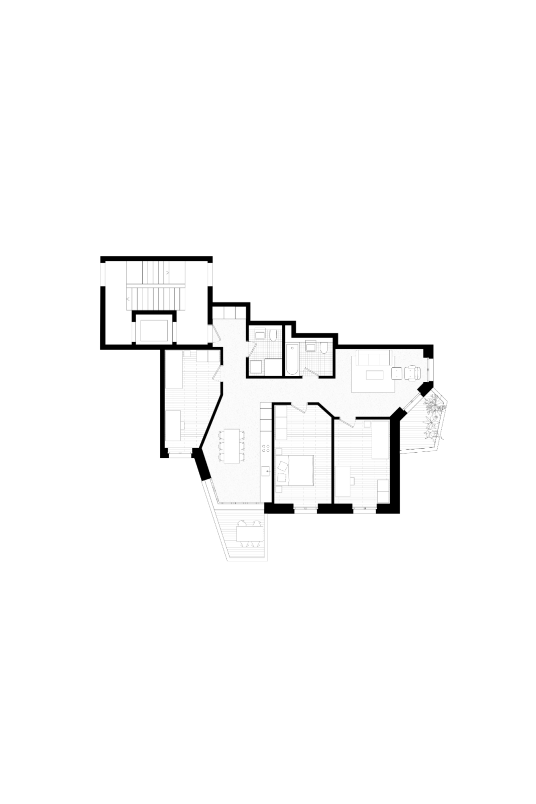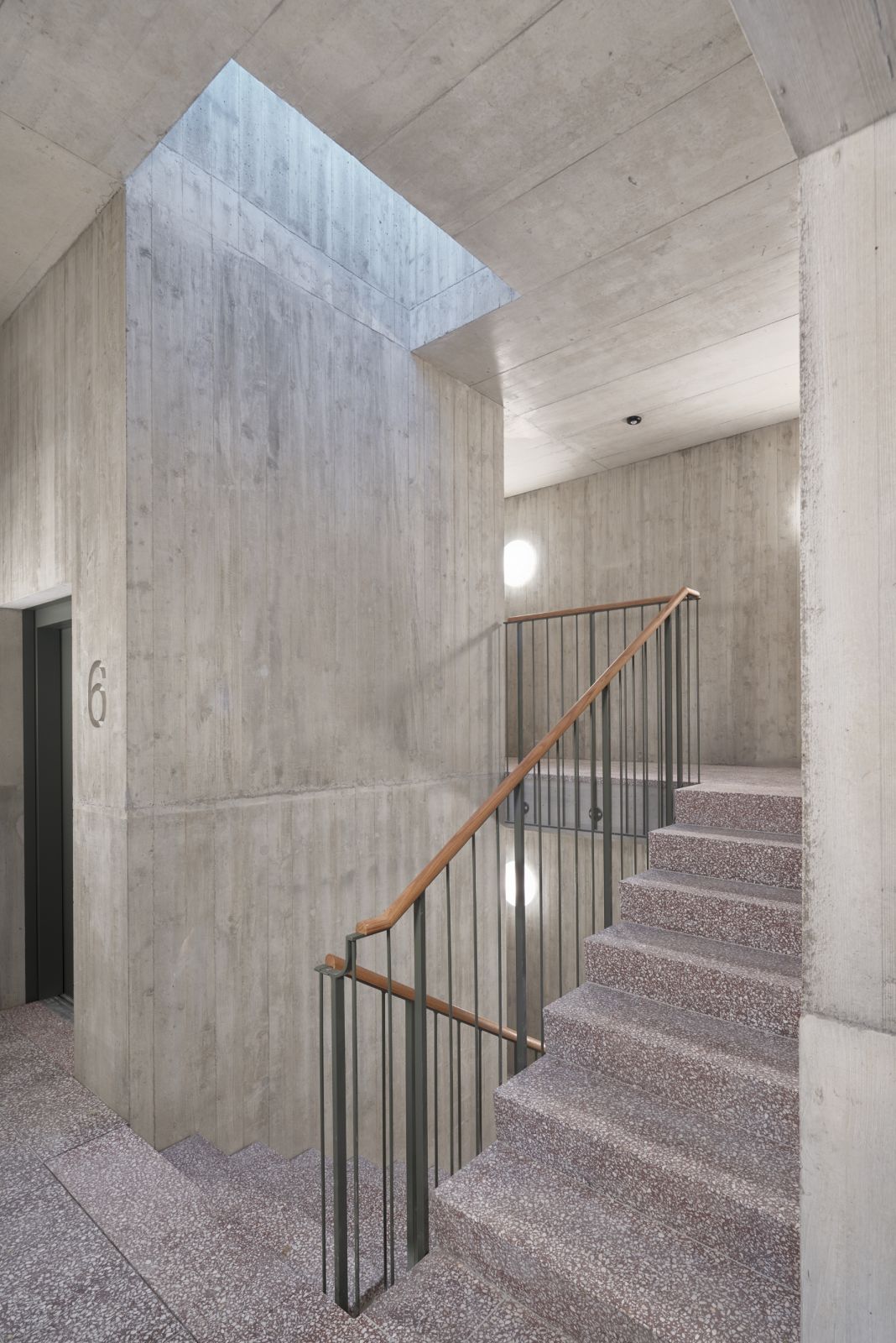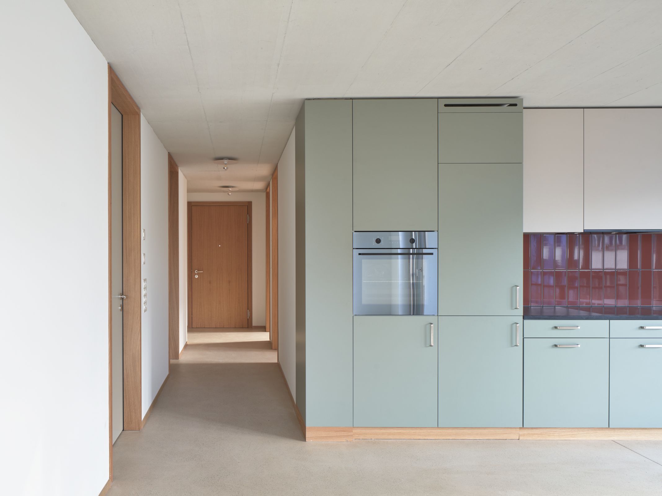 Im Neubau werden 24 Wohneinheiten realisiert, in Wohnungsgrössen von 2.5- bis 5.5-Zimmern. Dabei sind zwei Wohnungstypen vorherrschend: Die mittig platzierten Wohnungen profitieren von einem langgestreckten Raum in Ost-Westrichtung. Dabei wird der Küchen- und Wohnbereich maximal aufgespannt und es entstehen eine aktive Mitte und ruhige Pole. Der Einbezug des Hanggefälles wird mit einem leichten Niveauunterschied in der Wohnungsmitte umgesetzt. Die kompakteren Eckwohnungen profitieren besonders von der Staffelung des Baukörpers, woraus sich längere Besonnungsdauer und diagonale Blickachsen ergeben. Die Grundrisse weisen klar abgetrennte Wohn- und Essbereiche auf, so dass die Wohnstuben auch flexibel als Spiel- oder Arbeitsbereiche genutzt werden können.