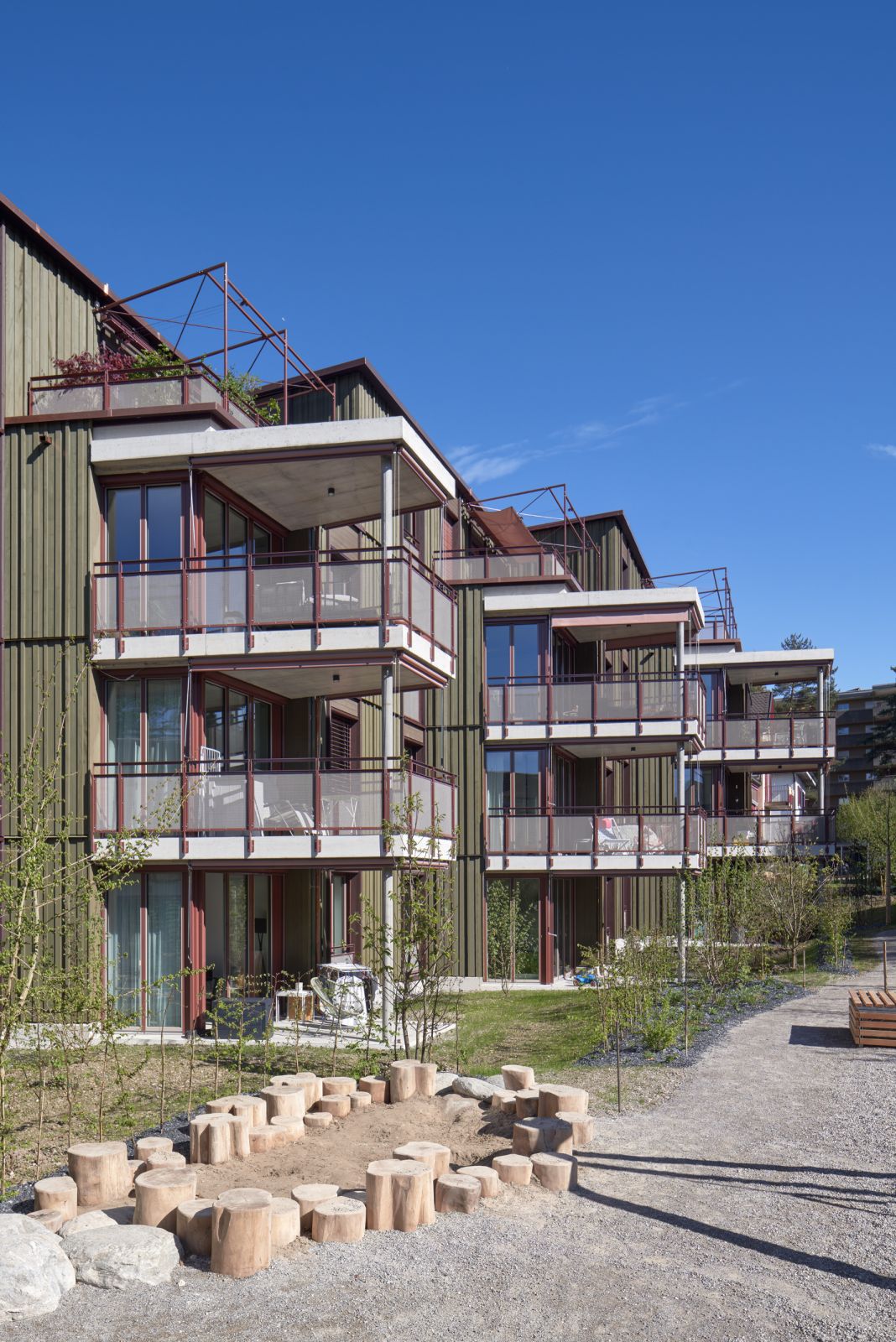 Die Vernetzung der Freiräume geschieht über die grosszügigen Vorgärten zum Strassenraum und zu den hangseitigen Grünbereichen. Über Treppen und leicht geneigte Wege erreichen die Bewohnenden die beiden Hauseingänge. Integriert in das Wegnetz finden sich die Spielbereiche für kleine sowie ältere Kinder und ein siedlungsinterner Aussensitzplatz für die Bewohnerschaft. Im rückwärtigen Aussenbereich profitieren die Erdgeschosswohnungen jeweils von einem privaten Garten. Hecken und naturnahe Pflanzungen schützen die Privatsphäre und unterstützen die Biodiversität des Grünraums.