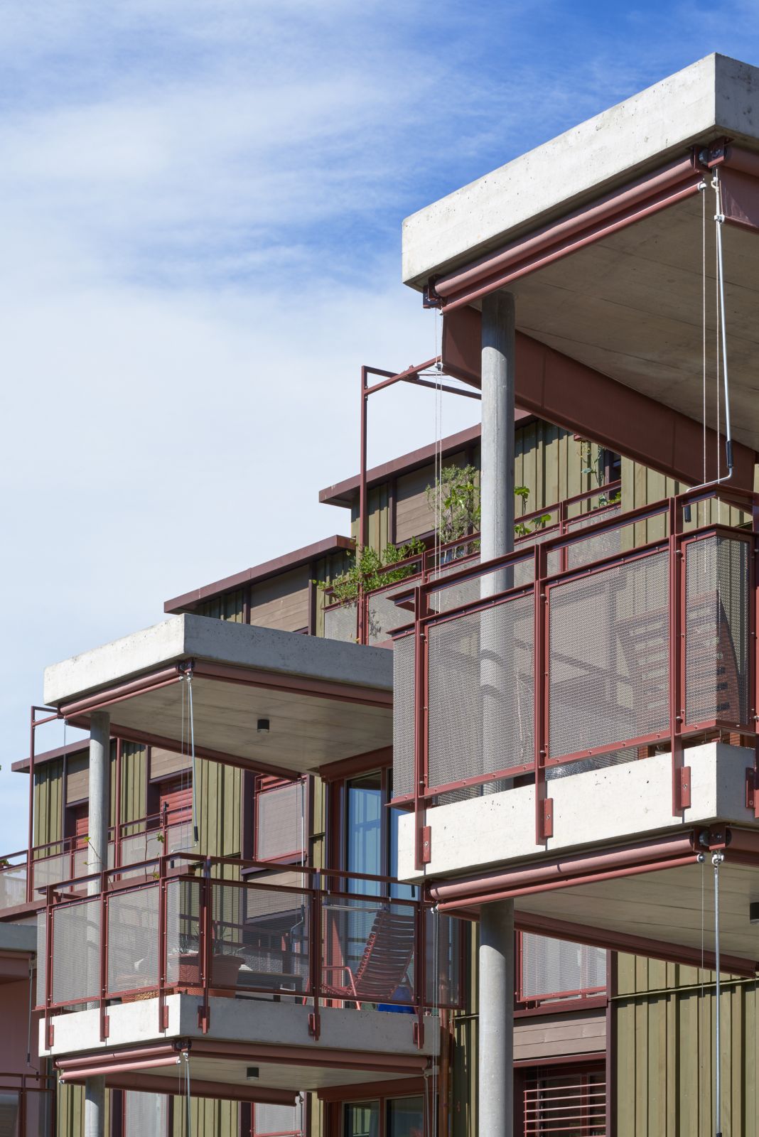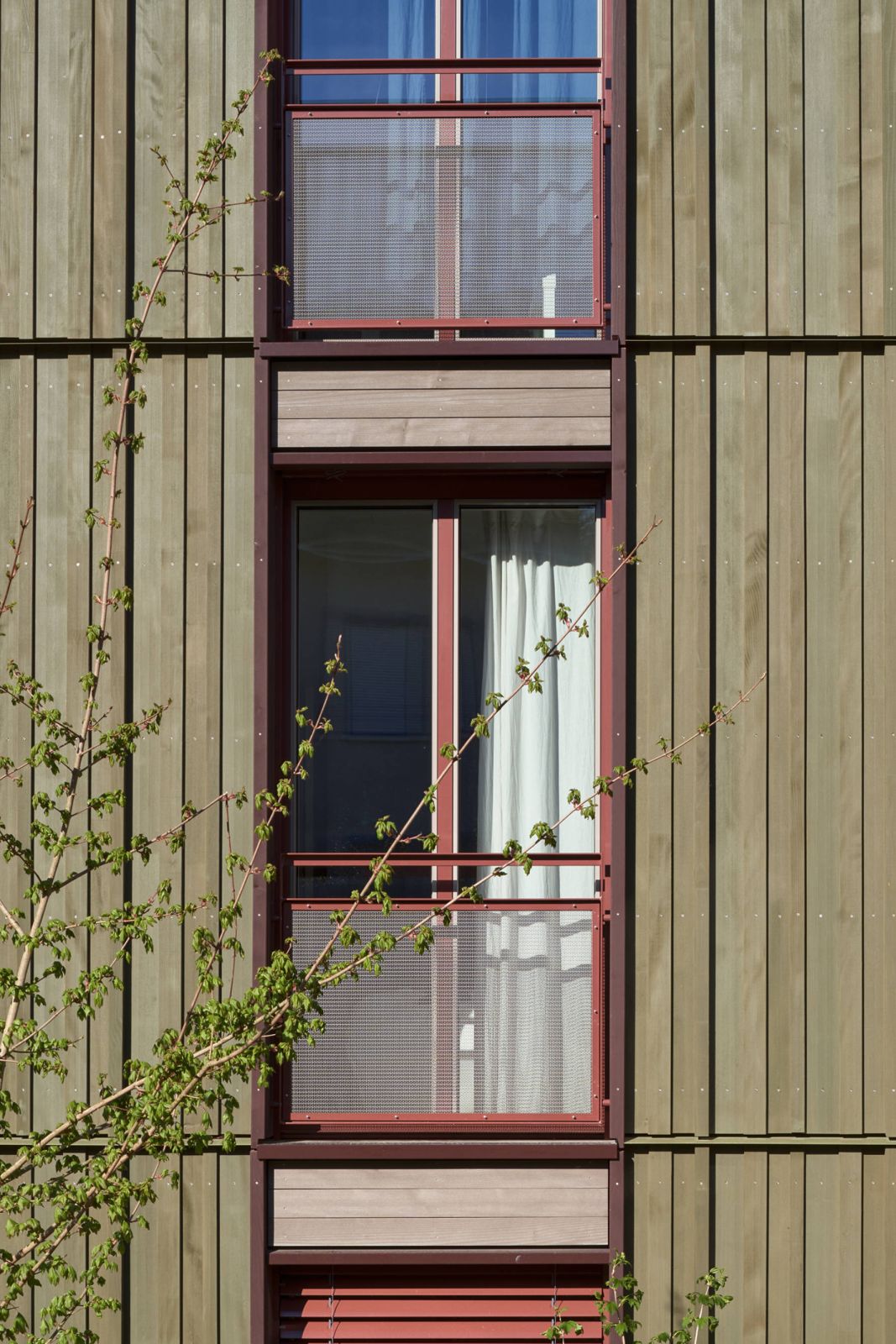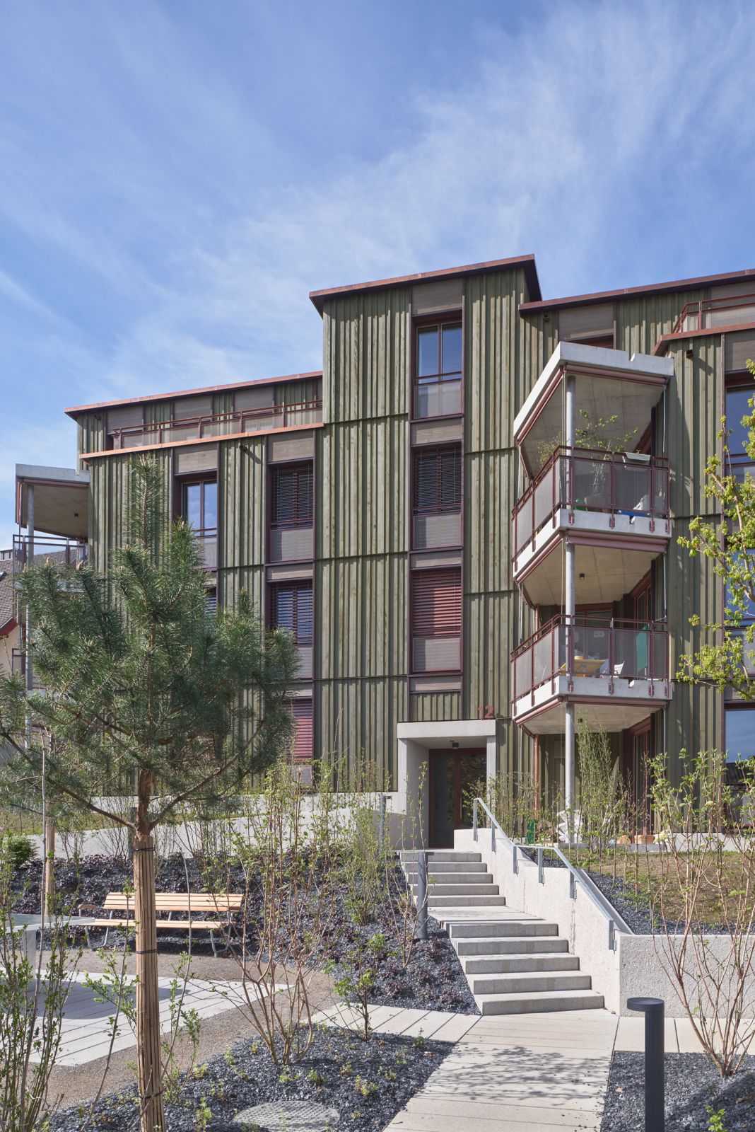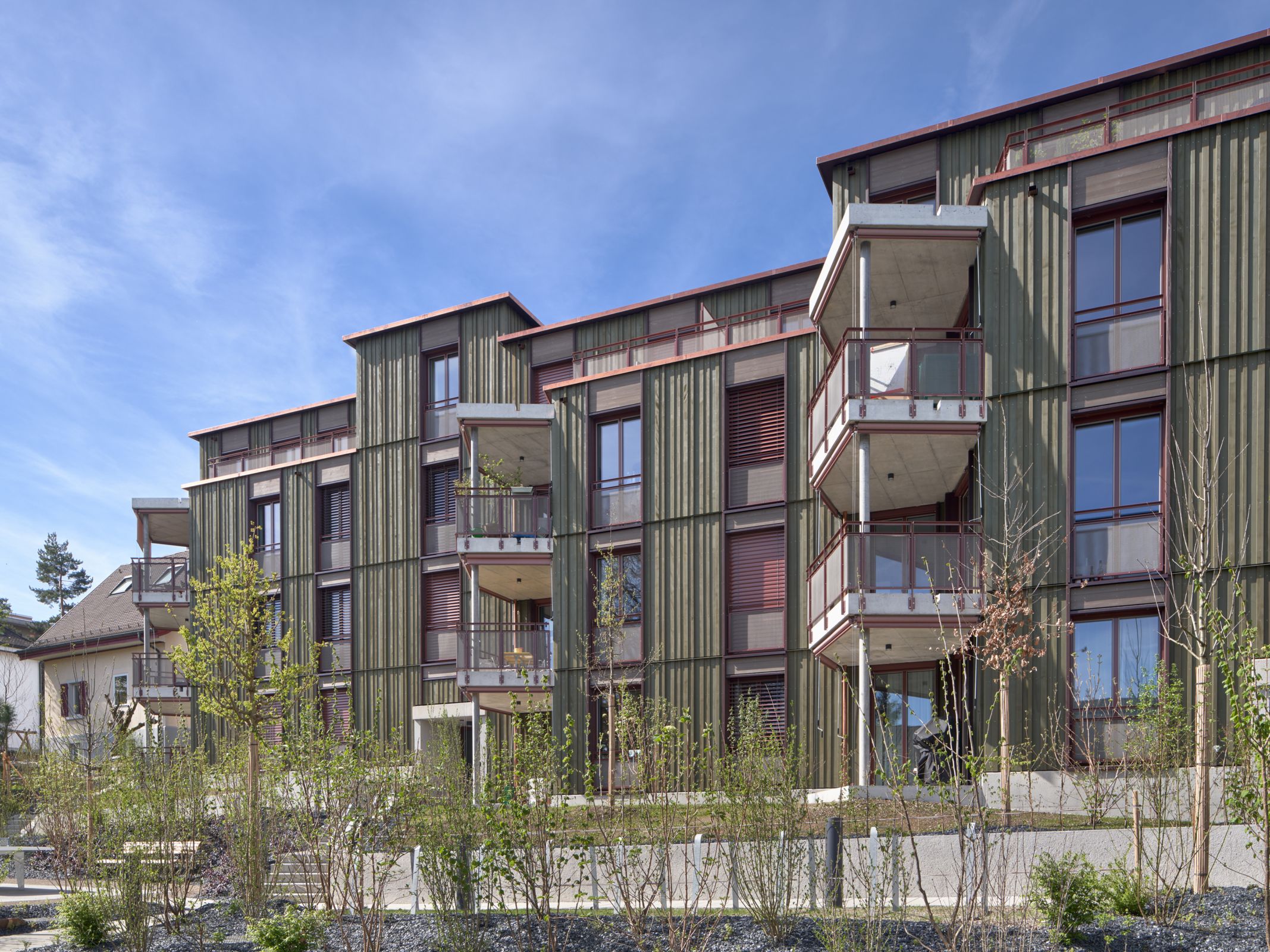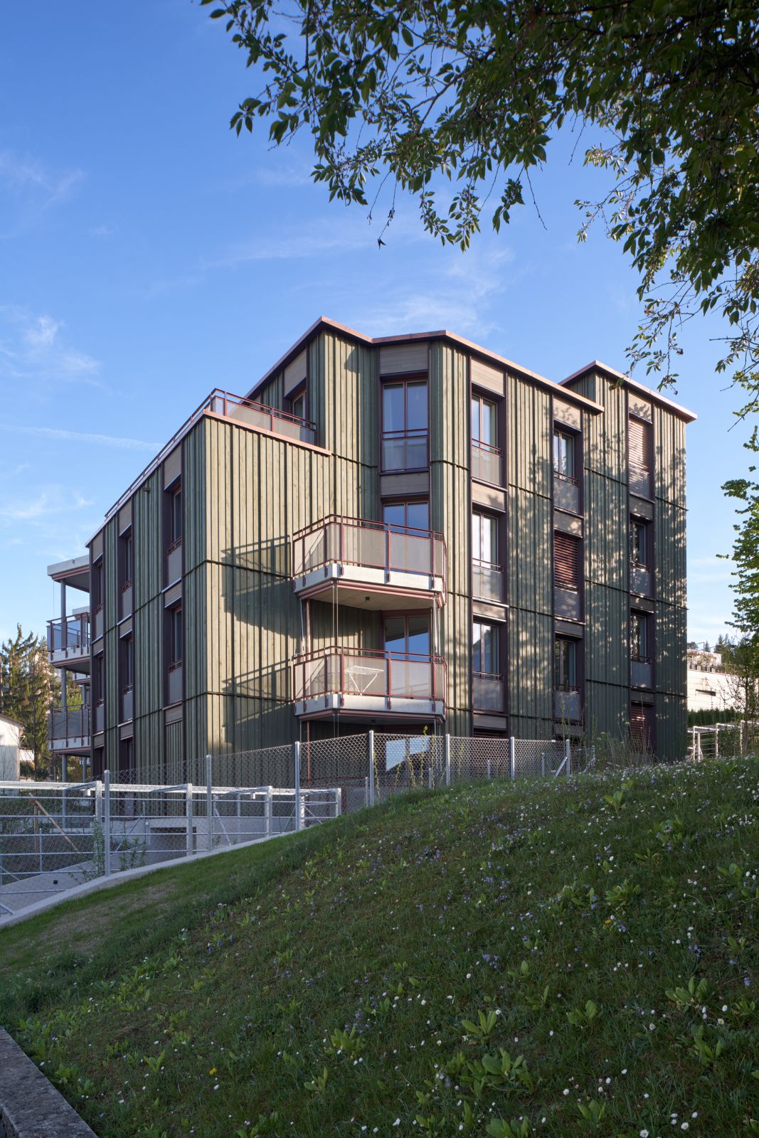 Der architektonische Ausdruck ist geprägt von der hinterlüfteten Fassadenbekleidung mittels vorbehandelter Holzschalung. Für die Gliederung der Fassade werden vertikale Lisenen eingeführt. Als gestalterisches Element werden diese zusammen mit den Fensterbänken und Sturzelementen farblich differenziert behandelt. So entsteht ein feingliedriges Aussenkleid, welches sich mit den vorgesetzten Balkonen selbstverständlich in die Umgebung integriert.