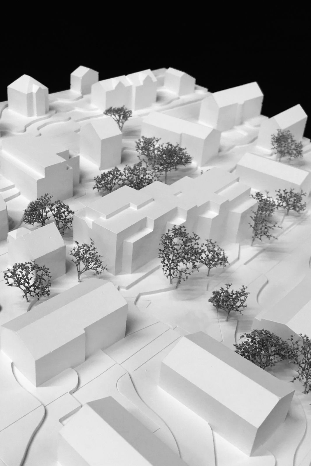 Die Staffelung des neuen Volumens in Höhe und Länge, auf einer kompakten Grundfigur, vermittelt zu den angrenzenden Bauten und entwickelt eine der Umgebung angemessene Massstäblichkeit.