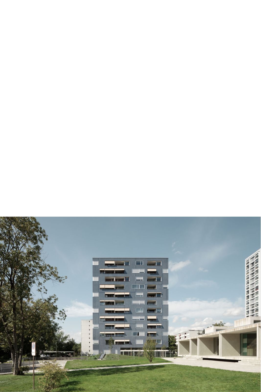 Das hohe Haus ist Teil der Gesamtüberbauung Hirzenbach. 1955/61 vom Stadtbaumeister Adolf Wasserfallen entwickelt, zelebriert die Planung den modernen Städtebau der 60er Jahre: So prägen Hochhausscheiben, Zeilen und Punkthochhäuser in einem grossräumigen Freiraum die Siedlung. Das Haus mit den Alterswohnungen etabliert sich in einer kompakten Form ungerichtet in einer Höhe von zwölf Geschossen. Im Zentrum befindet sich die Schulanlage mit den zugehörigen Aussenbereichen. Durch die zeitgleiche Erweiterung der Schulbauten wird der Freiraum als Gesamtanlage weiterentwickelt und das neue Wohnhaus mit eingebunden. Dabei wird auf eine offene, durchgehende Wegführung geachtet. Ein öffentlicher Fussweg bindet den Aussenraum der Alterswohnungen an das neu entwickelte Wegenetz der Schulanlage an.