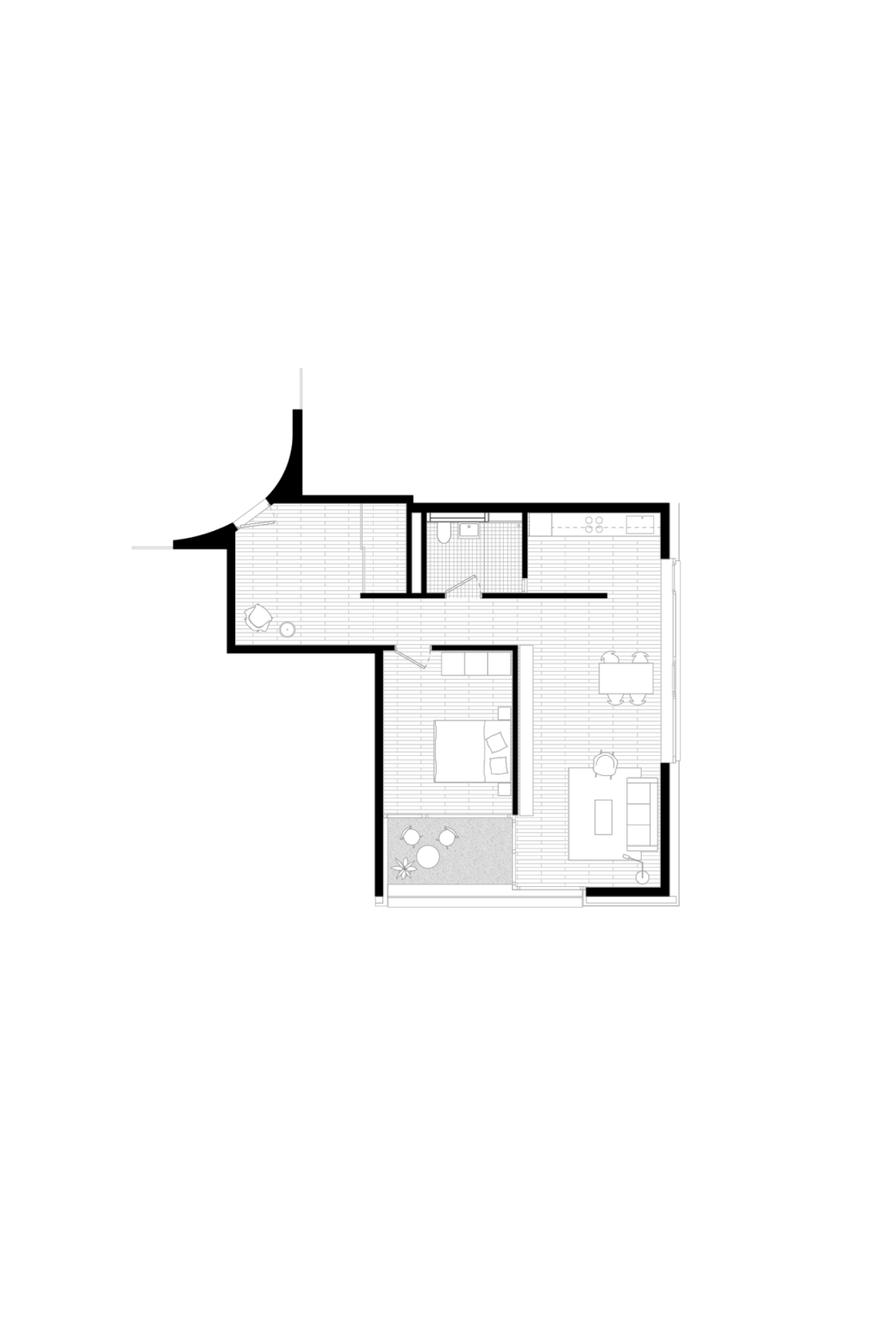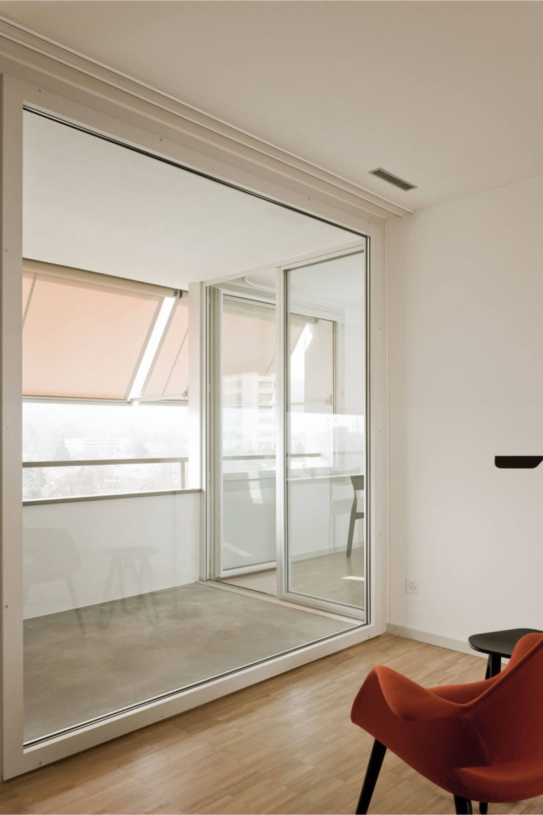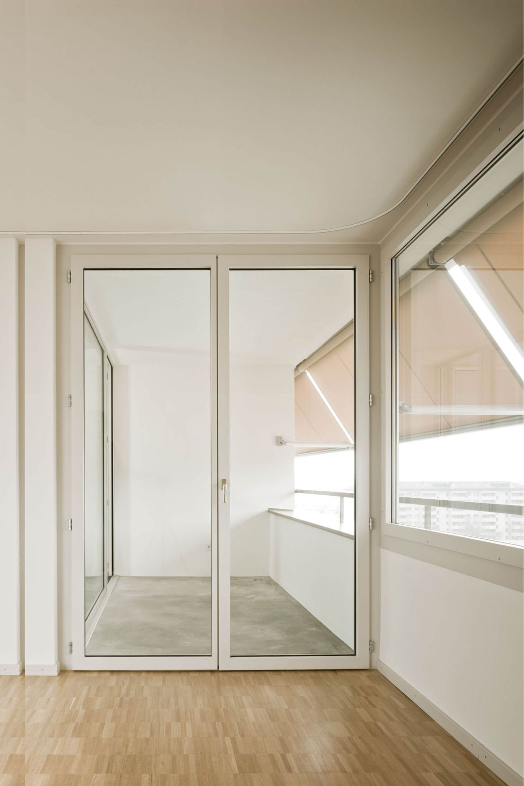 In den 11 Wohngeschossen sind auf drei Geschossen die Waschräume angeordnet. Die BewohnerInnen gelangen mehrheitlich über die Lifte in einen übersichtlichen Erschliessungsraum, dem jeweils fünf Wohnungen angegliedert sind. Die ovale Halle wird über ein Nordfenster belichtet. Form und Materialität erzeugen eine behagliche Raumstimmung. Von den fünf Wohnungen liegen jeweils vier in den Ecken. Von einem grosszügigen Entree werden die Wohnungen bis zu den lang gezogenen Eckwohnräumen aufgespannt, welche zweiseitig belichtet sind. Dem Wohnraum sind jeweils seitlich die Küche und eine Loggia angelagert, über welche man wiederum in ein Schlafzimmer gelangt. Durch diesen “Circuit“ über den privaten Aussenbereich und den lang gezogenen Wohnraum entstehen für Kleinwohnungen grosszügige Dimensionen