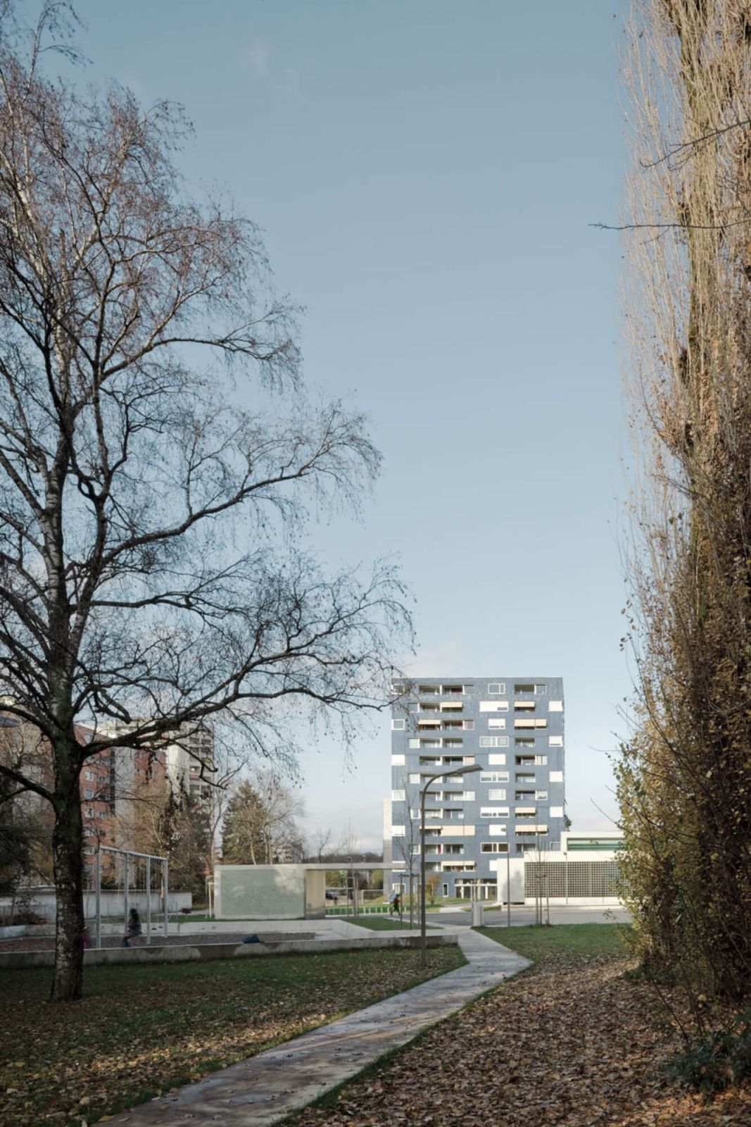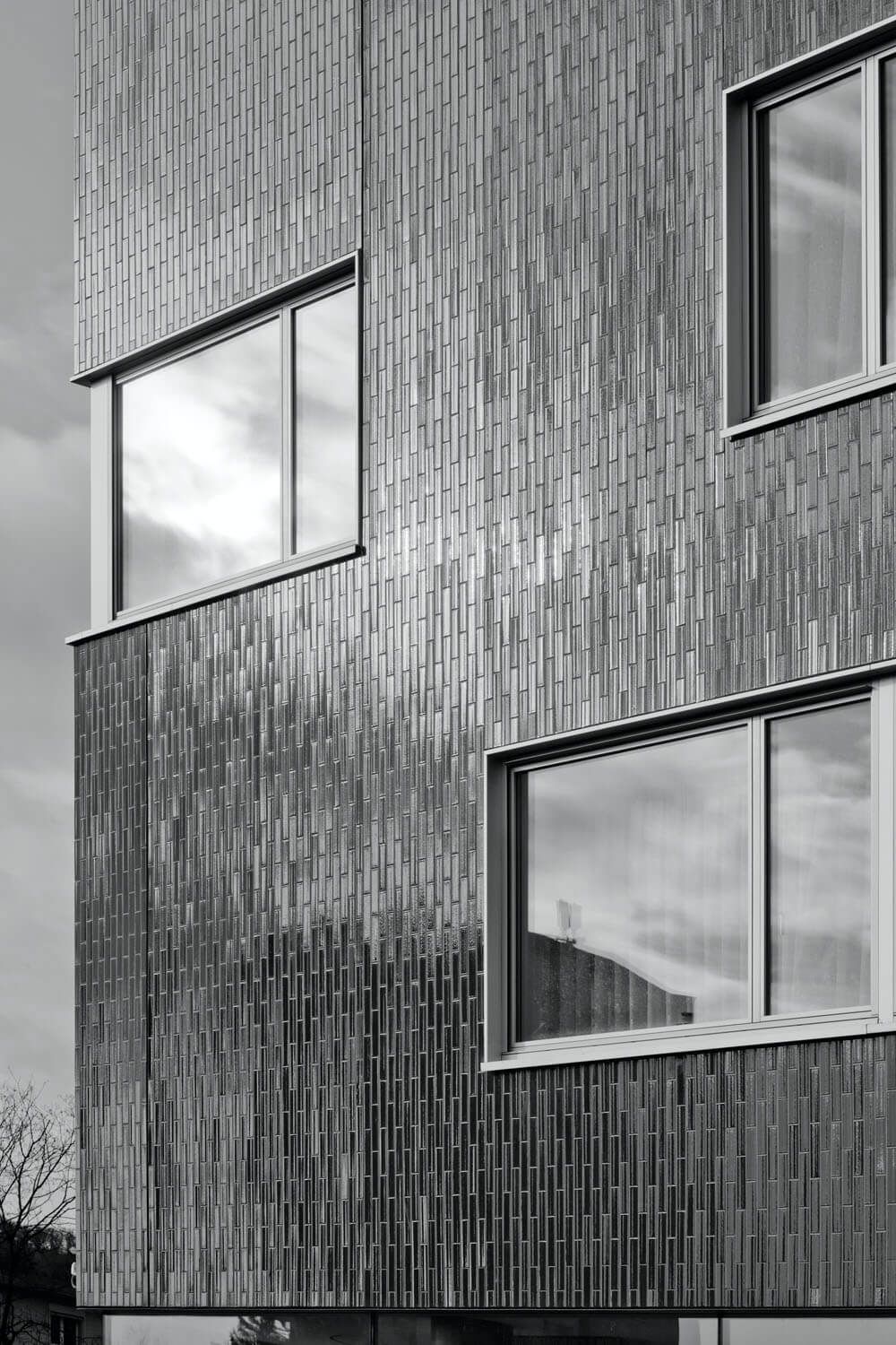 Eine vorgehängte, hinterlüftete Leichtbaufassade, dessen äusserste Schicht mit Steinzeugplatten bekleidet ist, knüpft an die Bautradition der 60er Jahre an und vermag gleichzeitig den Anforderungen eines vertikal organisierten Hauses nach Langlebigkeit zu entsprechen. Die schimmernde Haut macht die klimatischen Veränderungen und Stimmungen spürbar und gibt dem Baukörper eine eigene Identität.