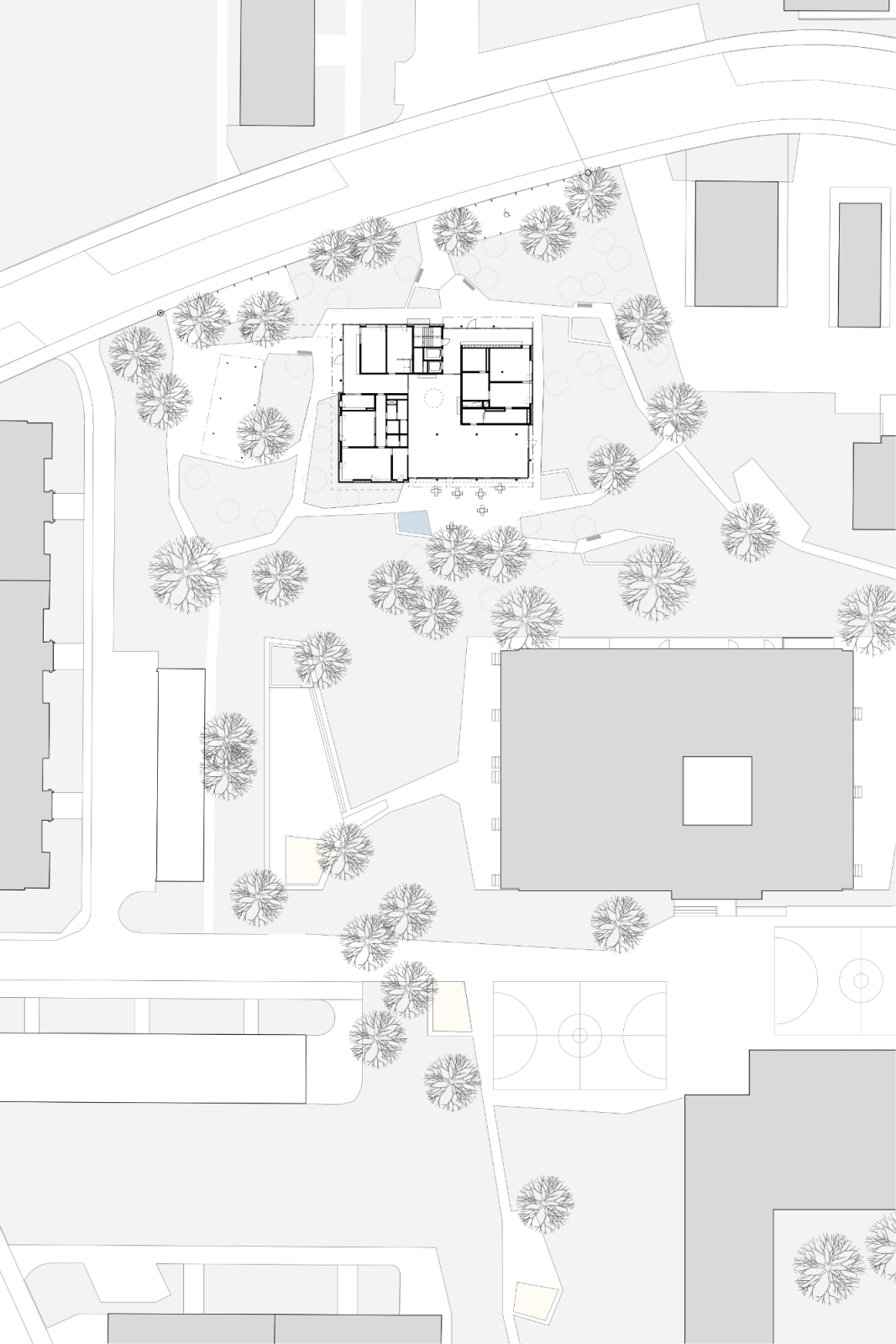 Die Erschliessung des Wohnhauses erfolgt über die Hirzenbachstrasse. Verbindendes Element bildet das im Herzen des Hauses gelegene Foyer. Von hier gelangen die BewohnerInnen zum Saal, zu Spitex mit Pflegebad, Hobbyräumen und Wäschesammelstelle. Der direkte Bezug dieser Nutzungen zum Aussenraum und zu den Eingängen ermöglicht spontane Begegnungen mit Nachbarn und Besuchern.