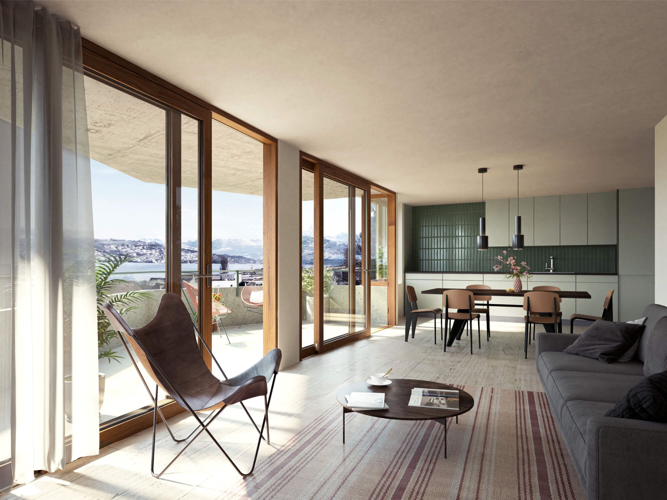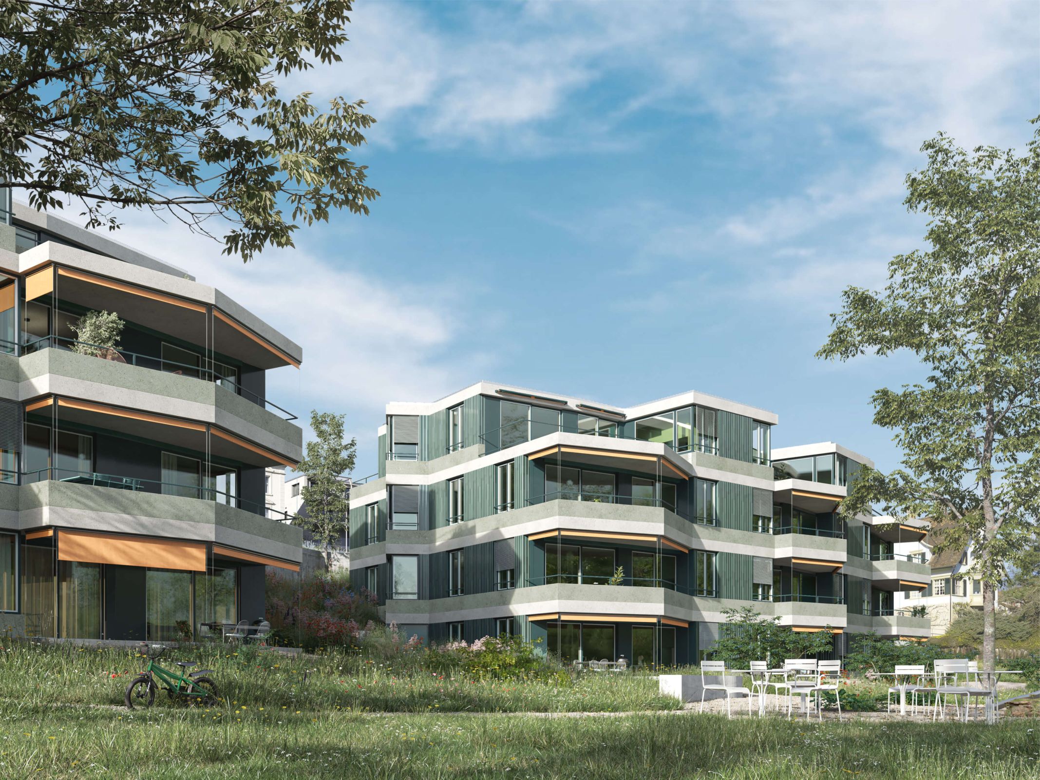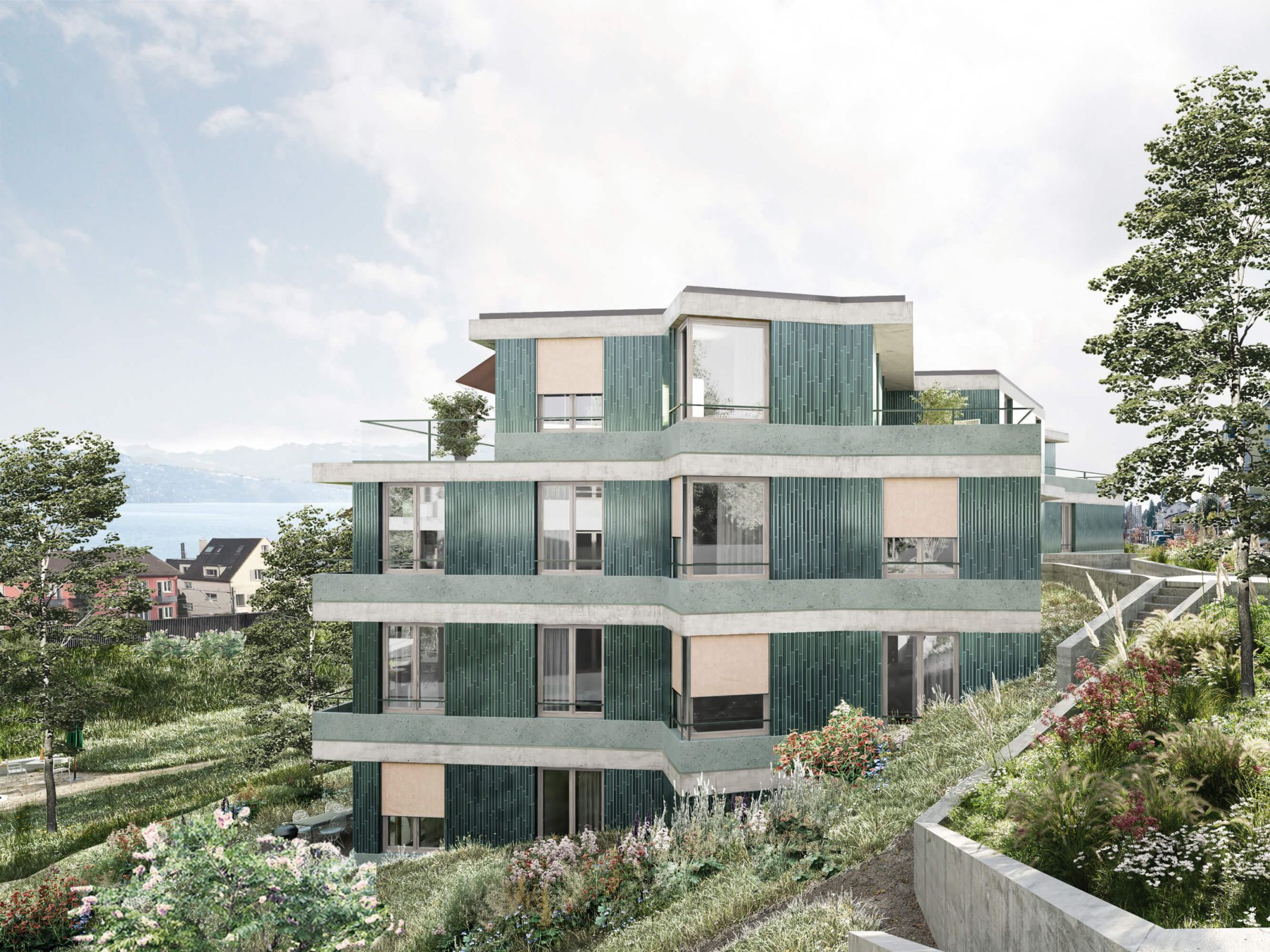 Der architektonische Ausdruck ist geprägt von der horizontalen Schichtung der Fassade und den raumgreifenden Balkonen mit ihrer abgewinkelten Geometrie. Die Materialisierung aus vorgehängten Keramikplatten und vorfabrizierten eingefärbten Betonelementen betonen den gehobenen und langlebigen Charakter der Wohnbauten. Die Robustheit wird der topografischen Lage gerecht und schützt die Häuser optimal vor äusseren Einflüssen. Die glasierten, wellenförmigen Terracottaplatten vermitteln zusammen mit den Stoffmarkisen einen lebendigen Ausdruck.