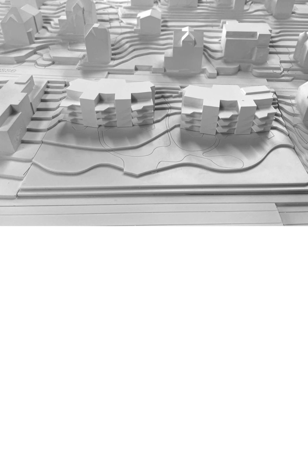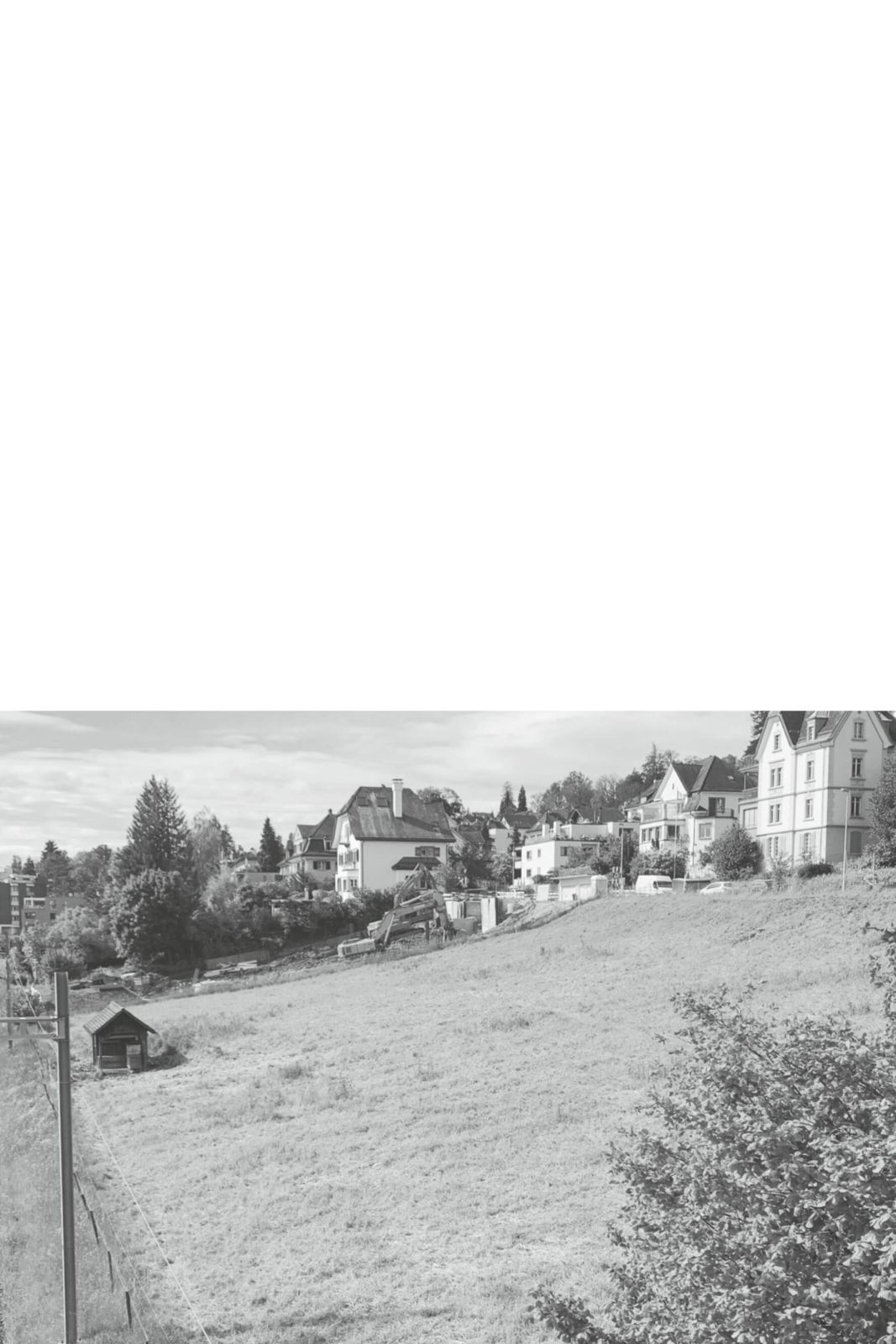 Das Grundstück weist einige Eigenheiten auf. Der Bahnlärm und die stark abfallende Topografie beeinflussen den Projektentwurf massgeblich. So entstehen an höchster Lage der Parzelle zwei Häuser mit ausgeprägter Dualität. Die Häuser erscheinen strassenseitig geduckt und entfalten ihre Präsenz vor allem talseitig. Die konvex/konkave Grundrissfigur reagiert spezifisch auf die unterschiedliche Lage am Hang. Der intime, leicht abgesetzte Eingangshof führt zu den jeweiligen Eingängen und schafft eine gewisse Privatheit. Die aufgefächerten Fassaden dagegen nehmen den Bezug auf zur Weite des imposanten Landschaftsraums mit See und Bergen.