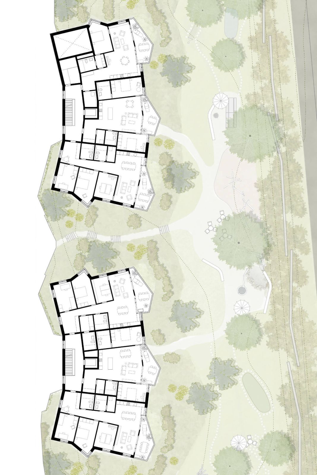 Die Konzentration der Baumasse bergseitig schafft seeseitig einen grosszügigen und gemeinschaftlichen Freiraum mit vielfältigen Aufenthaltsbereichen. Über einen Treppenweg ist der Garten von oben zugänglich. Die verbleibenden Zwischenräume bilden wichtige Bezugspunkte zum See und zur gegenüberliegenden Landschaft. Der Hang wird intensiv bepflanzt und bietet so die notwendige Privatsphäre für die darin liegenden Aussensitzplätze der Wohnungen.