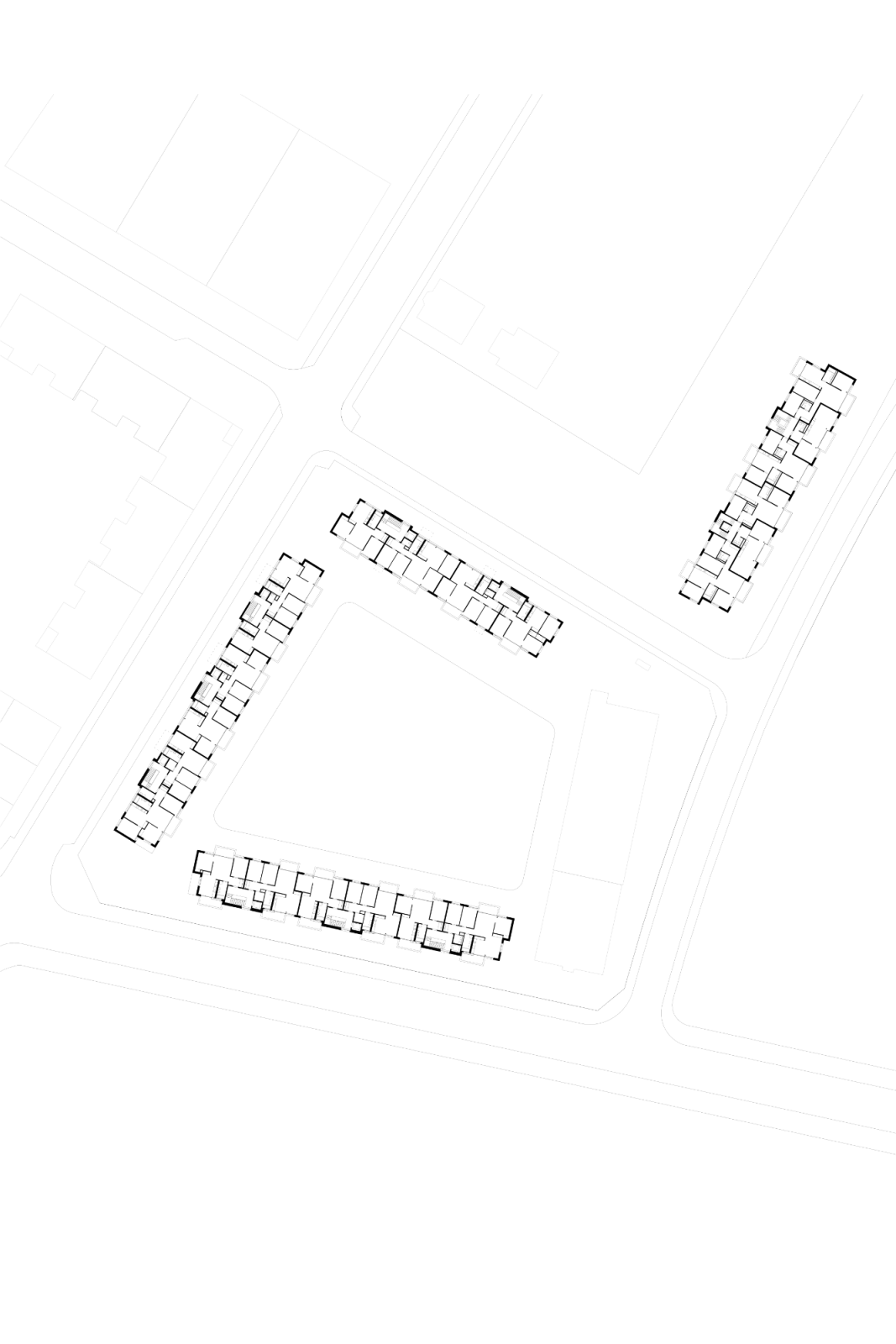 Die Typologie des Projekts besteht aus einfachen und kompakten Gebäudekörpern. Auf dem südlichen Areal gruppieren sich drei lange Gebäude um das Geviert des grossen Wohnhofs. Der weite Innenhof ist durch die Umschliessung vor dem Aussenlärm geschützt und bildet so einen ruhigen Wohnhof. Bei der Strassenkreuzung Letzigraben/ Fellenbergstrasse wird ein kleiner Platz ausgewiesen, welcher mit Laden und Bistro einen öffentlichen Charakter erhält und als Anziehungspunkt im Quartier wirkt.