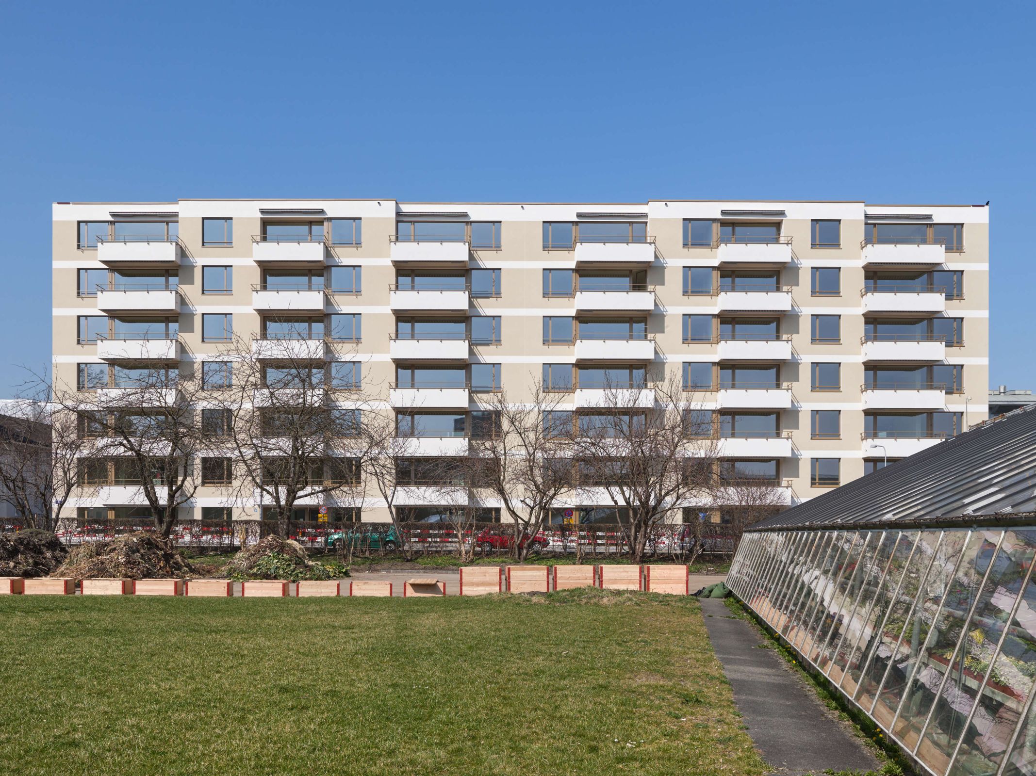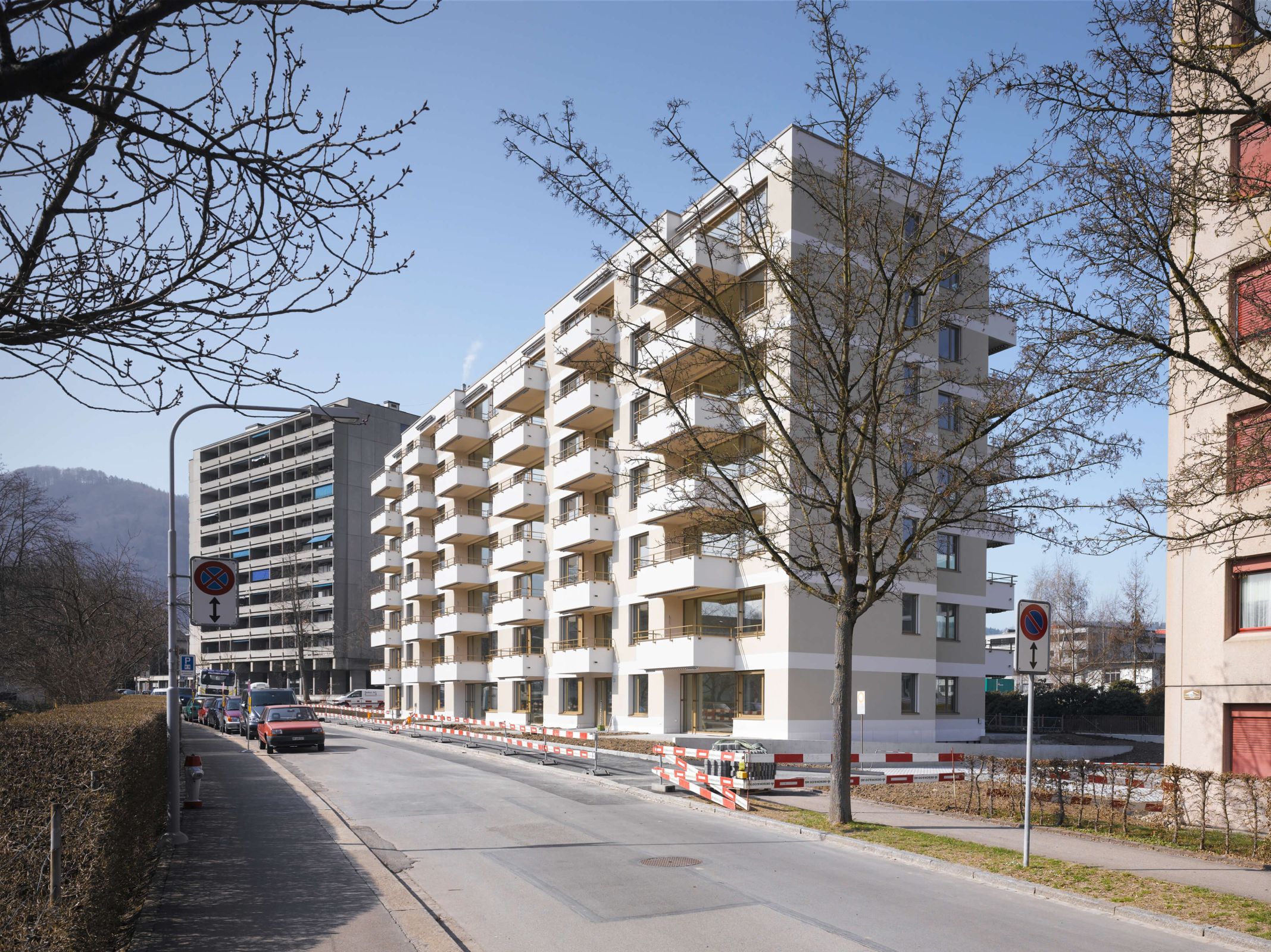 Die Ersatzneubauten wurden in Mischbauweise realisiert. Um eine möglichst grosse Nutzungsflexibilität zu gewährleisten, sind nur diejenigen Kern- und Wohnungstrennwände tragend, welche zur Aussteifung der Gebäude notwendig sind. Die Decken werden hauptsächlich von schlanken Stützen getragen. Die Anordnung im Innern und entlang der nichttragenden Fassaden wurde so gewählt, dass sich ökonomische Spannweiten ergeben. Die in Holzbauweise erstellten Aussenwände bestehen aus vorfabrizierten selbsttragenden Elementen.