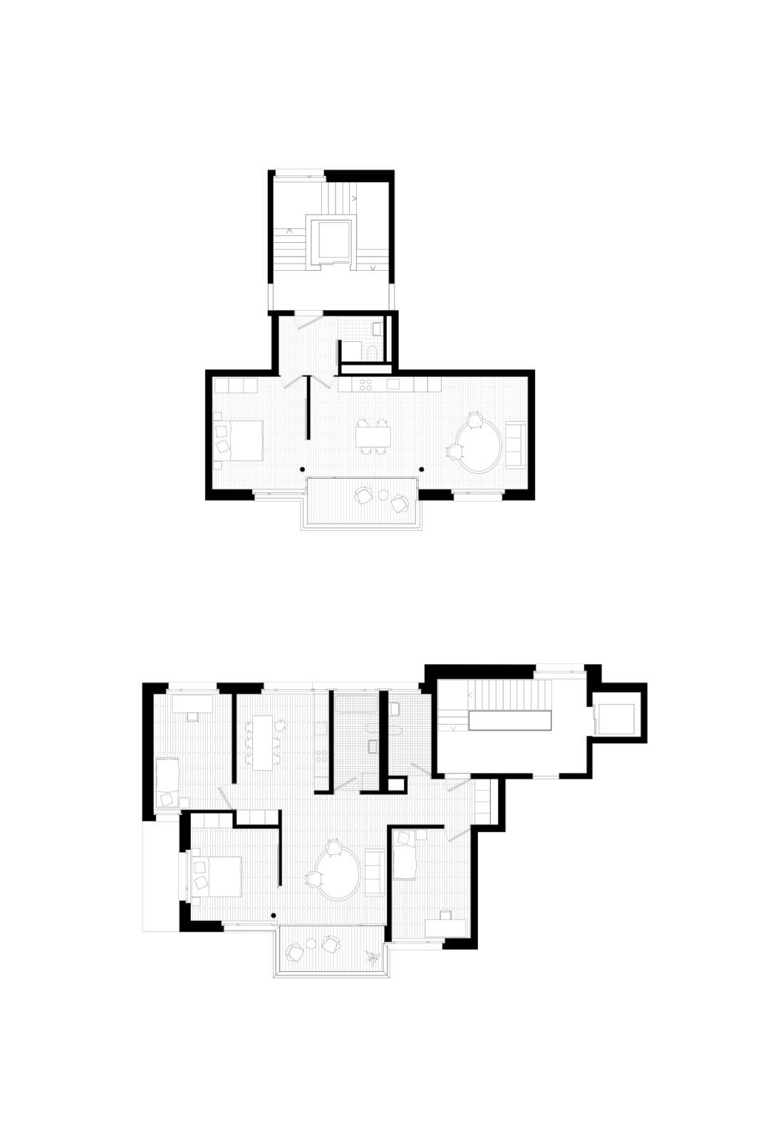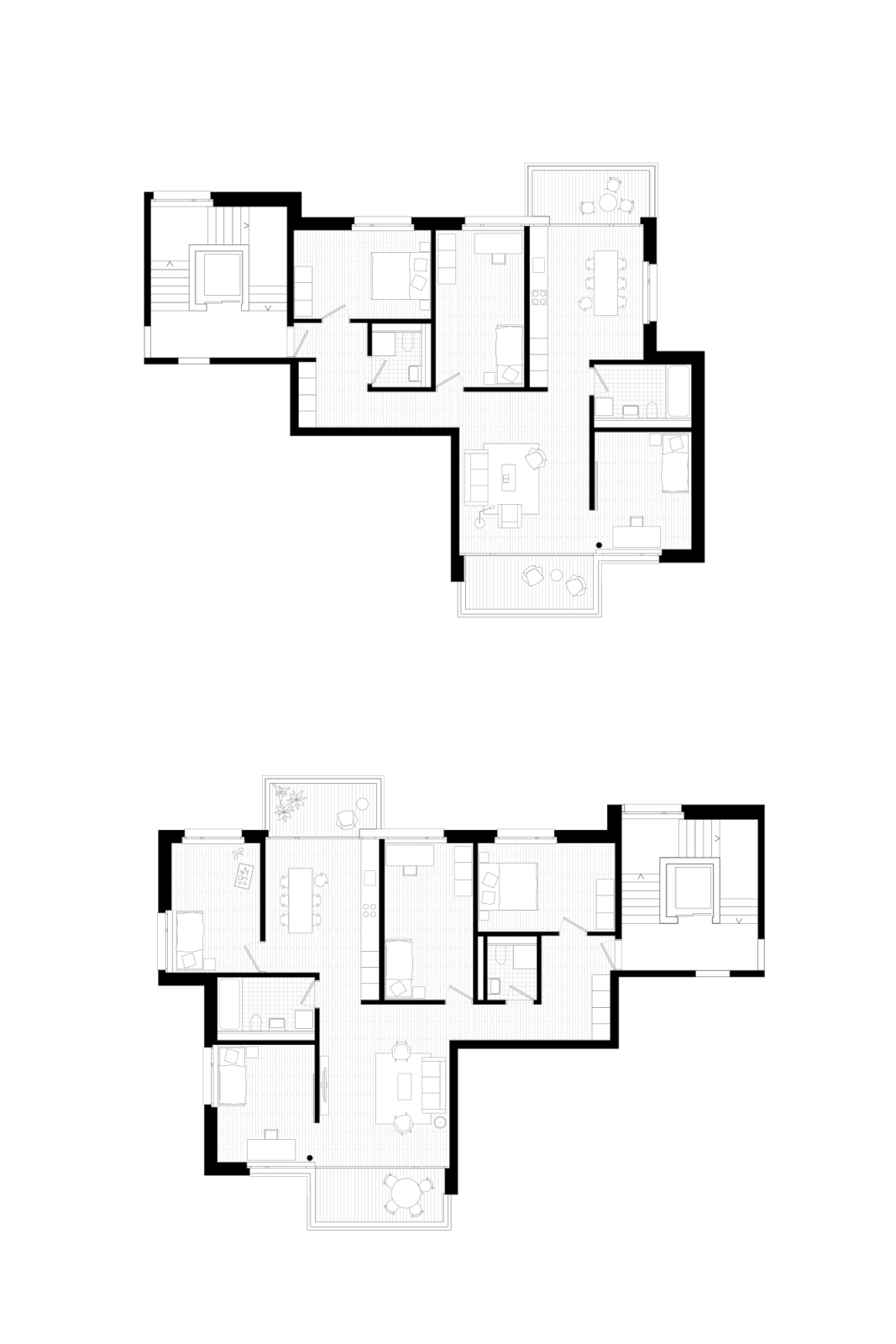 Die Gebäude sind alle strassenseitig erschlossen und weisen einen direkten Zugang zum Hof auf. Öffentliche Nutzungen beleben die dem Verkehrslärm von Fellenbergstrasse und Letzigraben ausgesetzten Erdgeschosse. In den Obergeschossen liegen je zwei oder drei Wohnungen an einem Treppenhaus. In allen Wohnhäusern wurden ähnliche Grundrisstypologien entwickelt, die aber, der jeweiligen Lärmsituation und Himmelsrichtung angepasst, unterschiedlich angelegt sind. Der sich in der diagonalen Richtung ausbreitende Wohn- und Essraum ermöglicht ein grosszügiges Wohngefühl. Die Schlaf- und Arbeitszimmer sind neutral ausgebildet.