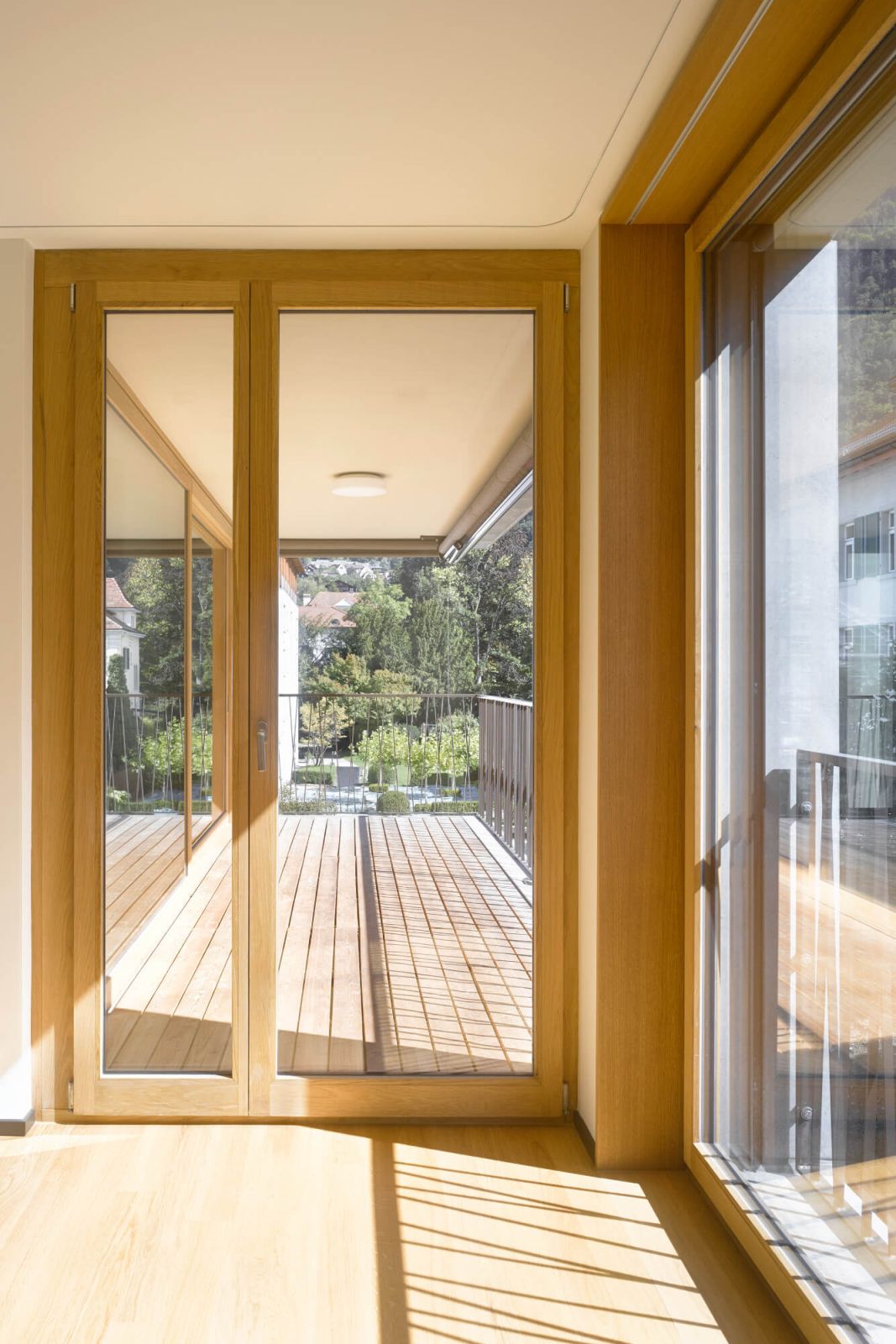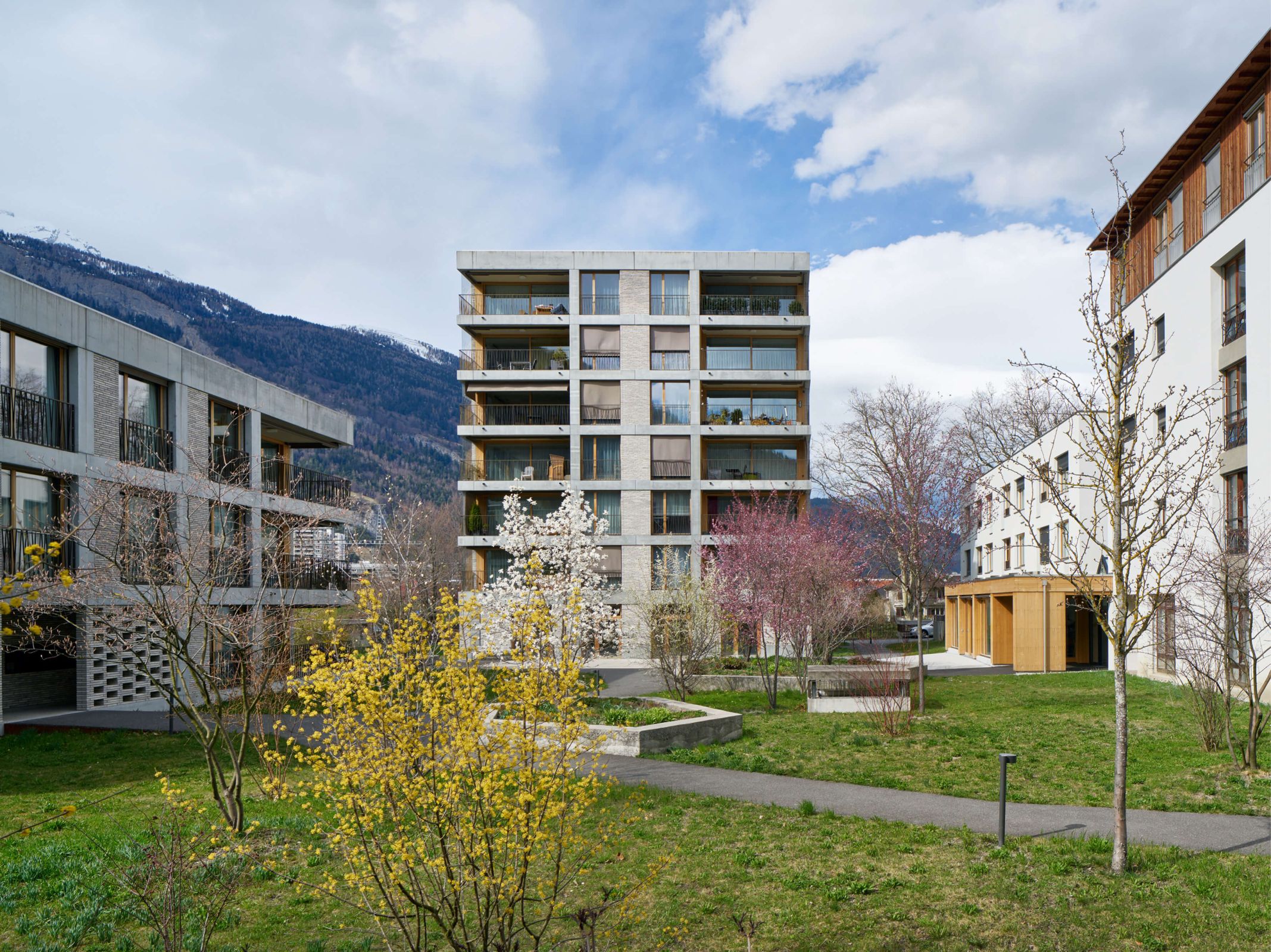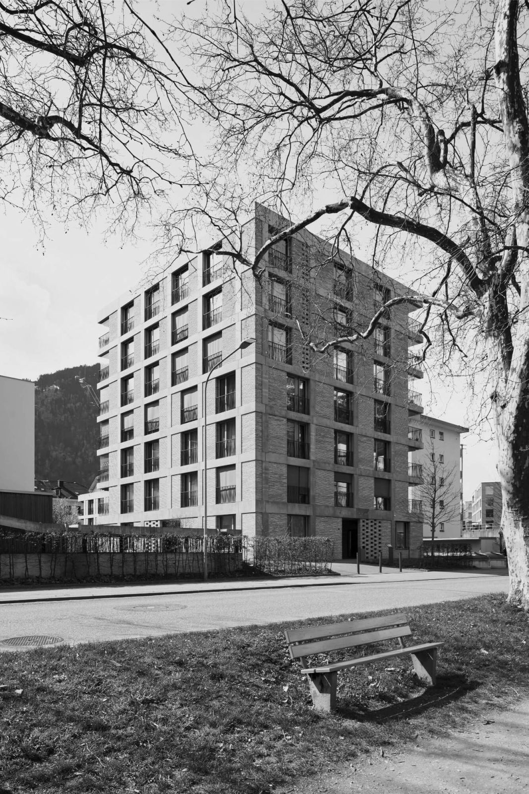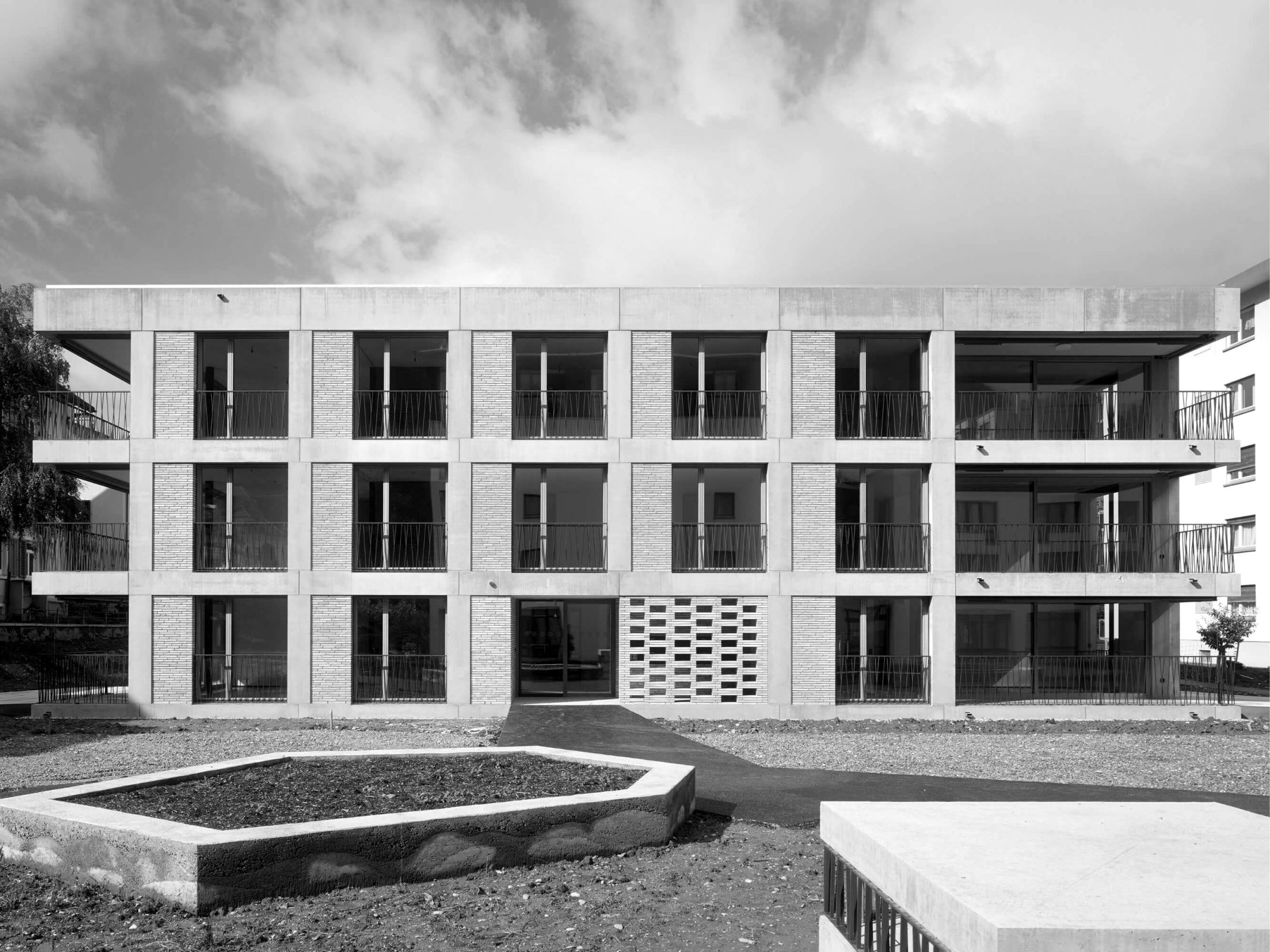 Der Eingang im Erdgeschoss des siebenstöckigen Hauses dient gleichzeitig als Zugang zu den Wohnungen und den Sitzungszimmern. Der Saal und sein Foyer sind über einen zusätzlichen Eingang nochmals separat erschlossen und können so unabhängig vom Haupteingang genutzt werden. In den Obergeschossen liegen achtzehn Wohnungen an Ecklage, die von der wunderbaren Bergaussicht profitieren. Im Gegensatz dazu steht das niedere Haus mit seinen zwölf Wohnungen im ruhigen Garten und bietet im Erdgeschoss die Möglichkeit von Gartenwohnungen. Diese Typologie entspricht jener des gegenüberliegenden bestehenden Altersheims.