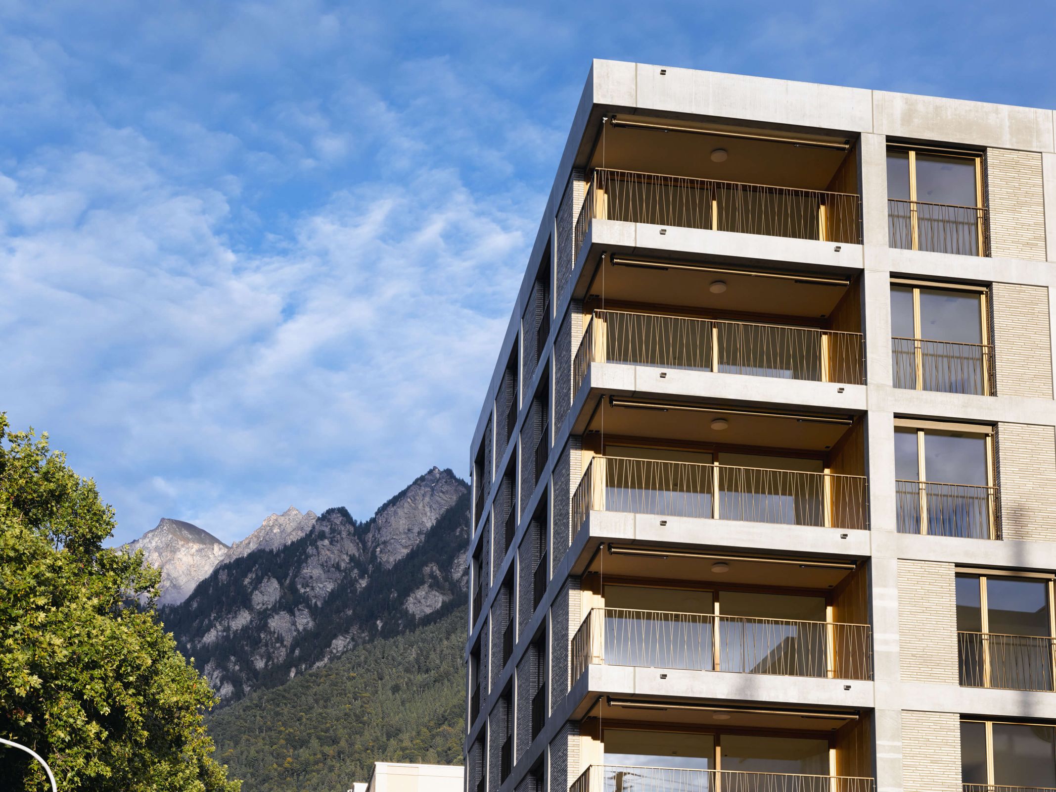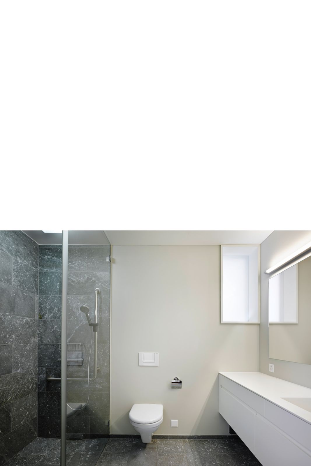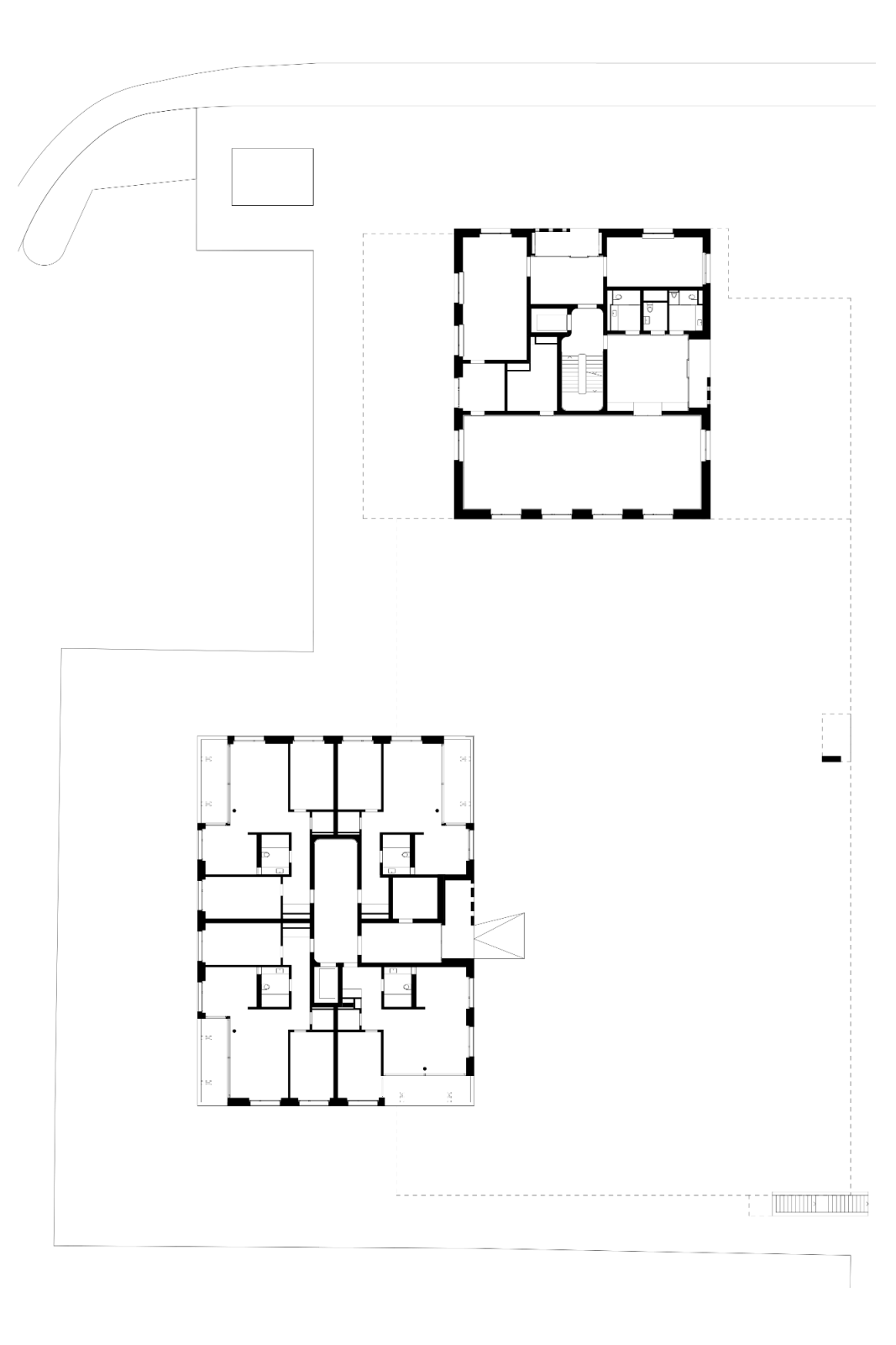 Der Eingang im Erdgeschoss des siebenstöckigen Hauses dient gleichzeitig als Zugang zu den Wohnungen und den Sitzungszimmern. Der Saal und sein Foyer sind über einen zusätzlichen Eingang nochmals separat erschlossen und können so unabhängig vom Haupteingang genutzt werden. In den Obergeschossen liegen achtzehn Wohnungen an Ecklage, die von der wunderbaren Bergaussicht profitieren. Im Gegensatz dazu steht das niedere Haus mit seinen zwölf Wohnungen im ruhigen Garten und bietet im Erdgeschoss die Möglichkeit von Gartenwohnungen. Diese Typologie entspricht jener des gegenüberliegenden bestehenden Altersheims.