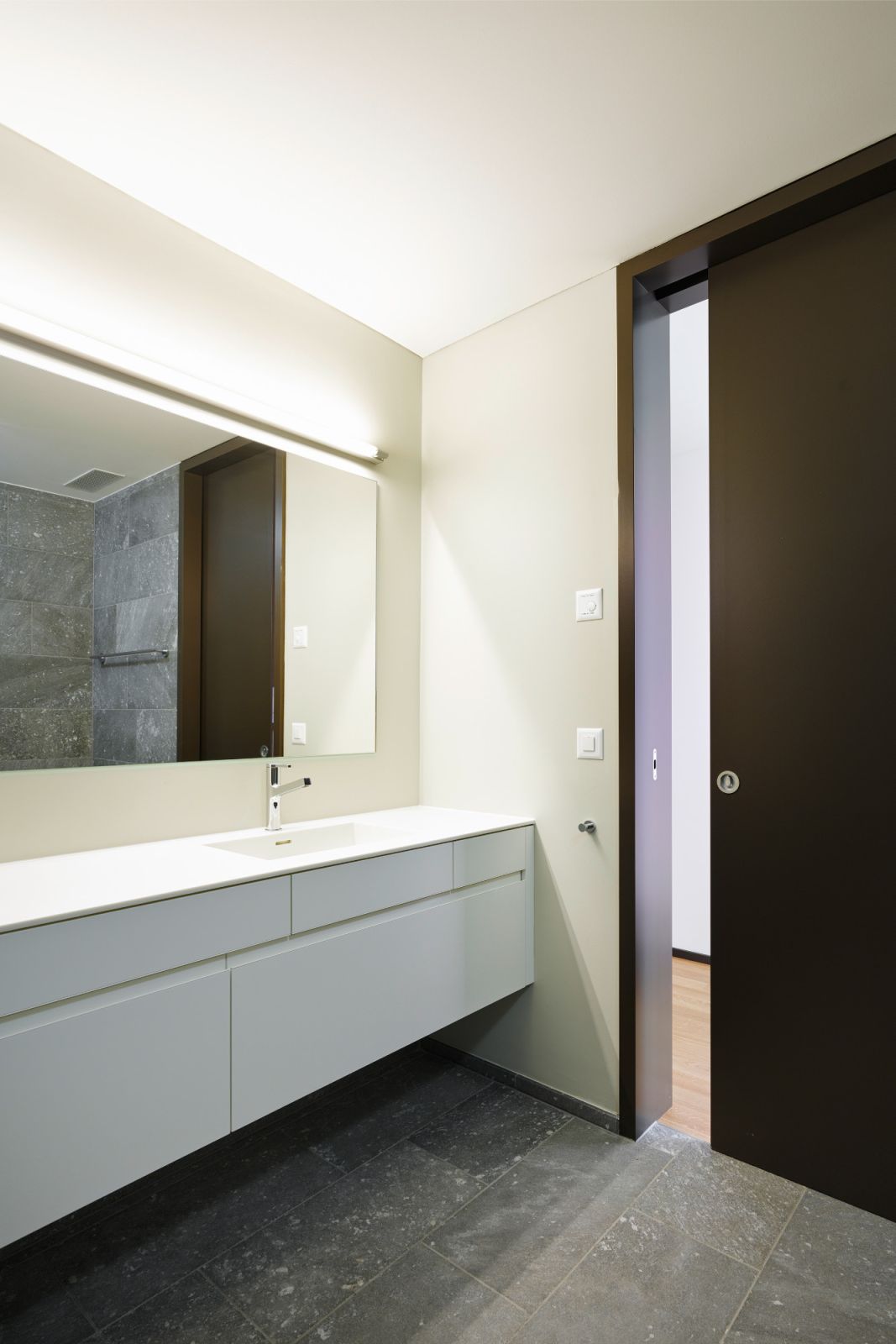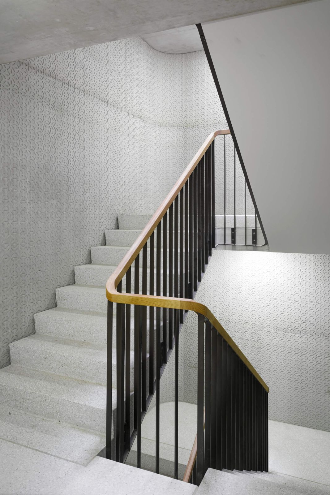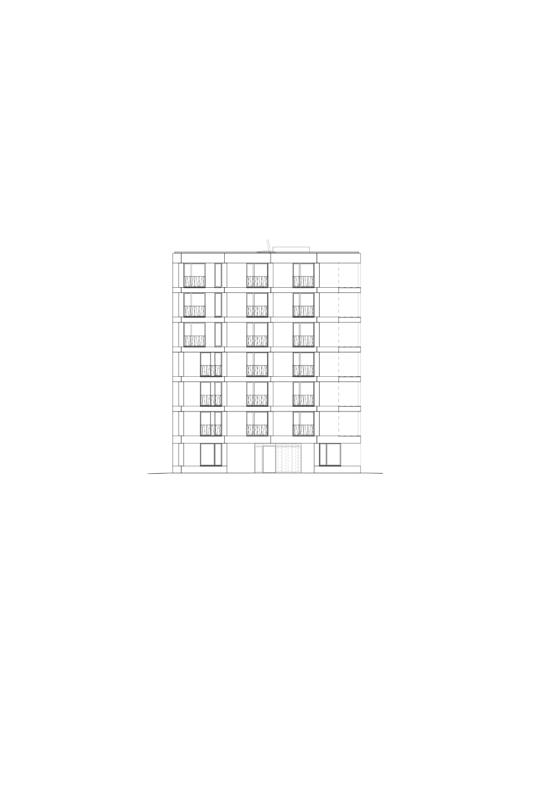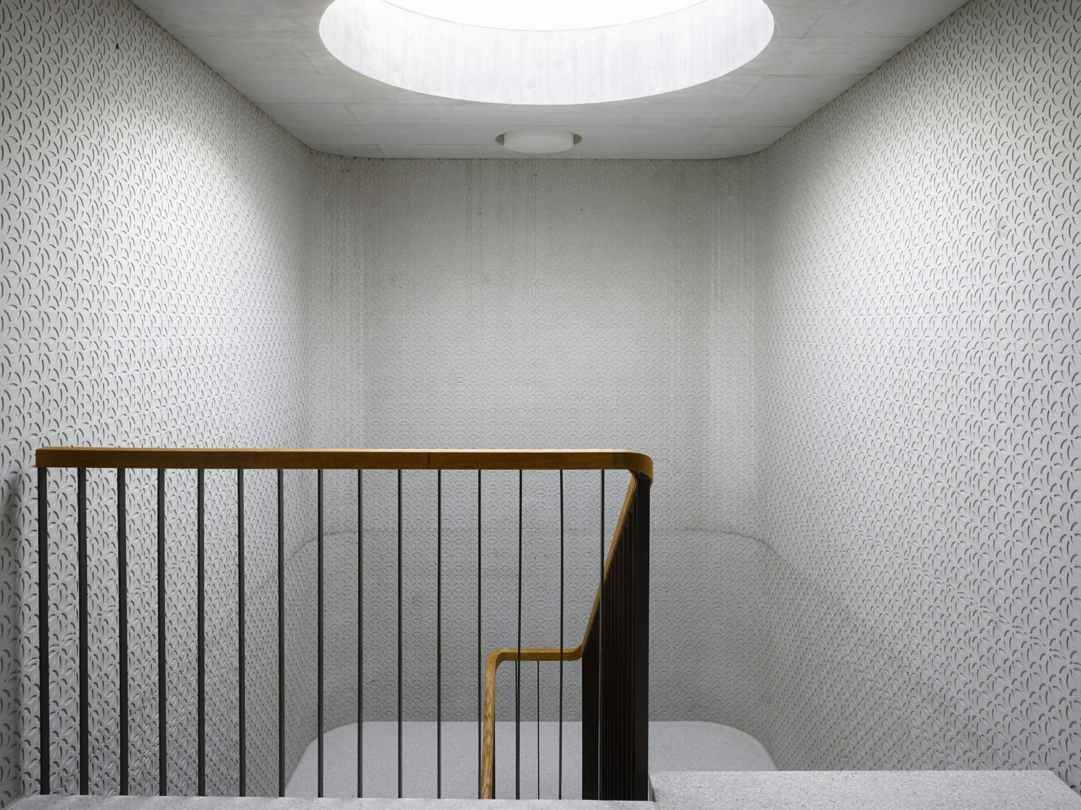 Der Eingang im Erdgeschoss des siebenstöckigen Hauses dient gleichzeitig als Zugang zu den Wohnungen und den Sitzungszimmern. Der Saal und sein Foyer sind über einen zusätzlichen Eingang nochmals separat erschlossen und können so unabhängig vom Haupteingang genutzt werden. In den Obergeschossen liegen achtzehn Wohnungen an Ecklage, die von der wunderbaren Bergaussicht profitieren. Im Gegensatz dazu steht das niedere Haus mit seinen zwölf Wohnungen im ruhigen Garten und bietet im Erdgeschoss die Möglichkeit von Gartenwohnungen. Diese Typologie entspricht jener des gegenüberliegenden bestehenden Altersheims.
