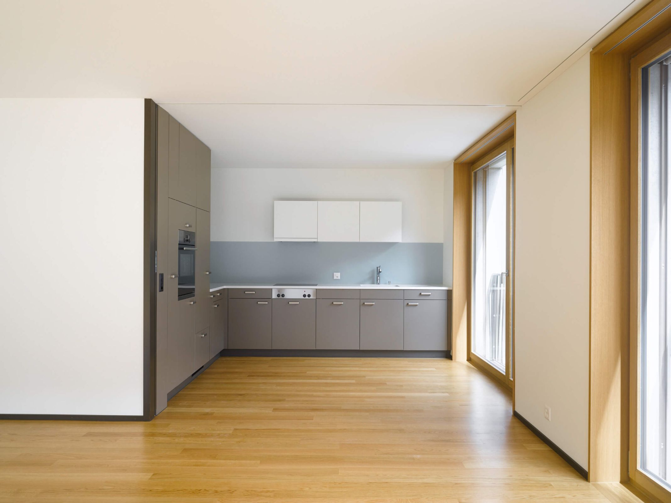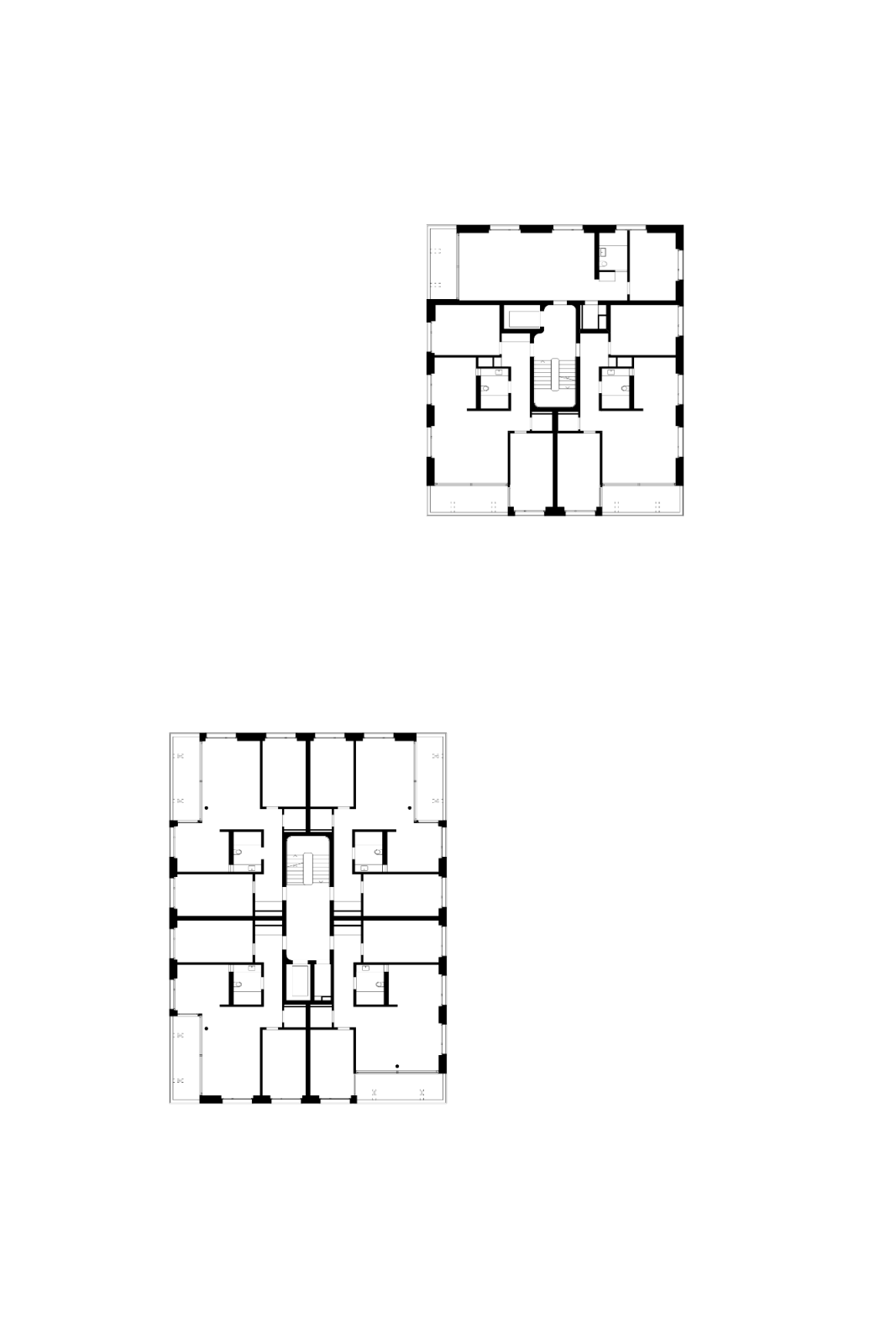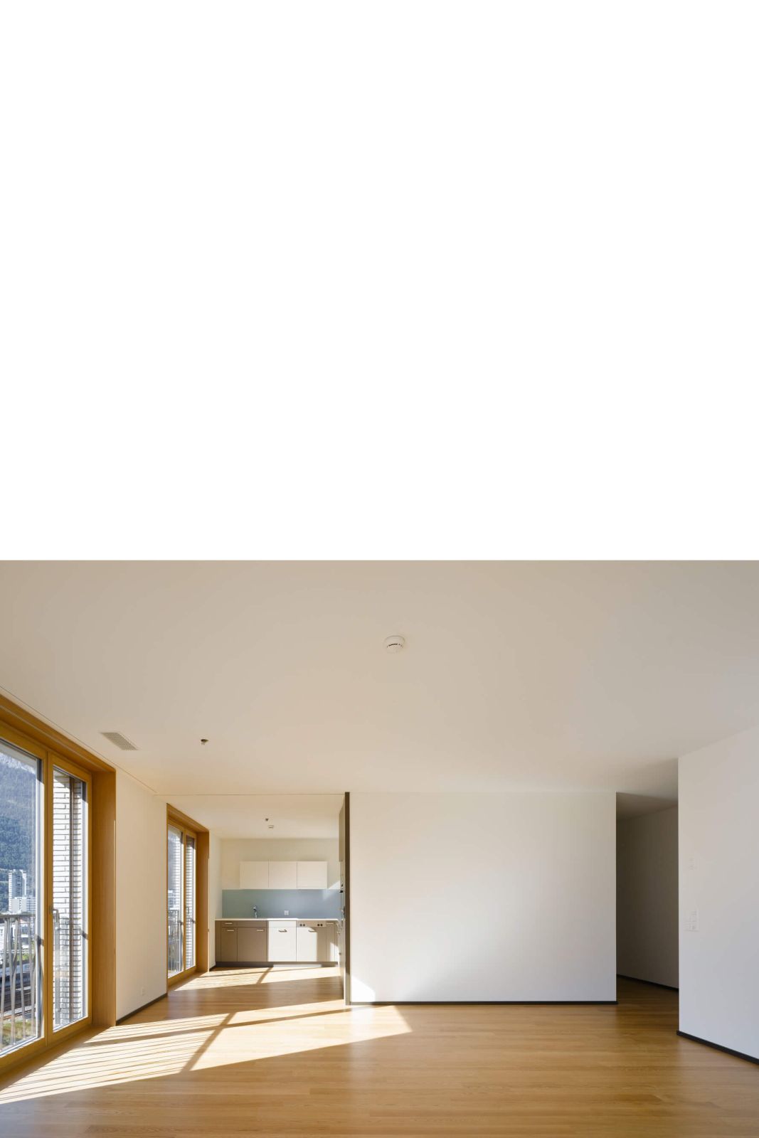 Bei beiden Häusern werden über ein innenliegendes Treppenhaus pro Geschoss je vier Wohnungen erschlossen, die alle aus zwei Himmelsrichtungen belichtet werden. Durch ein grosszügiges Entrée mit Garderobe betritt man die Wohnung, die über einen kurzen Erschliessungsgang mit angrenzender Nasszelle in einem grossen Wohnzimmer endet. Die jeweils in der Eckposition des Wohnzimmers eingeschobene Loggia macht diesen Diagonalbezug umso erlebbarer. Die Loggia ist seitlich verglast, wodurch draussen ein windgeschützter Ruheort entsteht. Zwei Küchentypen in der Wohnungswahl werden angeboten: Der eine ist räumlich mit Schiebetüren abschliessbar, der andere, offen konzipiert, bildet eine Erweiterung des Wohnzimmers. Die beiden Schlafzimmer in den Dreizimmerwohnungen spannen die Wohnung auf und ergeben somit zwei auseinanderliegende Privatsphären.