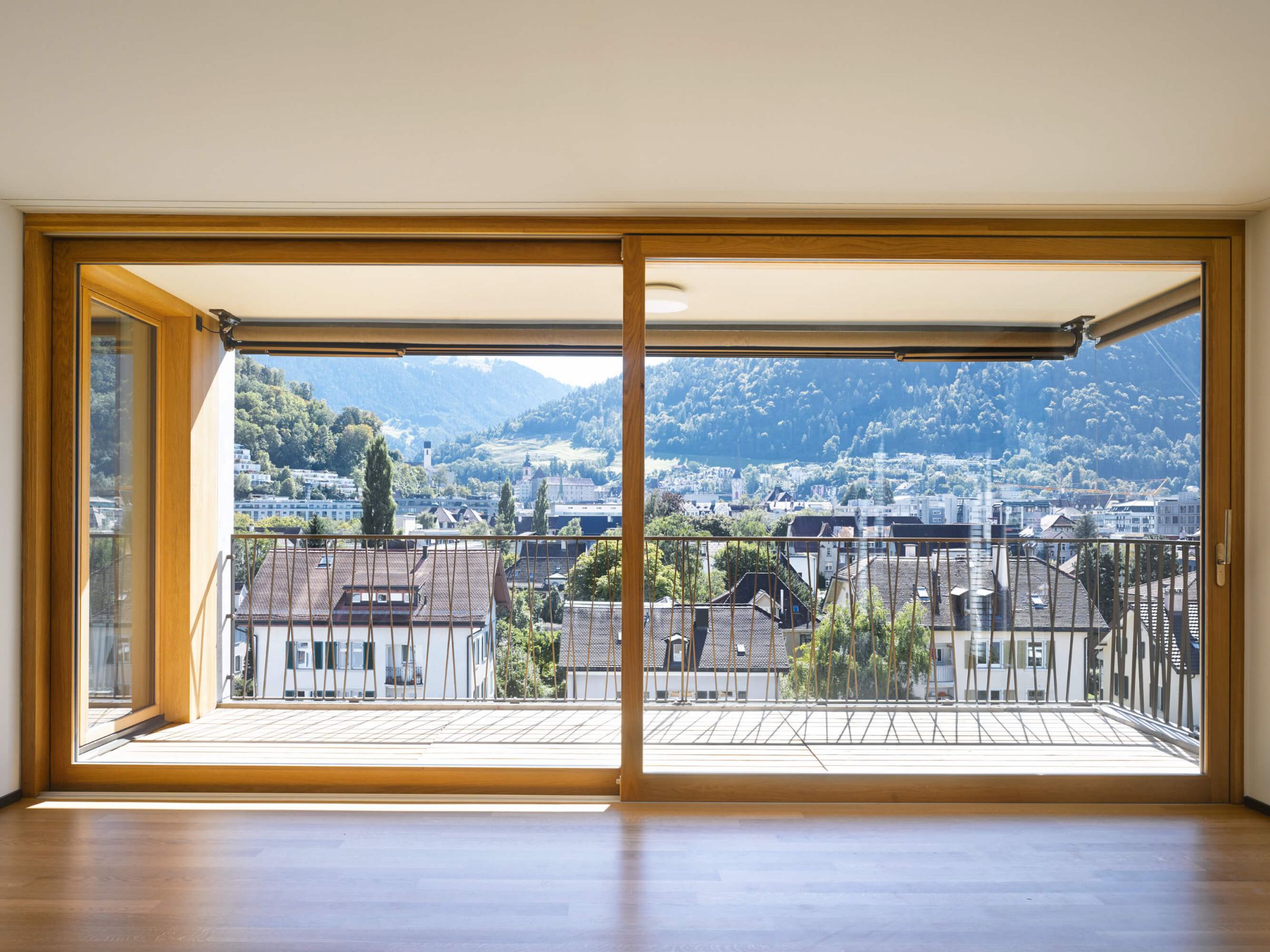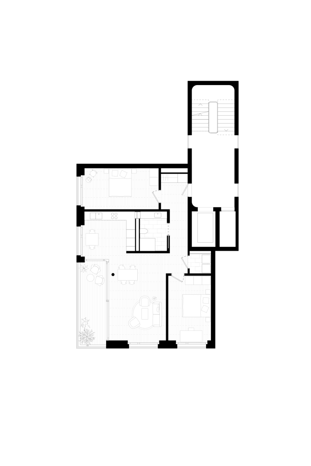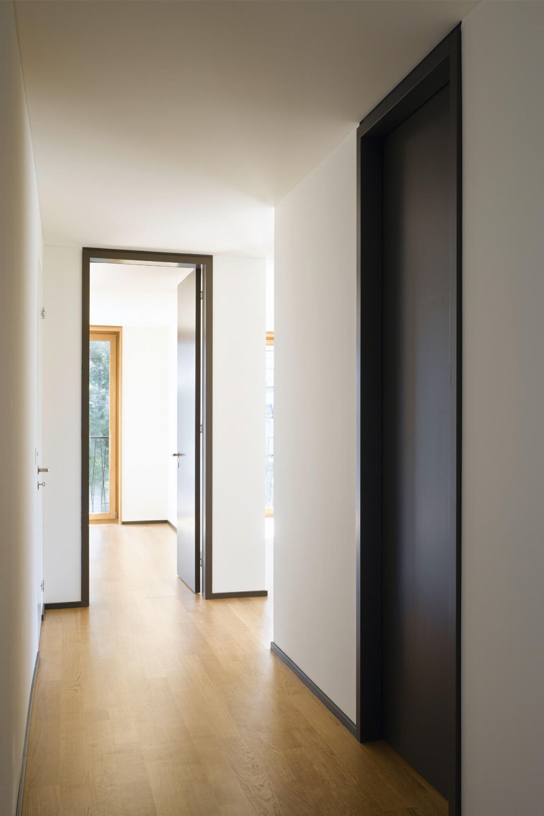 Bei beiden Häusern werden über ein innenliegendes Treppenhaus pro Geschoss je vier Wohnungen erschlossen, die alle aus zwei Himmelsrichtungen belichtet werden. Durch ein grosszügiges Entrée mit Garderobe betritt man die Wohnung, die über einen kurzen Erschliessungsgang mit angrenzender Nasszelle in einem grossen Wohnzimmer endet. Die jeweils in der Eckposition des Wohnzimmers eingeschobene Loggia macht diesen Diagonalbezug umso erlebbarer. Die Loggia ist seitlich verglast, wodurch draussen ein windgeschützter Ruheort entsteht. Zwei Küchentypen in der Wohnungswahl werden angeboten: Der eine ist räumlich mit Schiebetüren abschliessbar, der andere, offen konzipiert, bildet eine Erweiterung des Wohnzimmers. Die beiden Schlafzimmer in den Dreizimmerwohnungen spannen die Wohnung auf und ergeben somit zwei auseinanderliegende Privatsphären.