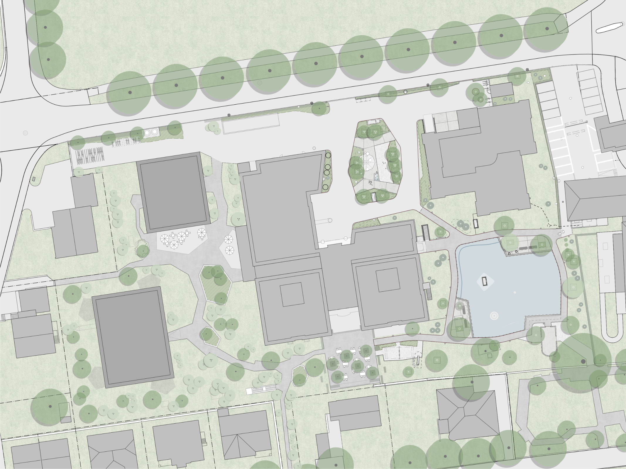 Dank des kleinen Footprints der beiden Gebäude ist die Qualität der wunderbaren Gartenanlage in ihrer ganzen Ausdehnung erlebbar. Der neue Garten wird mit grossen, von einer flachen Stampfbetonbank umrandeten Blumenbeeten und mit niedrigen Hortensien und Magnolienbüschen bepflanzt. Dazwischen ist ein Wegnetz angelegt, das mit der bestehenden Gartenanlage verknüpft wird, was kleine und grössere Spaziergänge möglich macht. Zu den Gartenwohnungen gehören einzelne befestigte Inseln als private Aussenzonen, die, in einer ähnlichen Formensprache wie die Blumenbeete gestaltet, vom öffentlichen Garten umgeben sind.