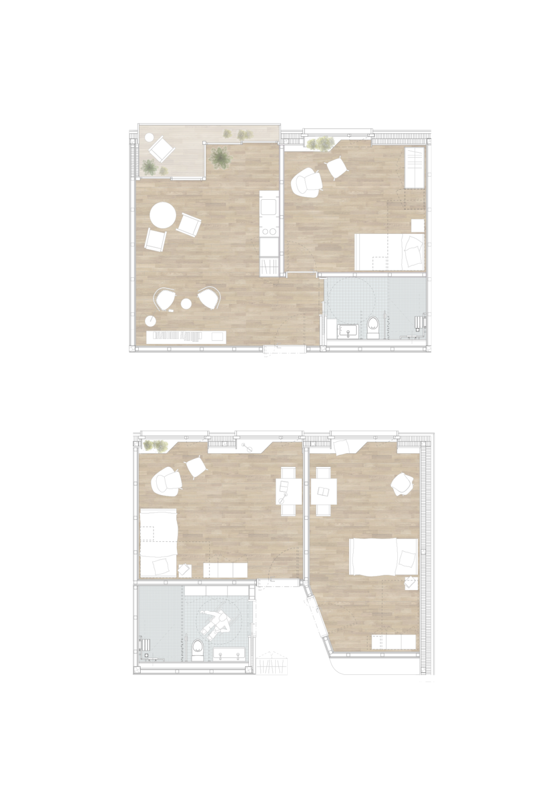Die Gebäudefigur entwickelt sich entsprechend der Erdgeschossnutzung vom öffentlichen in die privateren, rückwärtigen Bereiche des Grundstücks. Finden sich entlang der Wohnstrasse im viergeschossigen Ostflügel der autonome Hauszugang der Wohnungen, die Anlieferung und Küche, so orientiert sich der dreigeschossige Westflügel mit den Pflegewohngruppen zum verkehrsberuhigten, beschaulichen Siedlungsrand. Dazwischen spannt sich ein kleiner, besonnter Gartenhof auf, welcher einen intimen Rahmen bietet und von den Cafébesuchern ebenfalls genutzt werden kann.