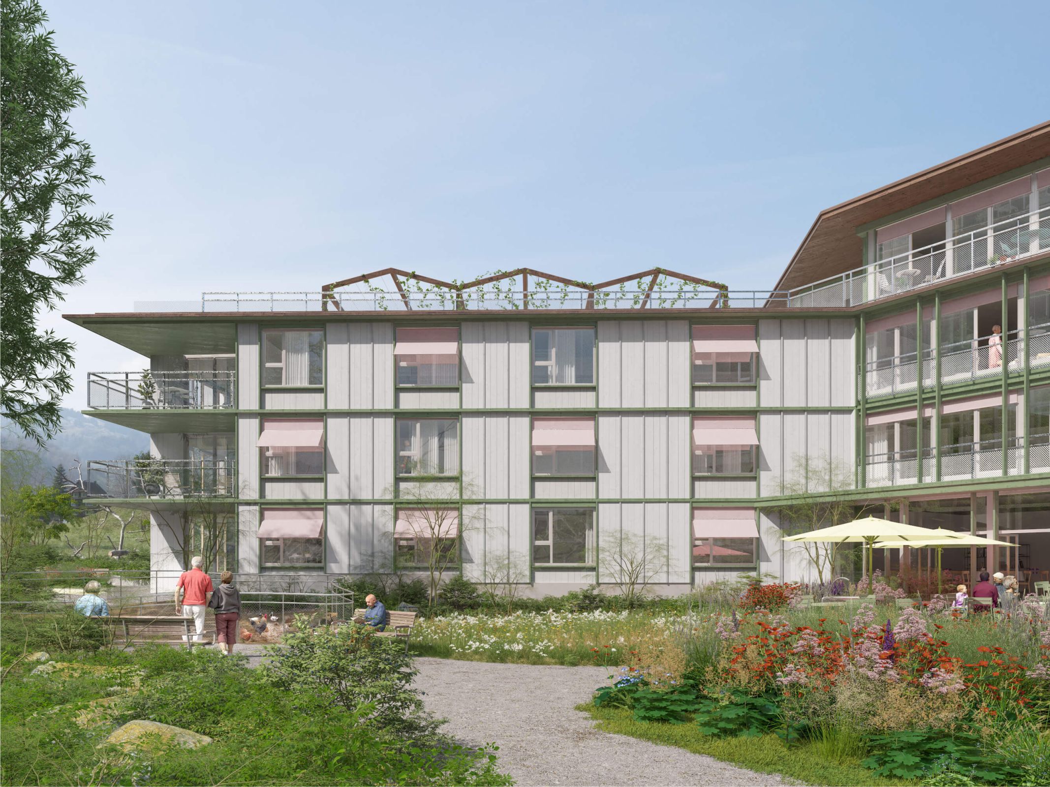 Als Ankerpunkt und Auftakt fungiert die bestehende Buchengruppe. Selbstbewusst umschliesst der Eingangstrakt mit Restaurant den Platz und markiert eine hohe Präsenz zum Dorfzentrum. Weil das Alterszentrum nicht nur ein Wohnheim ist, sondern auch ein Café, einen Laden und Wohnungen hat, ist es ein öffentliches Haus. Dies soll betont und ausgebaut werden. Der Haupteingang wird an die Strasse geschoben und der Platz mit Café hat das Potential, zu einem Treffpunkt im Quartier zu werden.