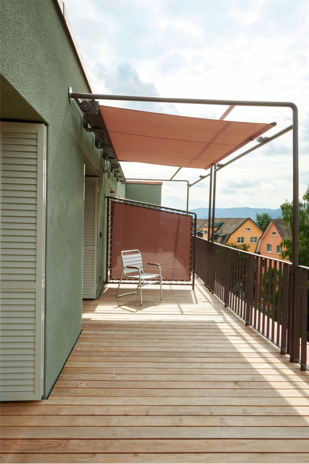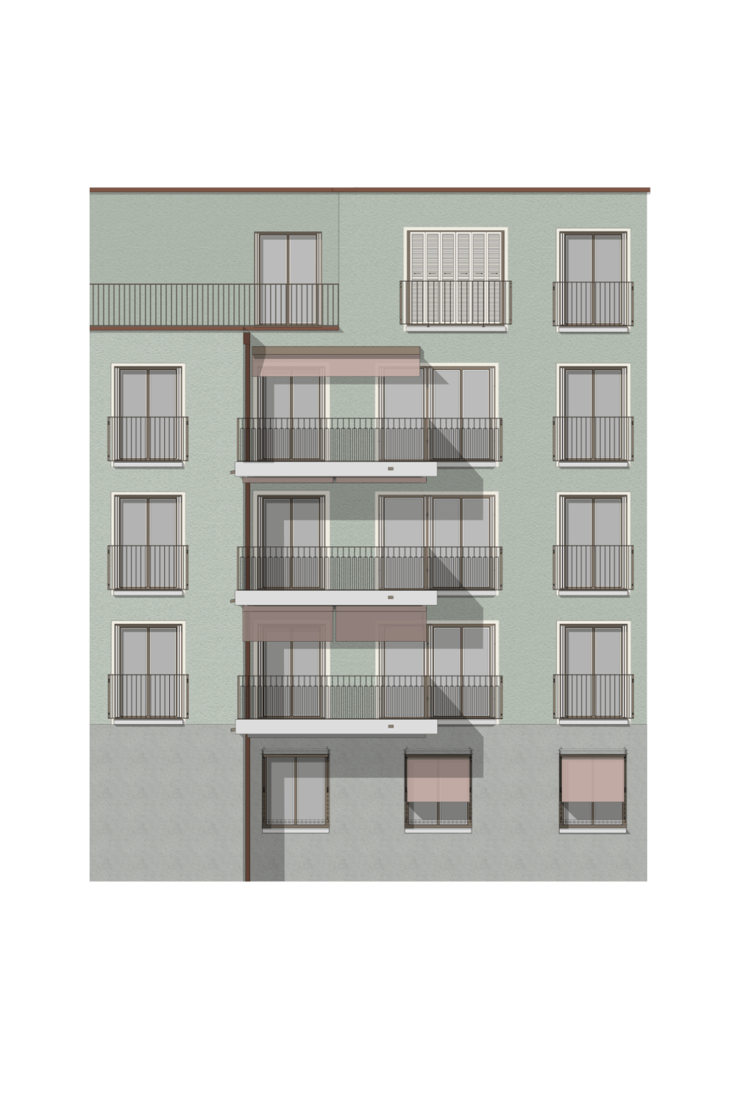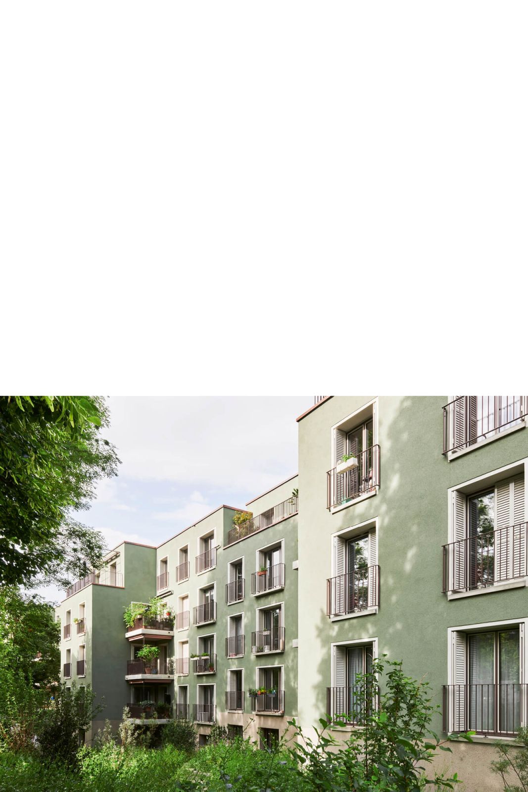Eingänge, Fensterproportionen, Sonnenschutz und Balkone, Fenstergeländer, Faltläden und Fenstereinfassungen erzeugen ein Zusammenspiel, welches den Gesamteindruck der Fassade prägt.