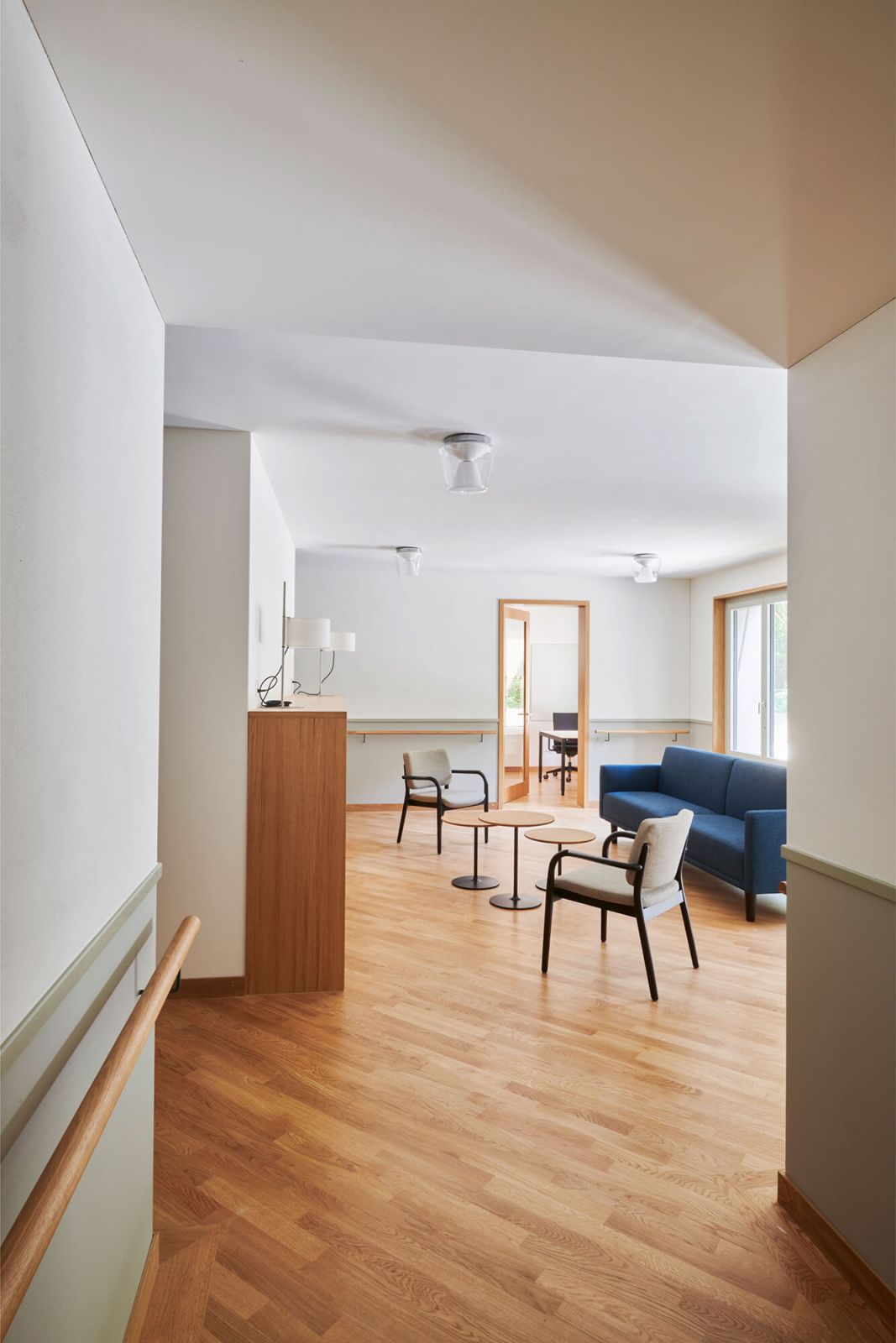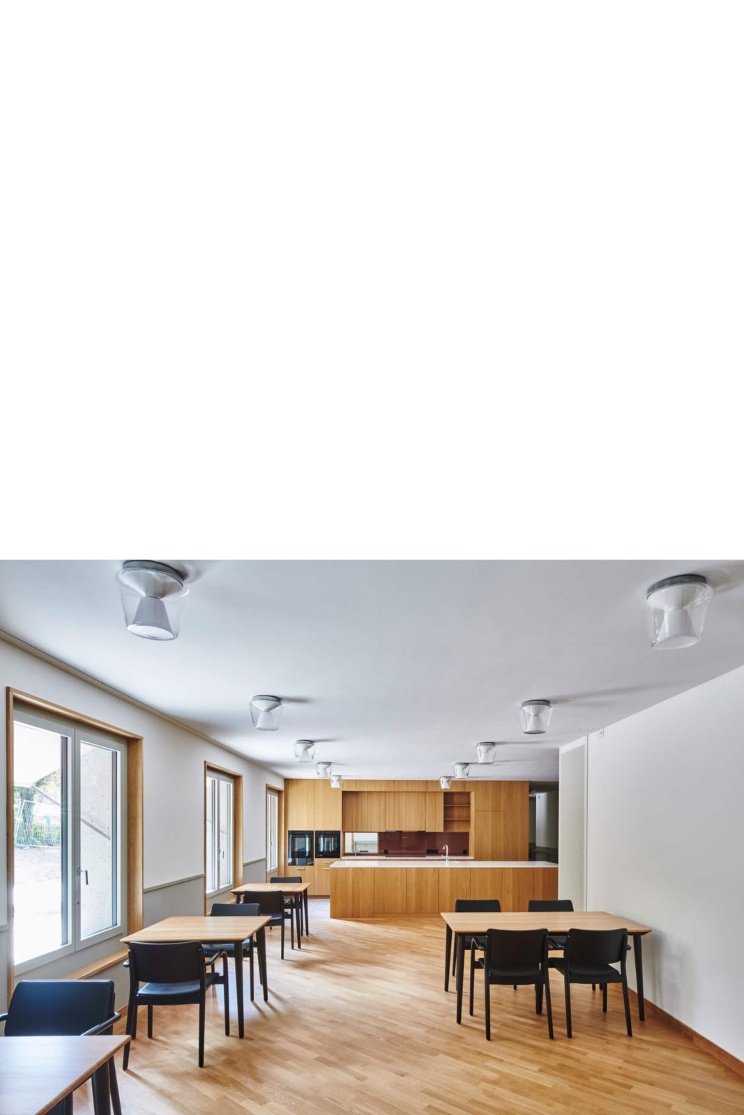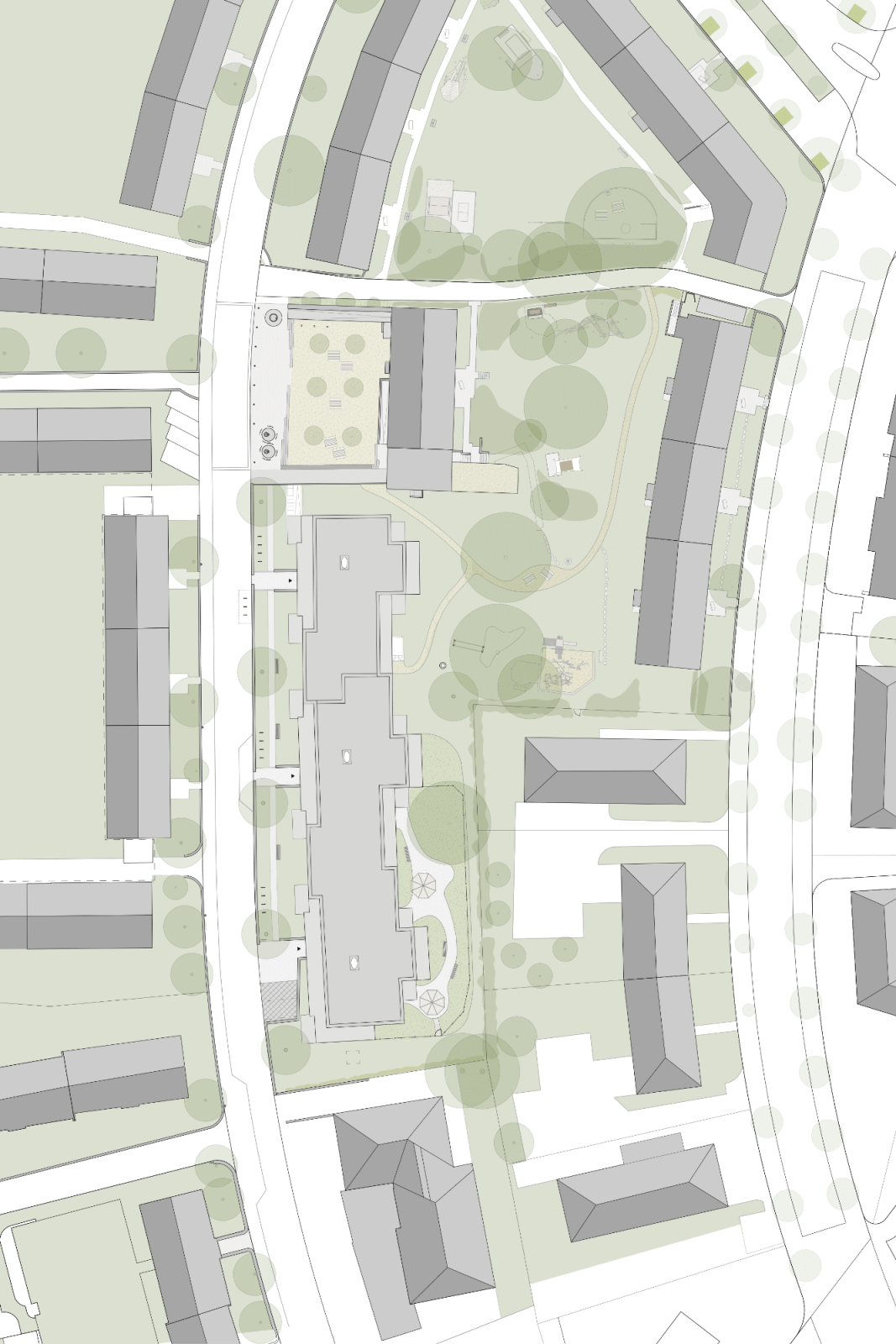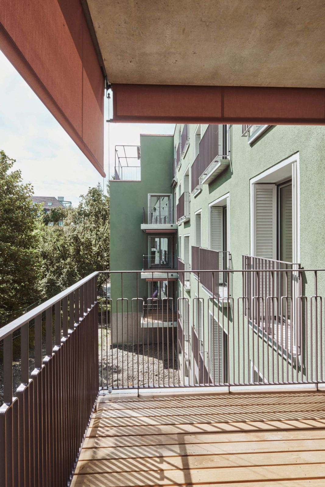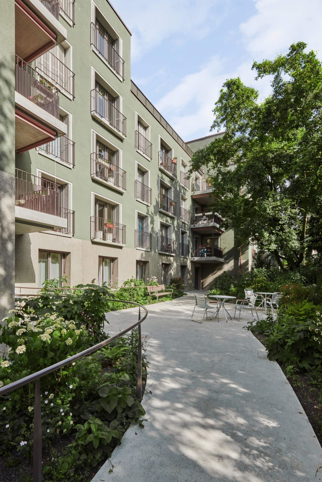 Die Gestaltung des Aussenraumes nimmt den quartiertypischen Charakter auf. Sockelmauern grenzen den Strassenraum subtil vom halböffentlichen Vorbereich ab. Bäume spenden Schatten und begleiten die Strasse. Der hofseitige Grünhof öffnet sich nach Osten hin. Der geschützte Garten für die Alterswohngemeinschaft fügt sich durch seine organische Form und die Bepflanzung in die Umgebung ein.
