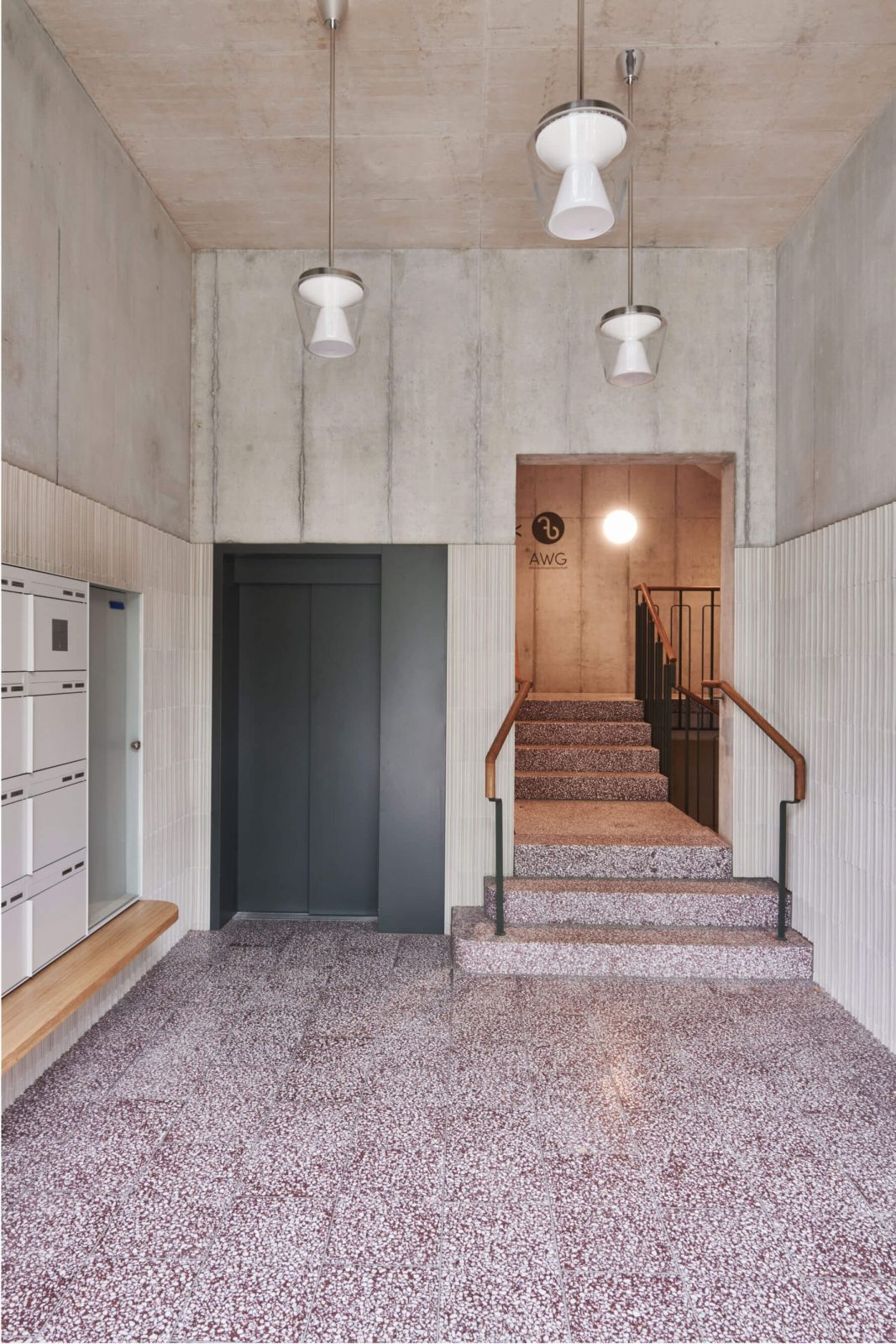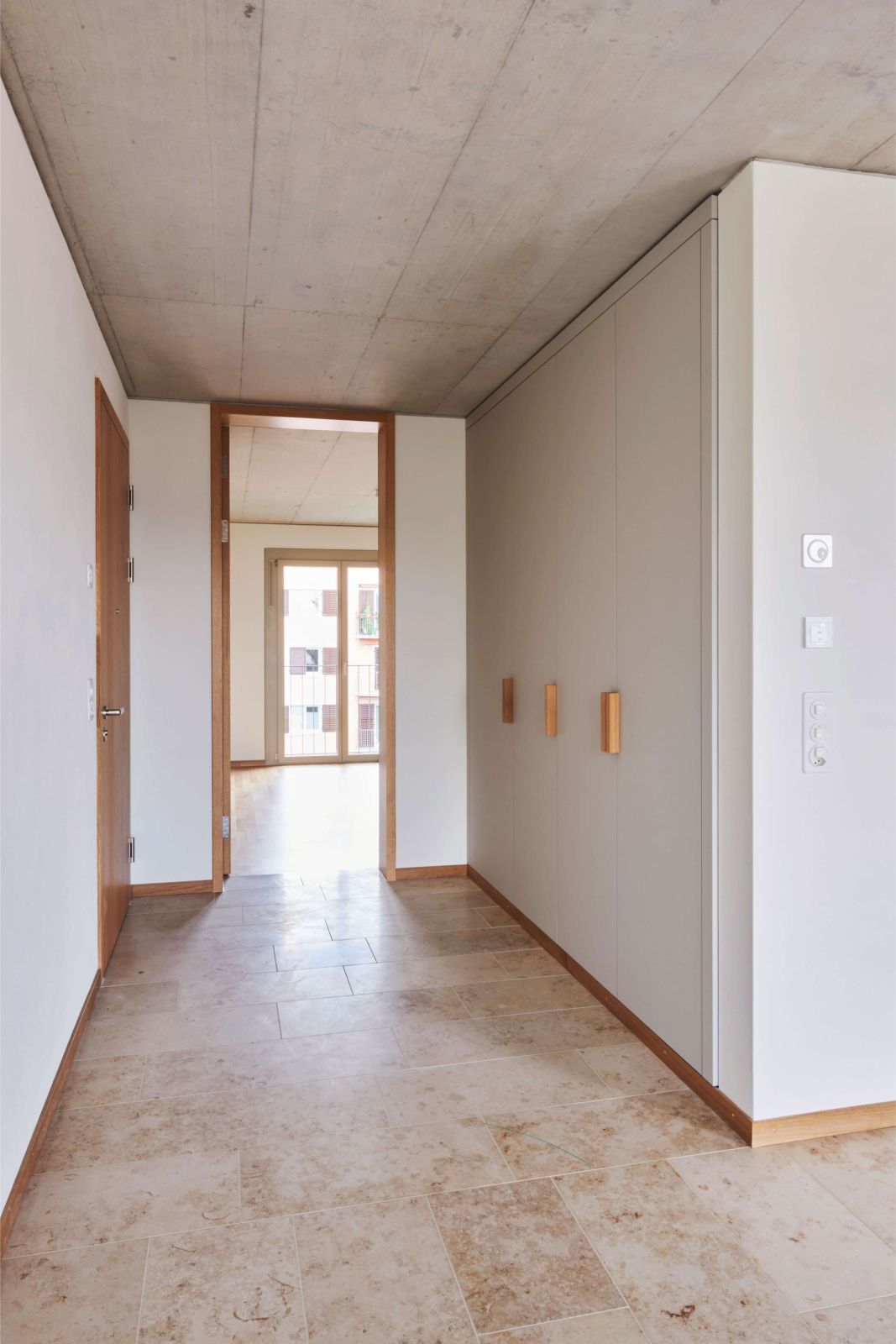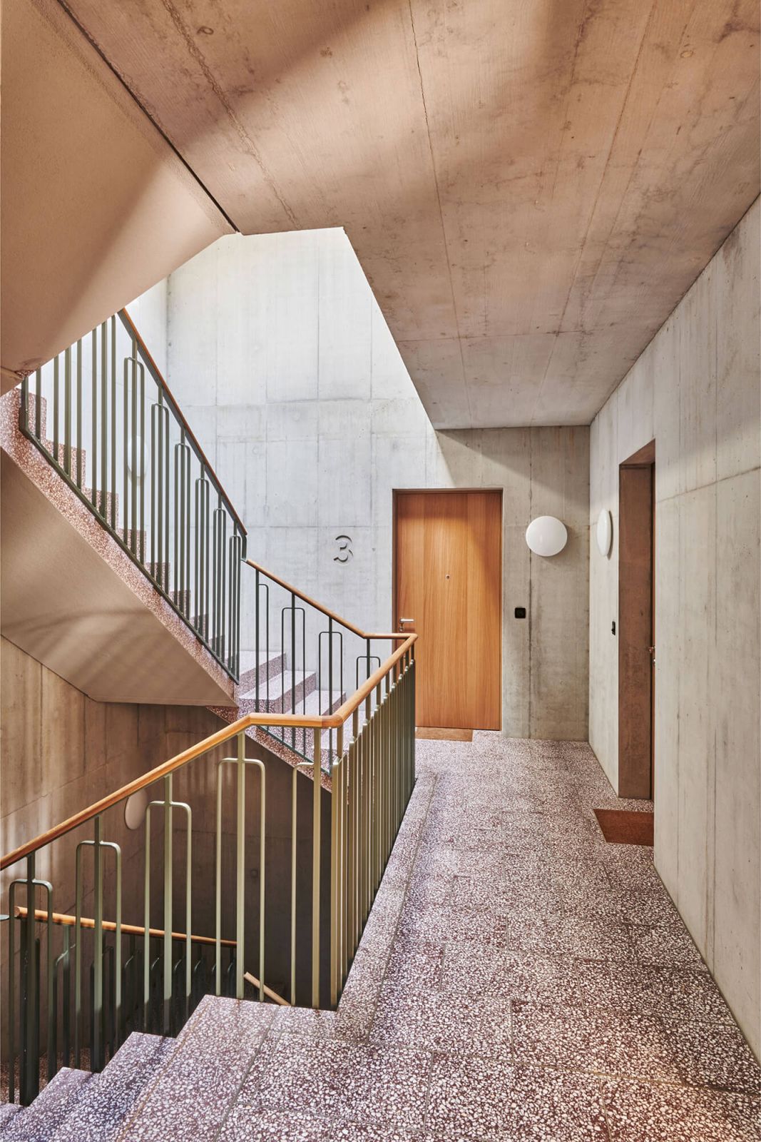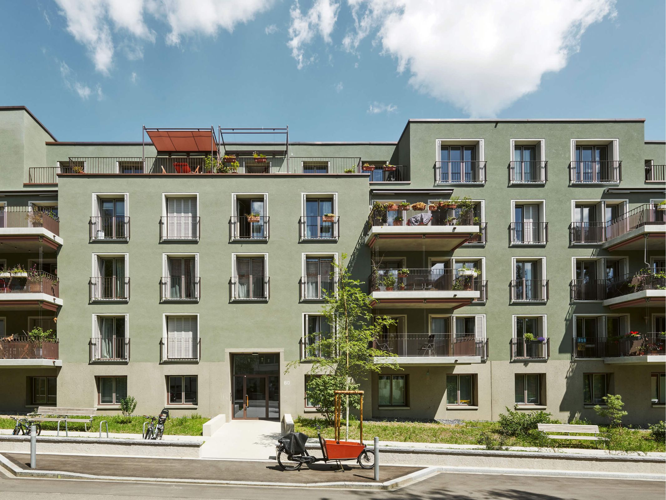 Die Erschliessung der Wohnungen erfolgt über drei Treppenhäuser mit Lift. Die Nutzungen in Keller/Haustechnik im Untergeschoss, Alterswohngemeinschaft sowie separate Zimmer im Erdgeschoss und vier Wohngeschossen sind in horizontaler Gliederung angelegt, wobei die Wohngeschosse als Drei- und Vier-Spänner konzipiert sind. Bewusst wurde eine Durchmischung von Klein- und Familienwohnungen angestrebt. So sind insgesamt 41 Wohnungen entstanden, bei denen auf ein vielfältiges Angebot, eine gute Orientierung und eine klare Zonierung geachtet wurde.