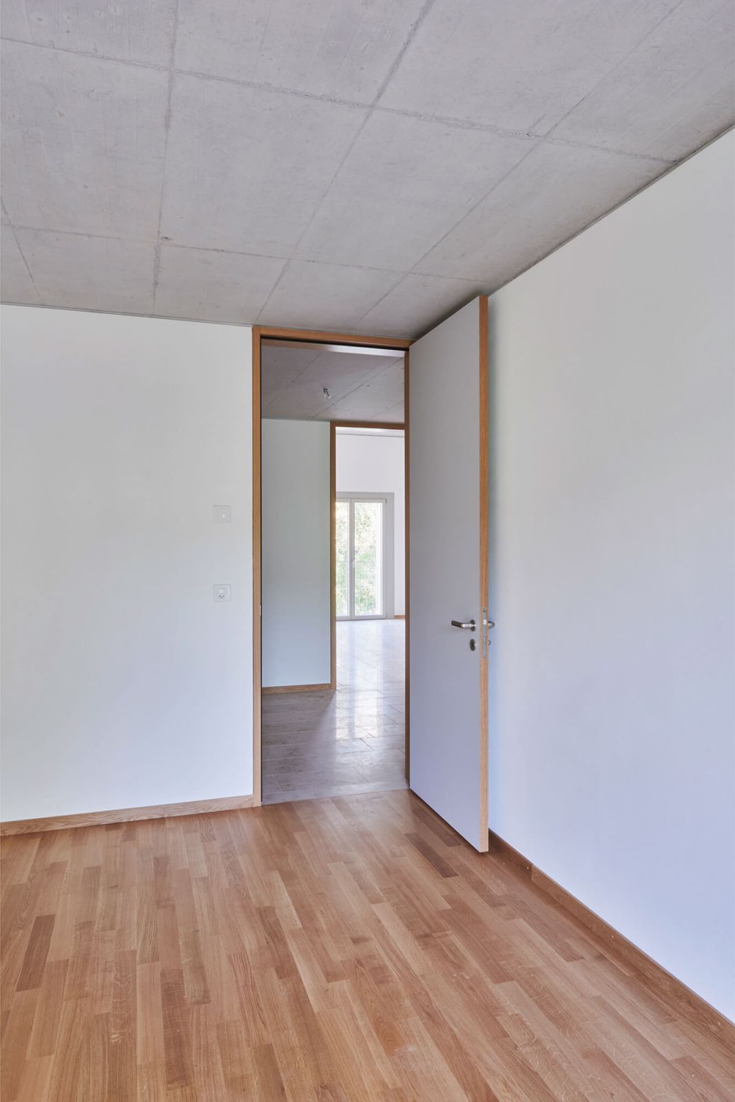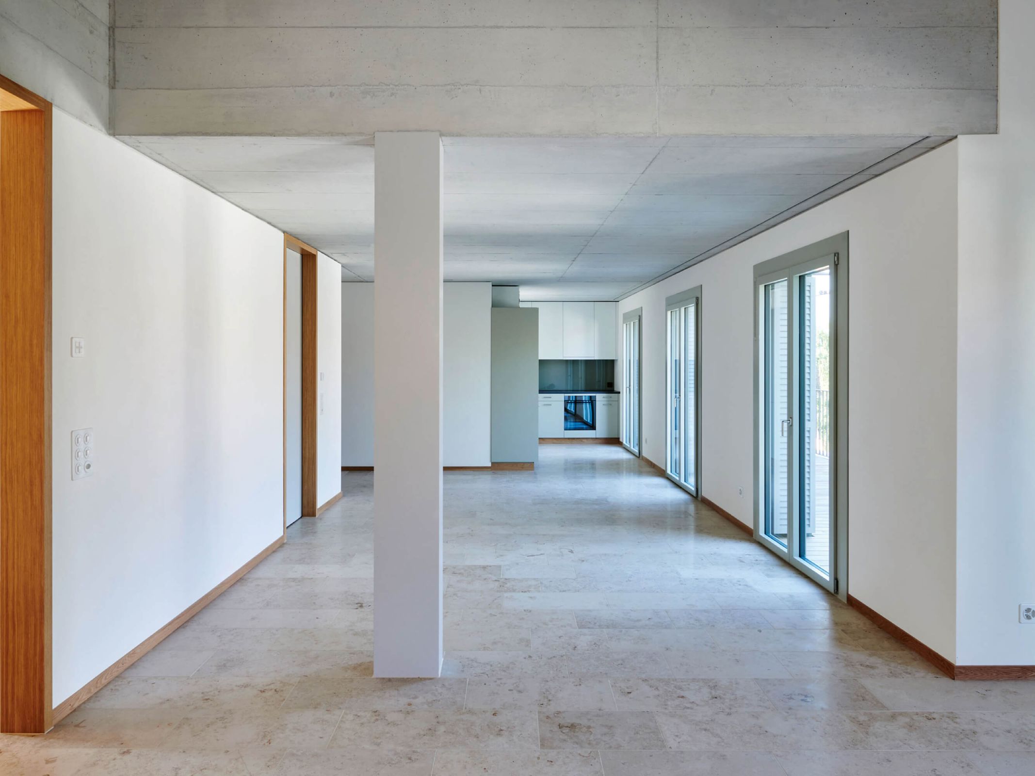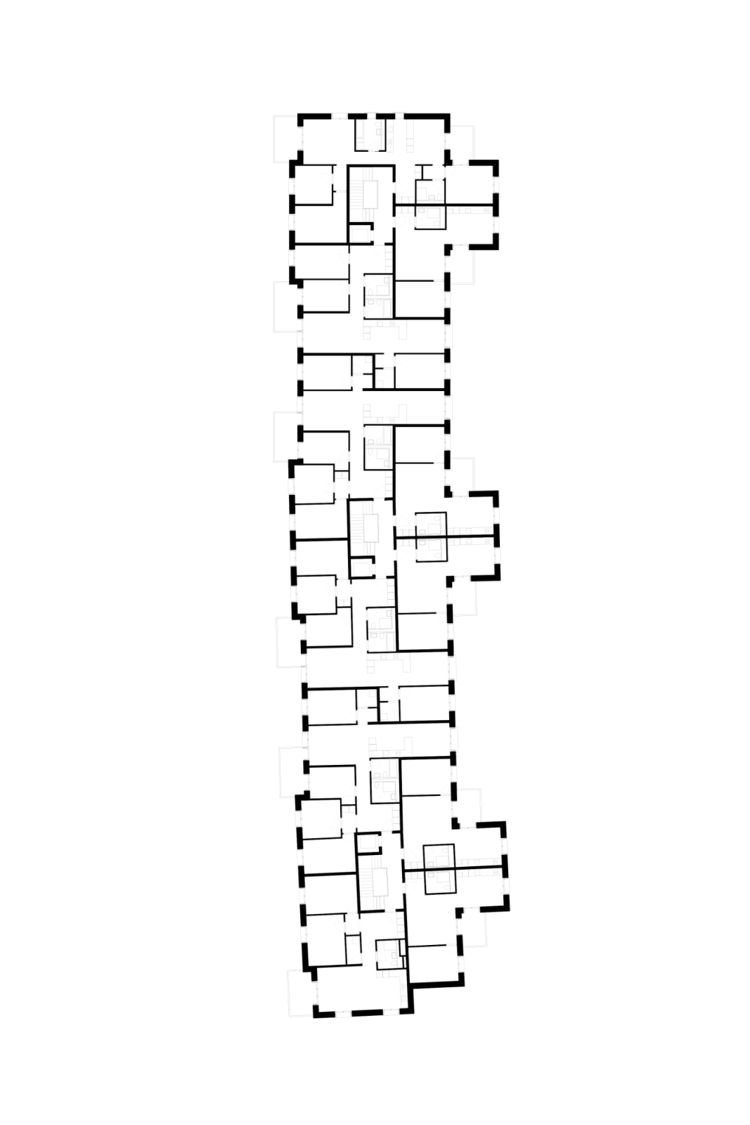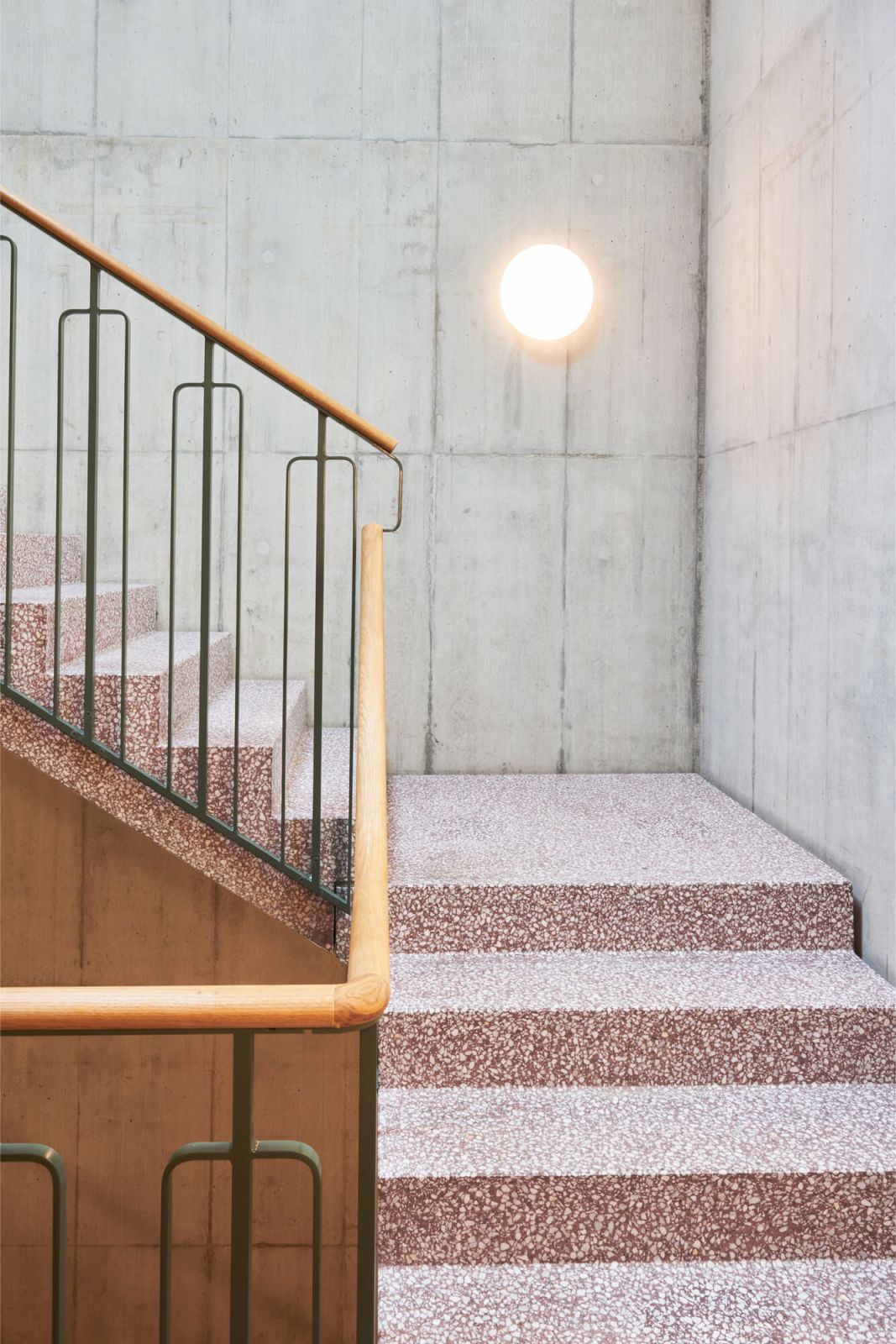 Die Erschliessung der Wohnungen erfolgt über drei Treppenhäuser mit Lift. Die Nutzungen in Keller/Haustechnik im Untergeschoss, Alterswohngemeinschaft sowie separate Zimmer im Erdgeschoss und vier Wohngeschossen sind in horizontaler Gliederung angelegt, wobei die Wohngeschosse als Drei- und Vier-Spänner konzipiert sind. Bewusst wurde eine Durchmischung von Klein- und Familienwohnungen angestrebt. So sind insgesamt 41 Wohnungen entstanden, bei denen auf ein vielfältiges Angebot, eine gute Orientierung und eine klare Zonierung geachtet wurde.