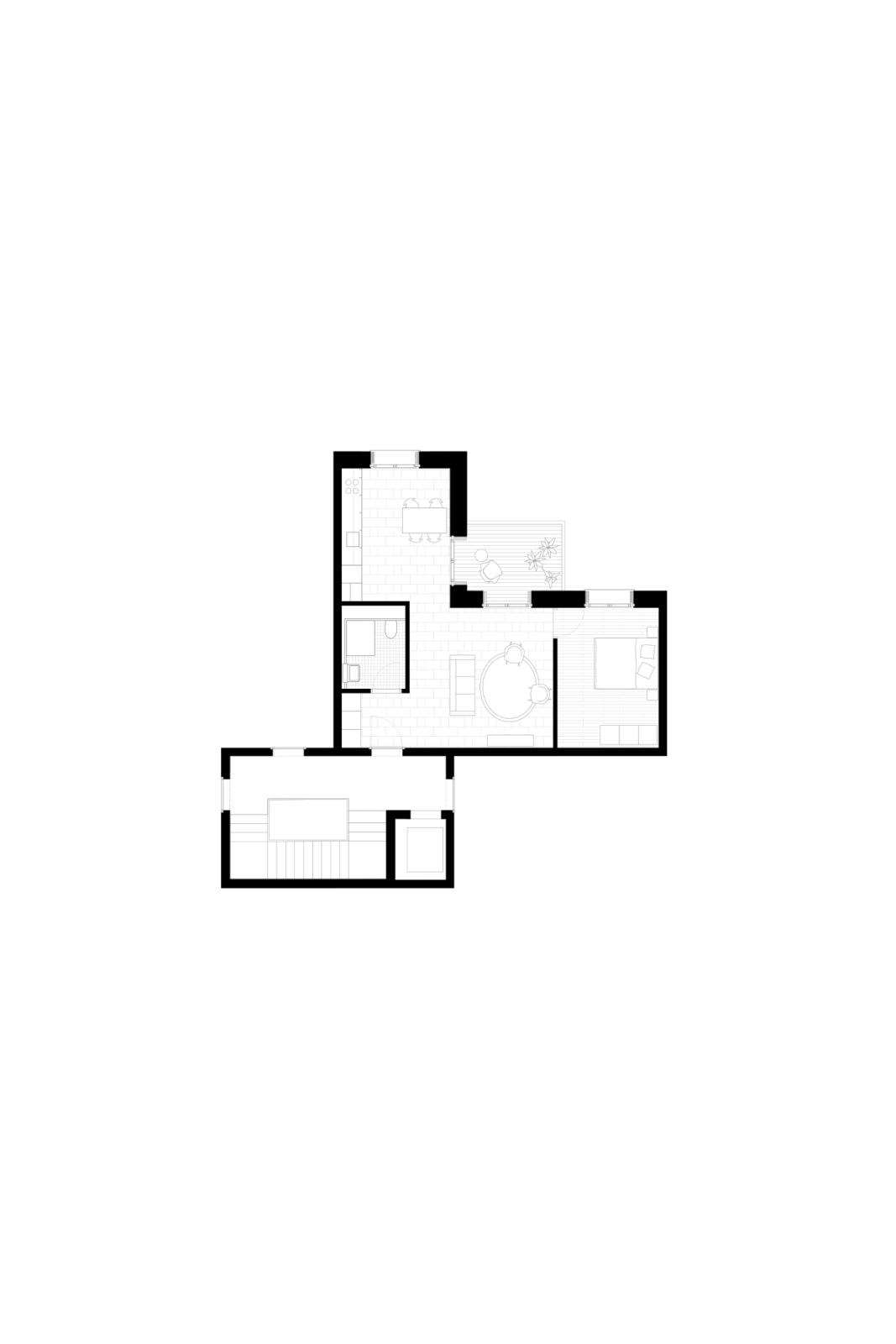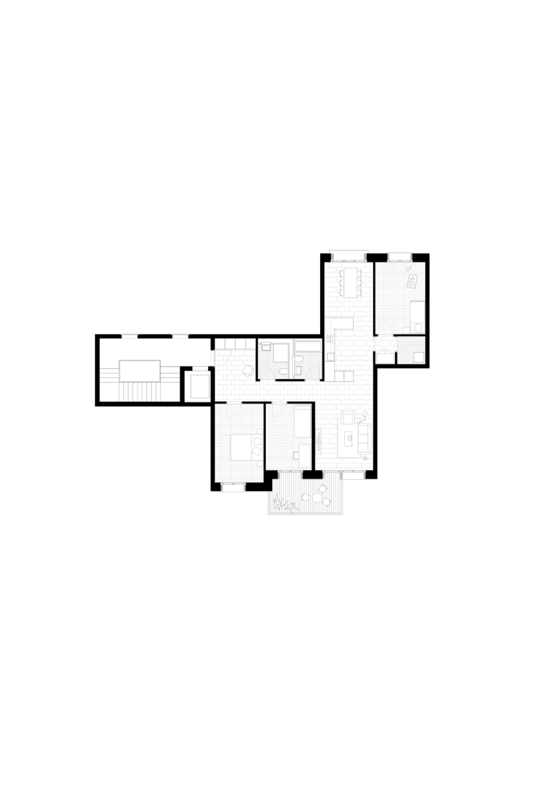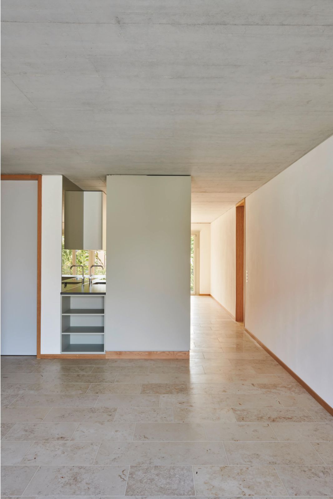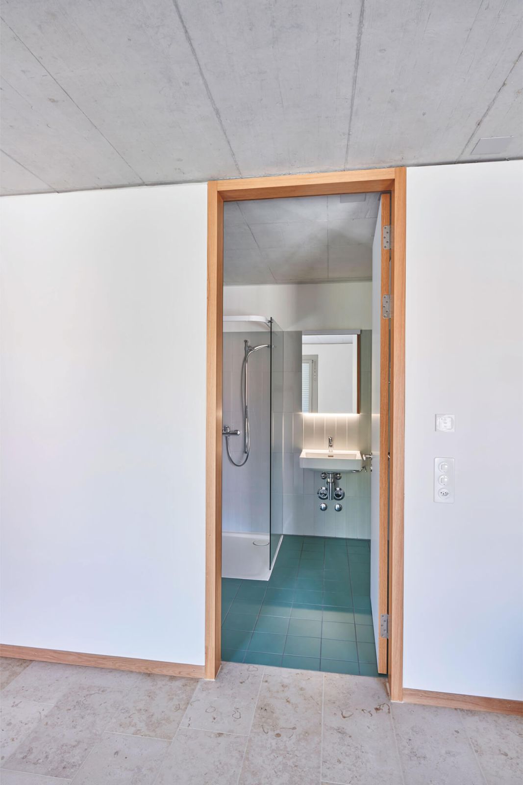 Die Erschliessung der Wohnungen erfolgt über drei Treppenhäuser mit Lift. Die Nutzungen in Keller/Haustechnik im Untergeschoss, Alterswohngemeinschaft sowie separate Zimmer im Erdgeschoss und vier Wohngeschossen sind in horizontaler Gliederung angelegt, wobei die Wohngeschosse als Drei- und Vier-Spänner konzipiert sind. Bewusst wurde eine Durchmischung von Klein- und Familienwohnungen angestrebt. So sind insgesamt 41 Wohnungen entstanden, bei denen auf ein vielfältiges Angebot, eine gute Orientierung und eine klare Zonierung geachtet wurde.