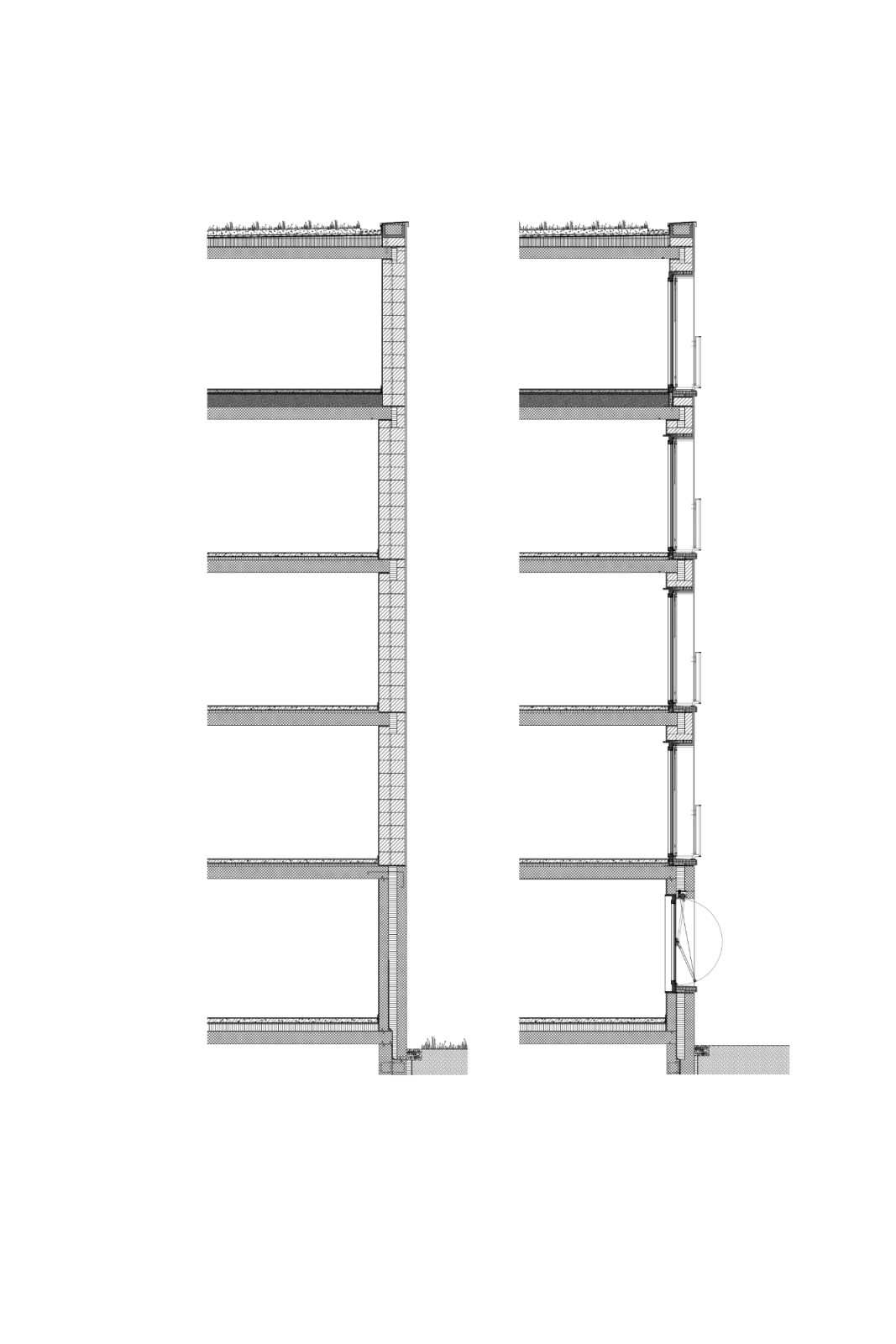 Die Gliederung des Hauses in Sockelgeschoss, drei Obergeschosse und Dachgeschoss orientiert sich an der Struktur der bestehenden Bauten. Dies wird durch eine regelmässige, ruhige Fenstereinteilung verstärkt. Die an die Gebäudeecken angefügten Balkone lockern den muralen Charakter des Gebäudes auf. Den bestehenden Siedlungsbauten entsprechend, wurde eine verputzte Aussenhaut aus Kratzputz realisiert. Die konstruktive Umsetzung erfolgte über ein Einsteinmauerwerk.