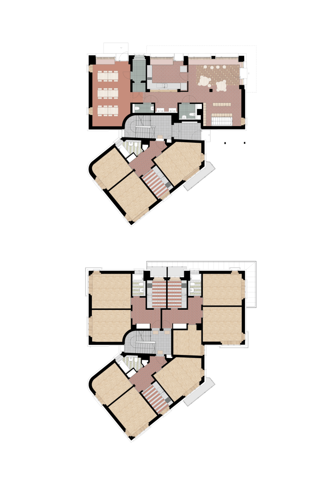 Für die Instandsetzung gilt als oberste Priorität der Erhalt von möglichst günstigem Wohnraum. Mit reduzierten Eingriffen möchten wir vorhandene Qualitäten beibehalten und in sensibler Symbiose mit dem Bestand und seiner Umgebung neue Qualitäten ermöglichen.