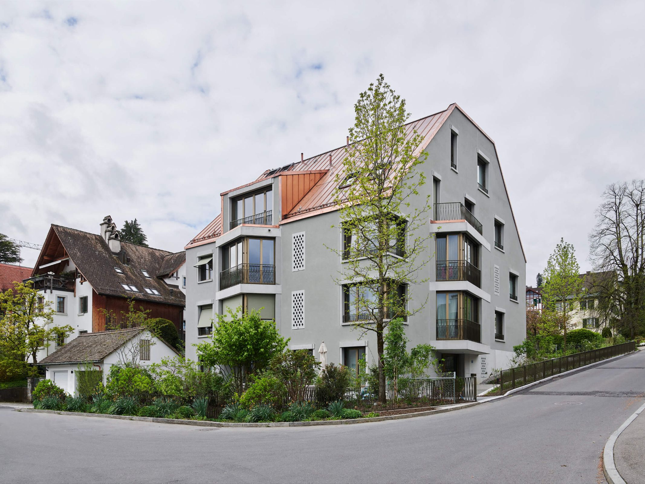Dadurch kann auf der Ostseite bereits eine kleine Gartenwohnung freigespielt werden. Auf den oberen Geschossen erstrecken sich die Wohnungen von Ost nach West, von der See- zur Abendsonnenseite. Dabei profitieren zwei weitere Wohnungen im 1. Obergeschoss von einem privaten Gartensitzplatz; insgesamt werden sieben Wohnungen erstellt.