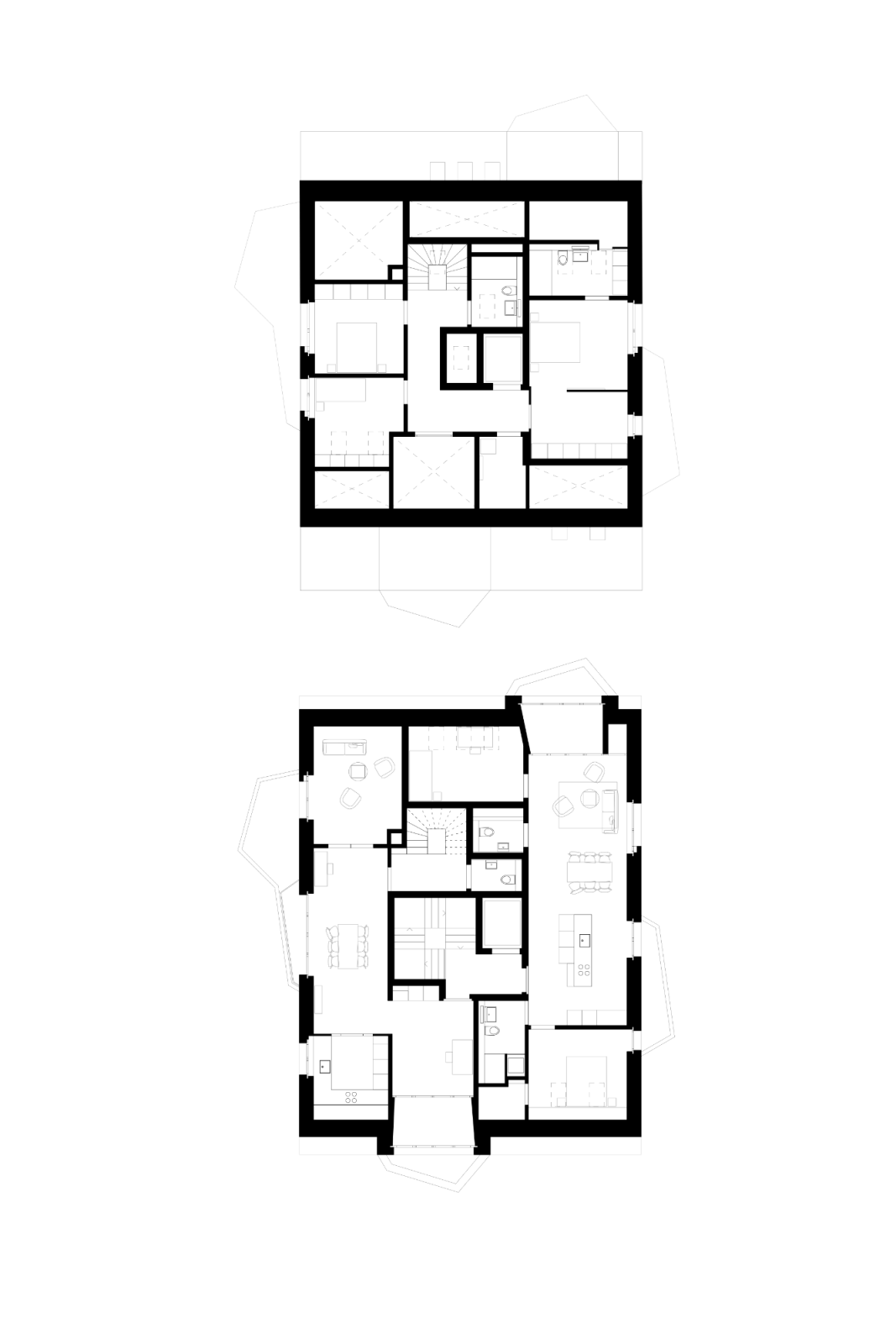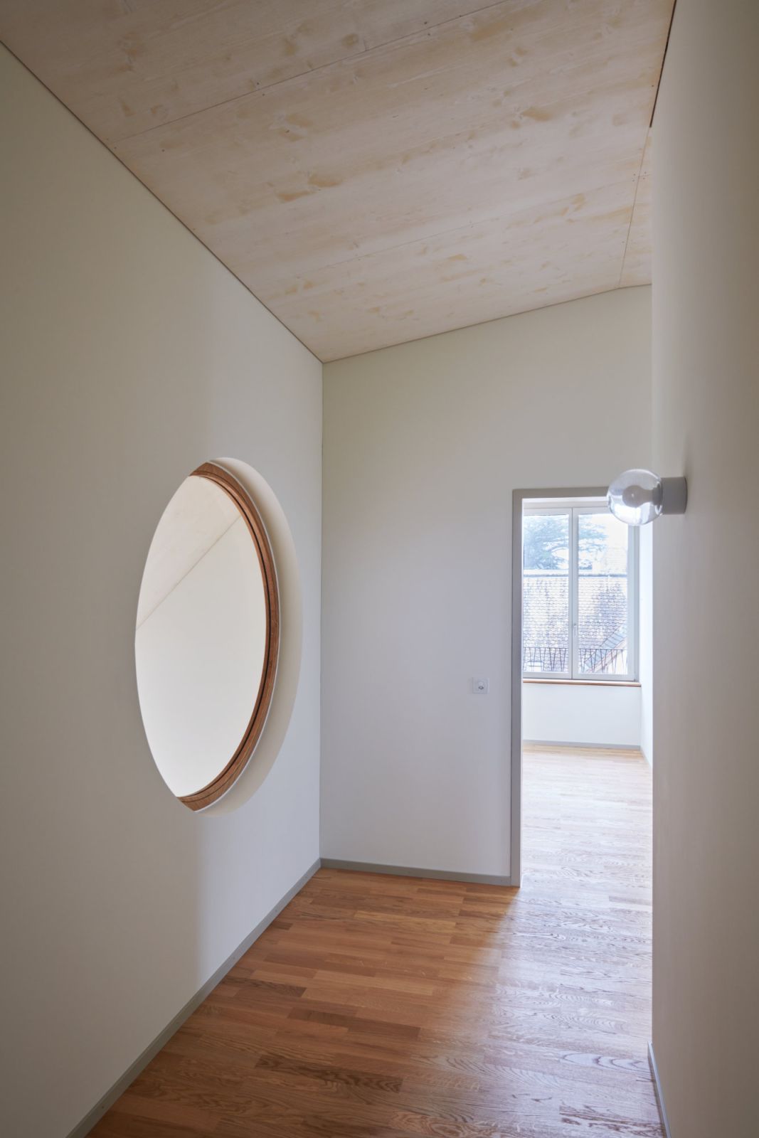 Das Quartier am Turnhallenweg ist geprägt von herrschaftlichen Einfamilien- und Mehrfamilienhäusern mit ihren durchgrünten Privatgärten. Schulhaus und Kernzone des Ortes befinden sich in unmittelbarer Nähe. Die Volumetrie des Neubaus mit seinem parallel zum Hang ausgerichteten First reagiert selbstbewusst auf die Ecksituation und die ansteigende Topografie. Verschieden hohe Erker zeichnen das Haus aus und geben ihm eine vielfältige Gestalt.