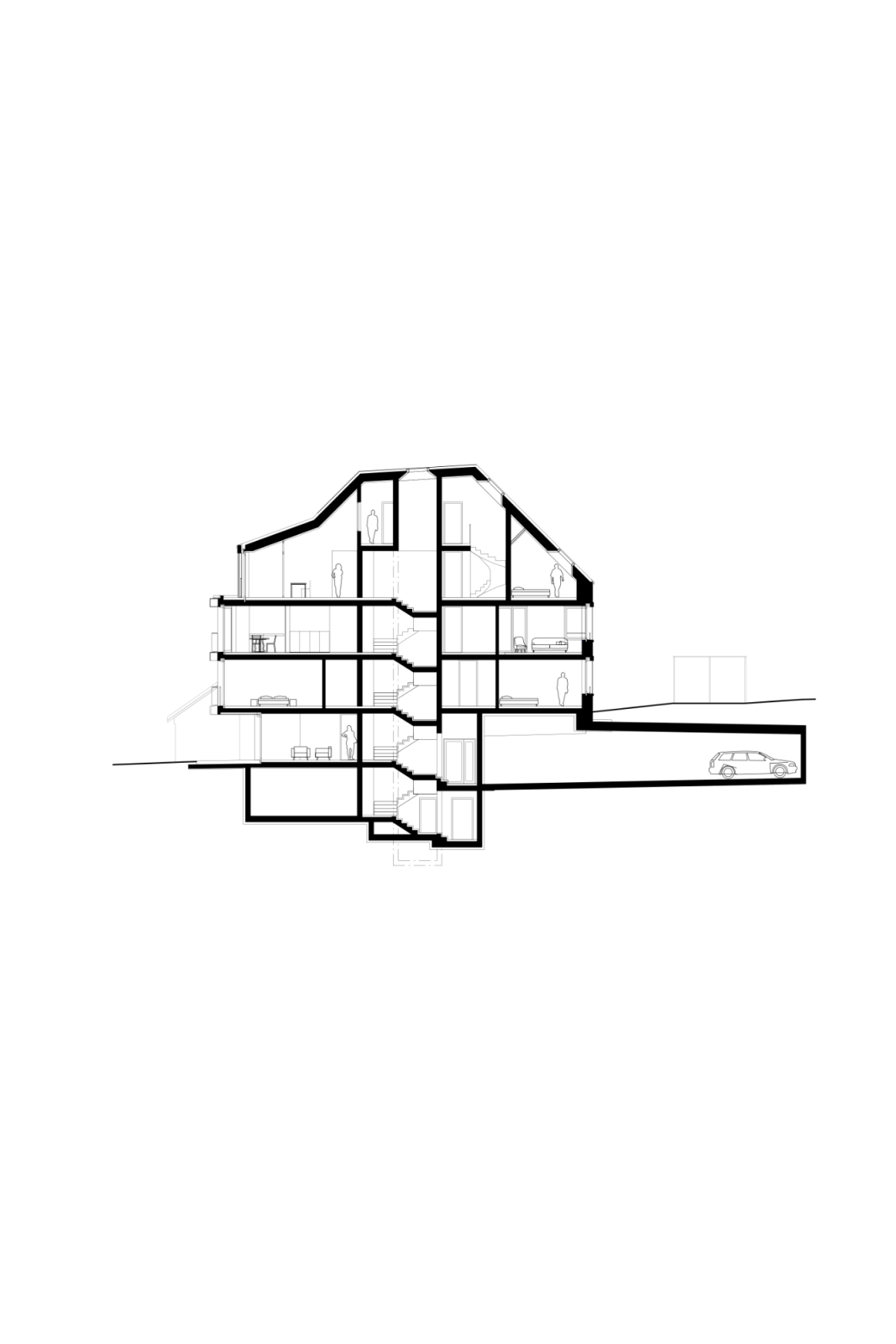 Die Einfahrt zur Tiefgarage befindet sich am bestehenden Standort des Garagenhauses. Ein vielfältiges Raumangebot vom Studio bis zur 5.5-Zimmerwohnung verspricht eine gute Durchmischung der Bewohnerschaft. Die grosse Wohnung im Dachgeschoss entwickelt sich über zwei Geschosse. Die Dachform erlaubt eine optimale Belichtung auch der oberen Räume.