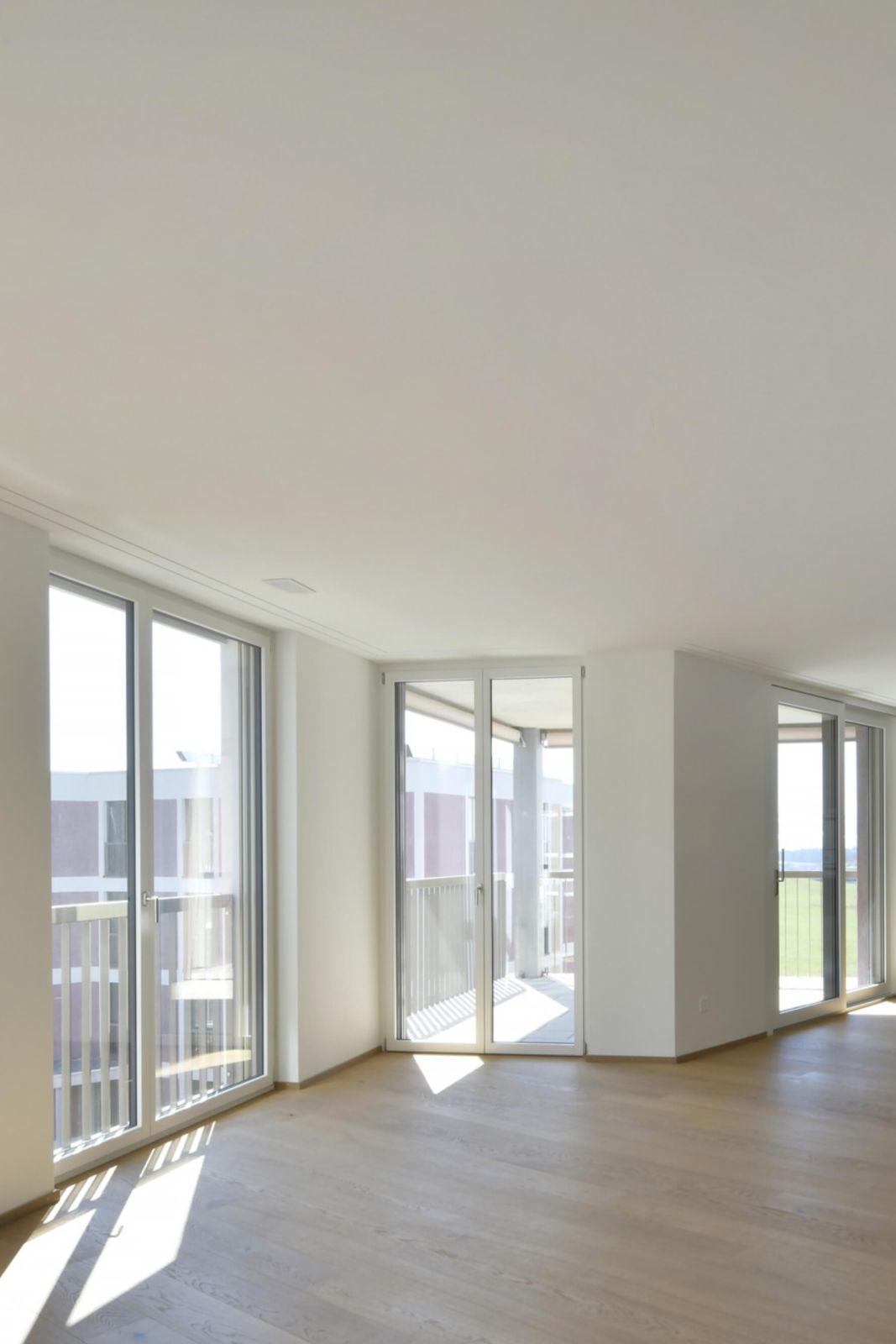 Die zueinander versetzten Punkthäuser mit insgesamt 22 Wohnungen haben ebenfalls eine gute Ausrichtung und Besonnung. Mehrheitlich weisen die Wohnungstypen einen grosszügigen Wohn-Essbereich auf. Nasszellen und Küchen sind in einem Kern zusammengefasst und ermöglichen so viel Flexibilität bei den individuellen Einteilungen der Zimmer.