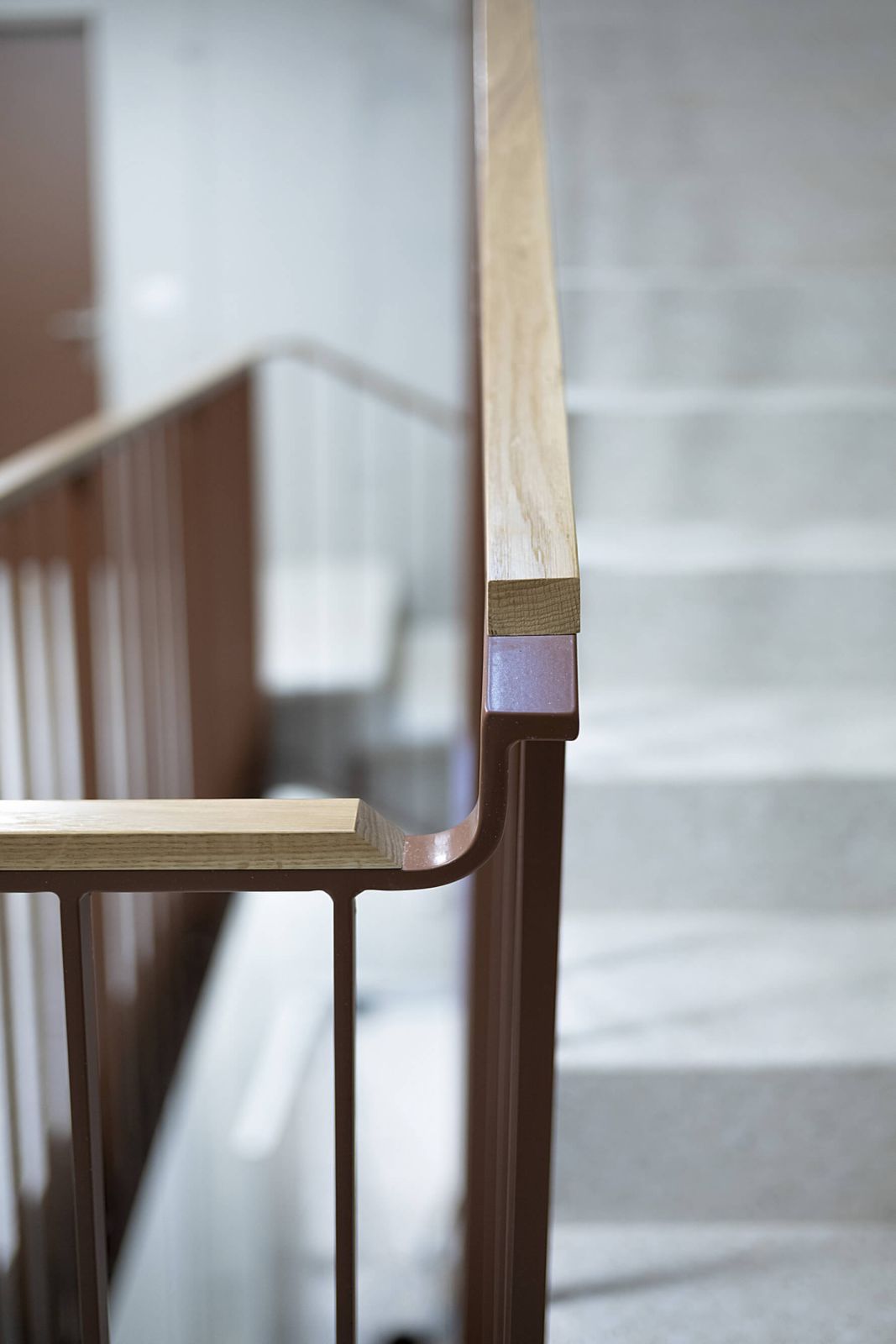 Die fünfgeschossige Zeile beherbergt 28 Wohnungen, welche über 2 Treppenhäuser erschlossen werden. Die Eckwohnungen wie auch die innenliegenden Ost-West-Wohnungen profitieren von mehreren Ausrichtungen und erhalten durch die gestaffelte Fassade eine zusätzliche Orientierung und Besonnung gegen Süden.