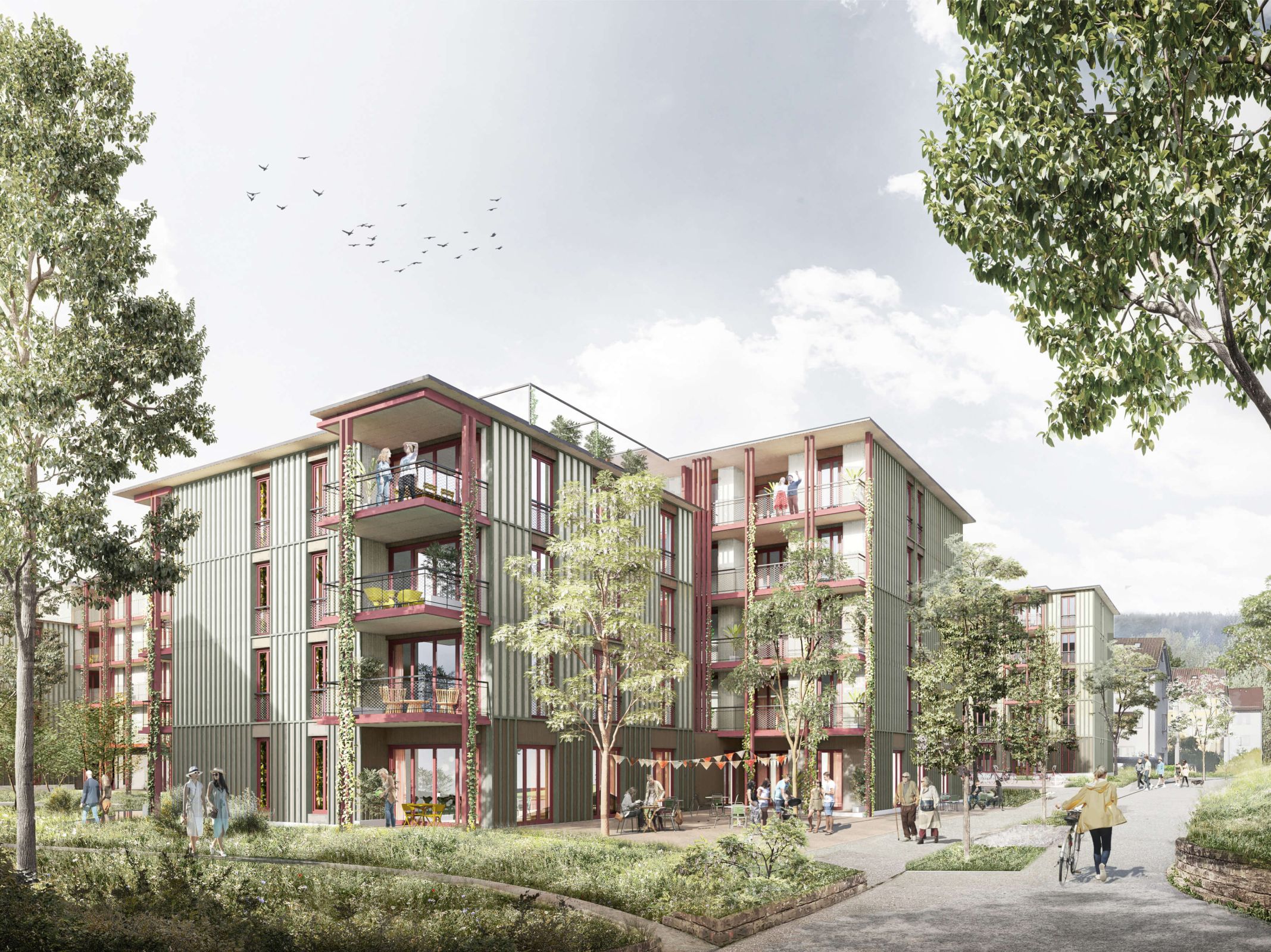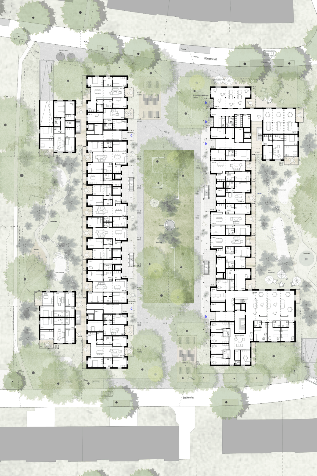 Die anspruchsvolle Aufgabe löst der Projektvorschlag auf sehr entspannte Art und Weise: Zwei fünfgeschossige Zeilen spannen einen grosszügigen Freiraum zwischen den Quartiersstrassen Im Heuried und Küngenmatt auf. Westlich und östlich erzeugen viergeschossige Kopfbauten einen angemessenen Übergang zur bestehenden Nachbarbebauung.