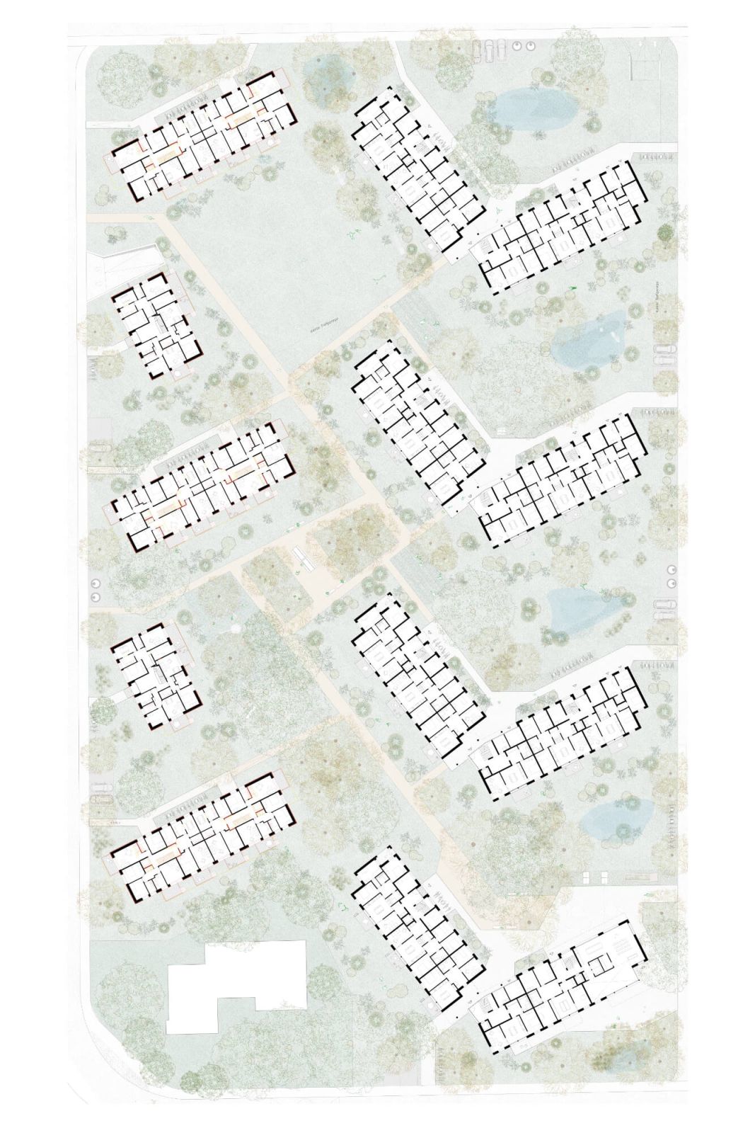 Die neuen winkelförmigen Bauten greifen die Ausrichtung und Körnung der bestehenden Zeilen auf und schreiben den ursprünglichen Städtebau weiter. In Kombination mit den sanierten und aufgestockten Bestandsbauten entsteht ein zusammenhängendes Ensemble, das sich selbstverständlich in den Kontext einfügt und gleichzeitig neue räumliche Bezüge schafft. Durch die präzise Setzung der Baukörper bleibt die Massstäblichkeit der Siedlung erhalten und wird behutsam weiterentwickelt.