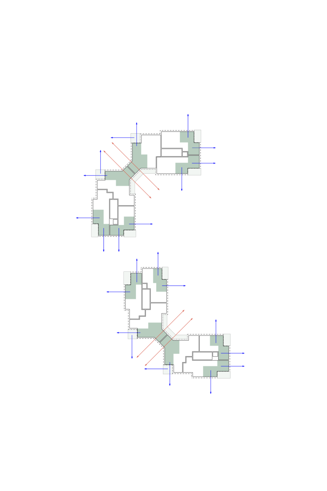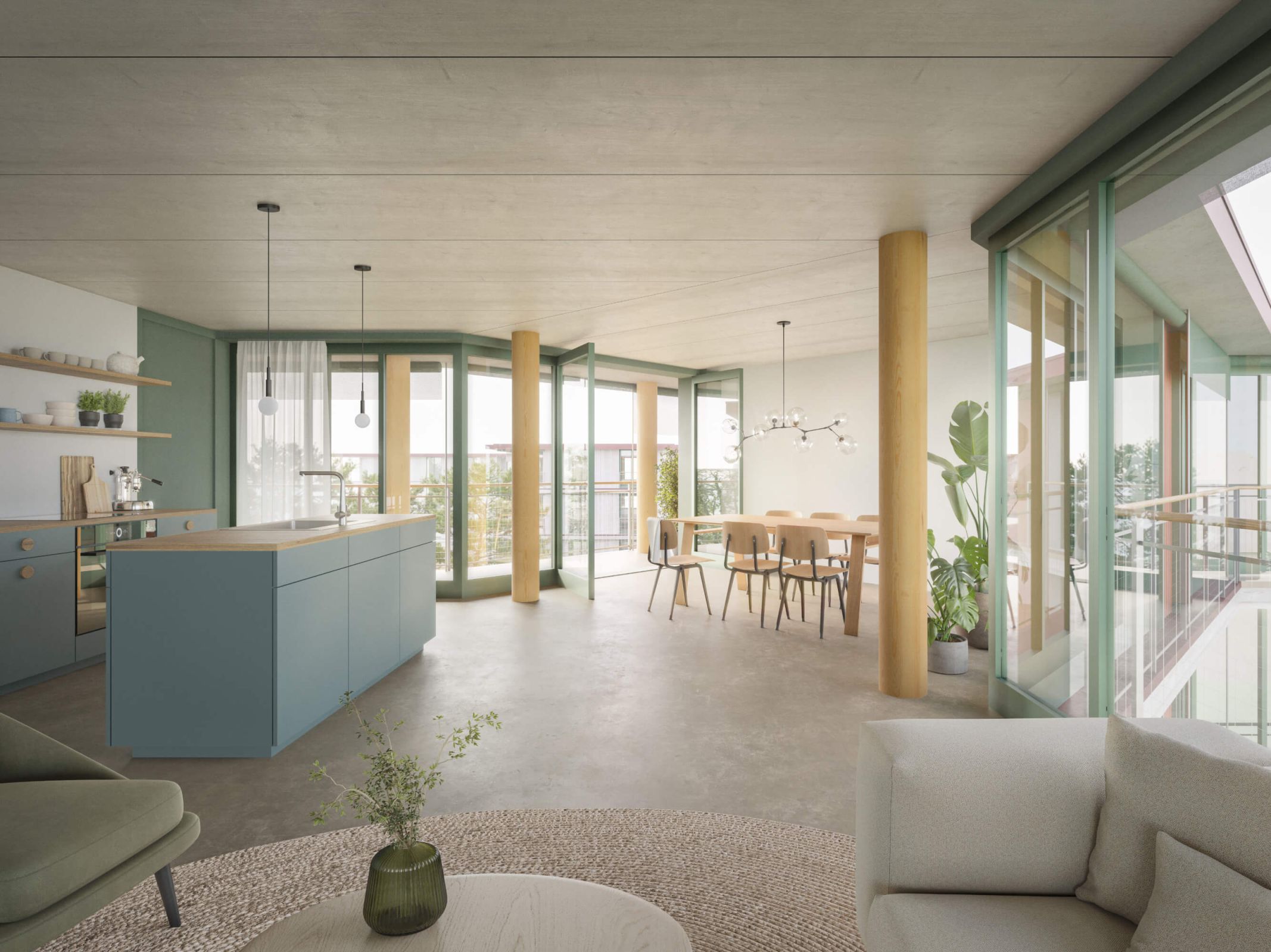 Die Grundrissstruktur der Wohnungen basiert auf klar gegliederten Raumfolgen, wobei mehrfach orientierte Wohnbereiche mit grosszügigen Aussenräumen kombiniert werden. Der Fokus liegt auf räumlicher Grosszügigkeit, funktionaler Organisation und hoher Wohnqualität.
