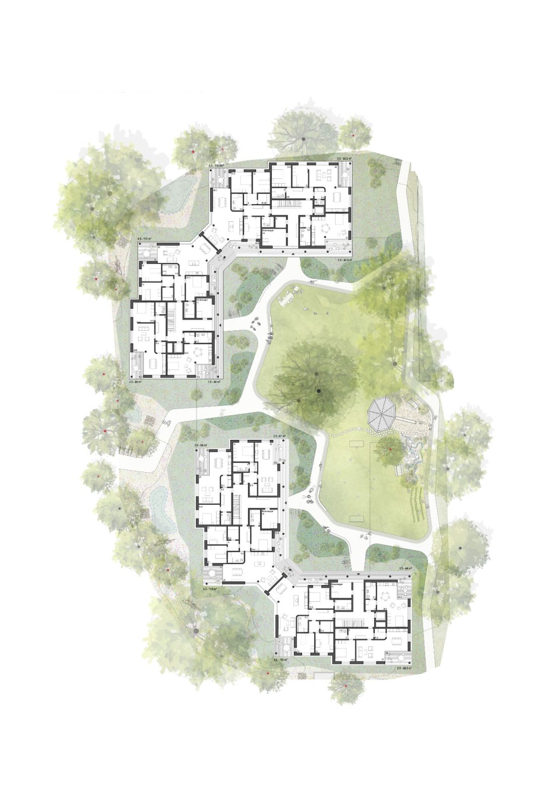 Das Projekt umfasst zwei fünfgeschossige Wohnbauten mit insgesamt 60 Einheiten. Die Setzung reagiert auf die bestehende Topografie, die Nachbarbauten und den erhaltenswerten Baumbestand. Zwei winkelförmige Baukörper fügen sich in die Parzellenstruktur ein und fassen einen verkehrsfreien, gemeinschaftlich nutzbaren Hofraum. Durch Rückstaffelungen an den Strassenecken entsteht eine feingliedrige Körnung, welche die Massstäblichkeit der Umgebung aufnimmt und gleichzeitig eine hohe Verdichtung ermöglicht.